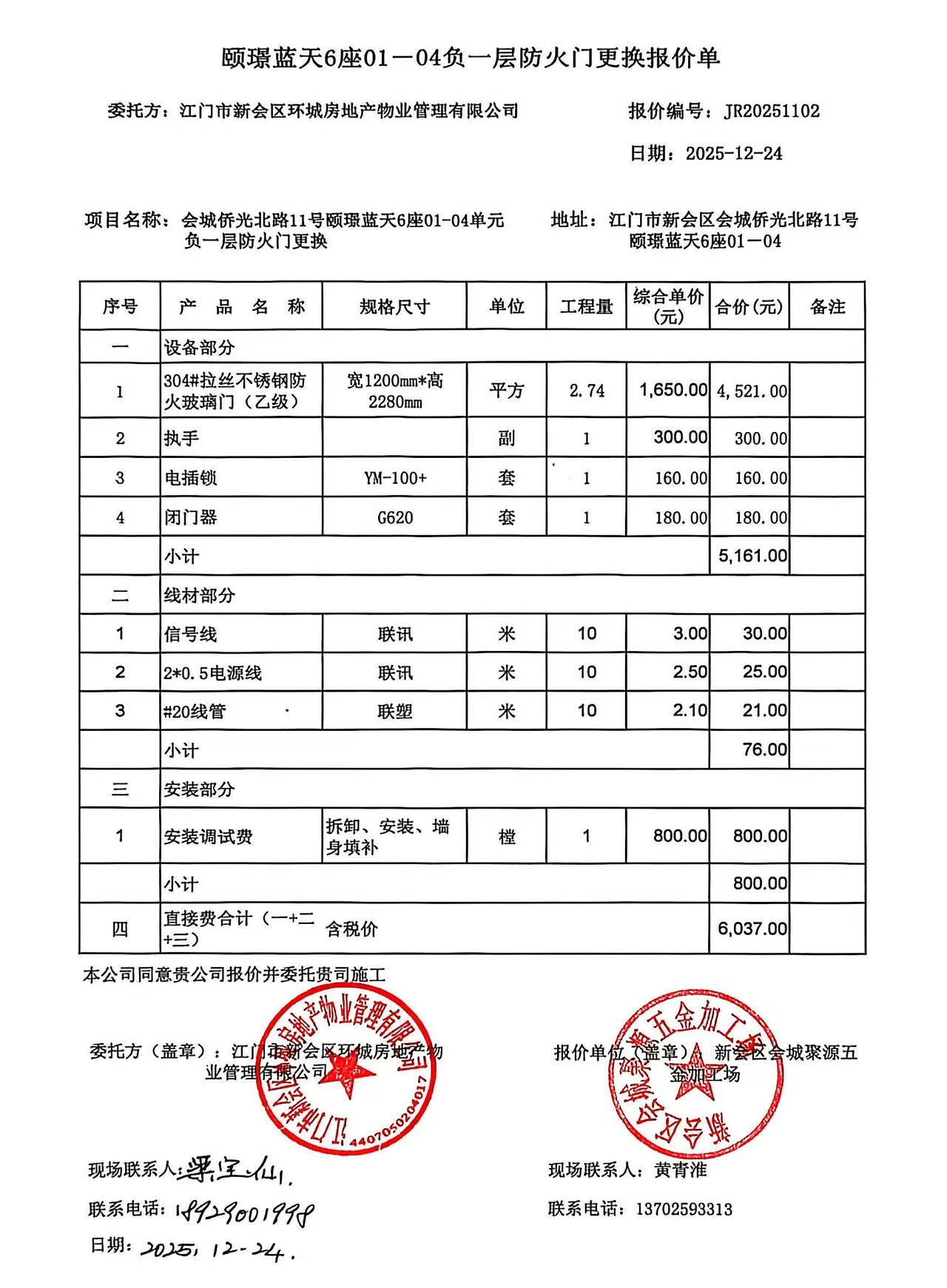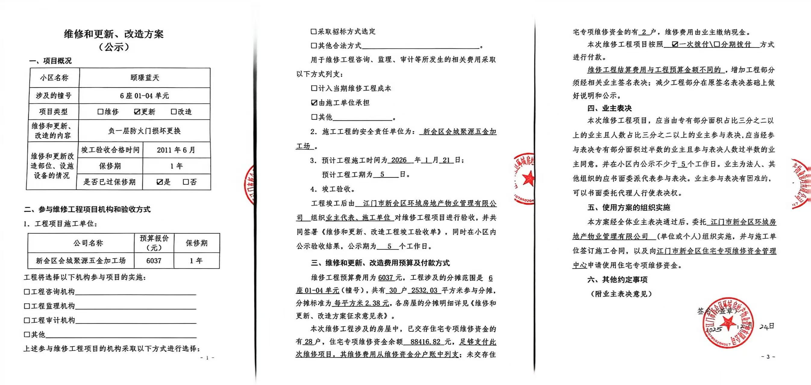 <td VALIGN="top" VALUES="" STYLE="border-width:0" BINDTYPE="0" ROWSPAN="19" COLSPAN="7" DATASOURCE="投票结果" ><font style="font-size:14pt;"><p style="white-space: normal; font-family: 宋体; line-height: 1.75em;">颐璟蓝天会城侨光北路11号颐璟蓝天6座全体业主:</p><p style="white-space: normal; font-family: 宋体; line-height: 1.75em; text-indent: 2em;">本小区关于会城侨光北路11号颐璟蓝天6座01-04单元负一层防火门更换使用维修资金的投票的投票已表决结束,询异时间从2026年03月05日开始,投票询异公示期间,业主可通过微信查询自己的表决情况或可凭身份证件申请查询自己的表决情况;如公示的业主表决情况与查询的本人表决意见不一致的,可以以书面形式向投票组织机构申诉,投票组织机构予以纠正并重新公示表决结果。异议提出人对投票组织机构的处理仍有异议的,可以向街道办事处(镇人民政府)反映处理,涉及住宅专项维修资金的,可向属地住宅专项维修资金管理中心反映处理。</p><p style="white-space: normal;"><br/></p><p style="white-space: normal; font-family: 宋体; line-height: 1.75em;"><strong>附件:</strong></p><p style="white-space: normal; font-family: 宋体; line-height: 1.75em;"><strong>一、投票范围</strong></p><p style="white-space: normal; font-family: 宋体; line-height: 1.75em; text-indent: 2em;">颐璟蓝天会城侨光北路11号颐璟蓝天6座</p><p style="white-space: normal; font-family: 宋体; line-height: 1.75em; text-indent: 2em;">总人数(专有部分人数之和):17</p><p style="white-space: normal; font-family: 宋体; line-height: 1.75em; text-indent: 2em;"><span style="font-family: 宋体, SimSun;"><span style="font-family: 宋体; text-indent: 32px;"><span style="font-family: 宋体; text-indent: 32px;">总户数:30</span></span></span></p><p style="white-space: normal; font-family: 宋体; line-height: 1.75em; text-indent: 2em;">建筑物总面积(专有部分面积之和):2532.03㎡</p><p style="white-space: normal; font-family: 宋体; line-height: 1.75em;"><strong>二、询异公示起止时间</strong></p><p dir="ltr" style="white-space: normal; font-family: 宋体; line-height: 1.75em; text-indent: 2em;"><span style="text-indent: 36px;">2026年03月05日至2026年03月12日</span></p><p style="white-space: normal; font-family: 宋体; line-height: 1.75em;"><strong>三、投票详细描述</strong></p><p style="white-space: normal; font-family: 宋体; line-height: 1.75em; text-indent: 2em;"><p>会城侨光北路11号颐璟蓝天6座01-04单元负一层防火门损坏严重。现需申请使用维修资金对6座01-04单元负一层防火门进行更换,工程维修预算金额为6037.00元,项目最终费用以施工合同签订金额为准。因已过保修期,维修费用由相关业主按建筑面积分摊,约2.38元每平方,详见公示附件。如业主手机不能正常通过微信投票,请联系物业公司进行线下纸质投票,物业公司联系电话:0750-6780780。</p></p><p style="white-space: normal; font-family: 宋体; line-height: 1.75em;"><strong>四、计票规则</strong></p><p style="white-space: normal; font-family: 宋体; line-height: 1.75em; text-indent: 2em;">表决事项:使用建筑物及其附属设施的维修资金<br /><p style='text-align: left; font-family: 宋体; font-size: 16px; line-height: 1.75em; text-indent: 2em;'>计票规则:弃权票不并入其它项 未表决票不并入其它项</p></p><p style="white-space: normal; font-family: 宋体; line-height: 1.75em;"><strong>五、通过规则</strong></p><p style="white-space: normal; font-family: 宋体; line-height: 1.75em;"><strong><strong style="white-space: normal;"><span style="font-family: 宋体, SimSun;"> 根据《中华人民共和国民法典》第二百七十八条规定:业主共同决定事项,应当由专有部分面积占比三分之二以上的业主且人数占比三分之二以上的业主参与表决。</span></strong></strong></p><p style="white-space: normal; font-family: 宋体; line-height: 1.75em; text-indent: 2em;">表决事项:使用建筑物及其附属设施的维修资金<br /><p style='text-align: left; font-family: 宋体; font-size: 16px; line-height: 1.75em; text-indent: 2em;'>通过规则:双2/3以上参与表决,参与表决双过半同意</p></p><p style="white-space: normal; font-family: 宋体; line-height: 1.75em;"><strong>六、投票结果</strong></p><p style="white-space: normal; font-family: 宋体; line-height: 1.75em; text-indent: 2em;"><div id='resultTable'><table style='table-layout: fixed; font-size:12px; margin-top:10px' width='100%' border='0' cellspacing='0' cellpadding='0'><tr><td height='28' colspan='10' align='center' style='border: 1px solid #666'><strong style='font-size: 14px;'> 使用建筑物及其附属设施的维修资金</strong></td> </tr><tr id='trfirst'><td height='28' colspan='4' style='border-left: 1px solid #666; border-bottom: 1px solid #666'><strong> 申报单位:</strong> 新会区环城房地产物业管理有限公司</td><td colspan='3' style='border-left: 1px solid #666; border-bottom: 1px solid #666'><strong> 联系方式:</strong> </td><td colspan='3' style='border-left: 1px solid #666; border-bottom: 1px solid #666; border-right: 1px solid #666'><strong> 申报日期:</strong> 2025年12月19日 </td></tr><tr> <td height='28' colspan='5' style='border-left: 1px solid #666; border-bottom: 1px solid #666'><strong> 总人数(专有部分人数之和):</strong>17人 </td><td colspan='5' style='border-left: 1px solid #666; border-bottom: 1px solid #666; border-right: 1px solid #666'><strong> 建筑物总面积(专有部分面积之和):</strong>2532.03㎡ </td> </tr><tr><td height='28' colspan='10' bgcolor='#F3F3F3' style='border-left: 1px solid #666;border-bottom: 1px solid #666;border-right: 1px solid #666'><strong> 参与人数及面积统计</strong></td></tr><tr><td height='28' cols