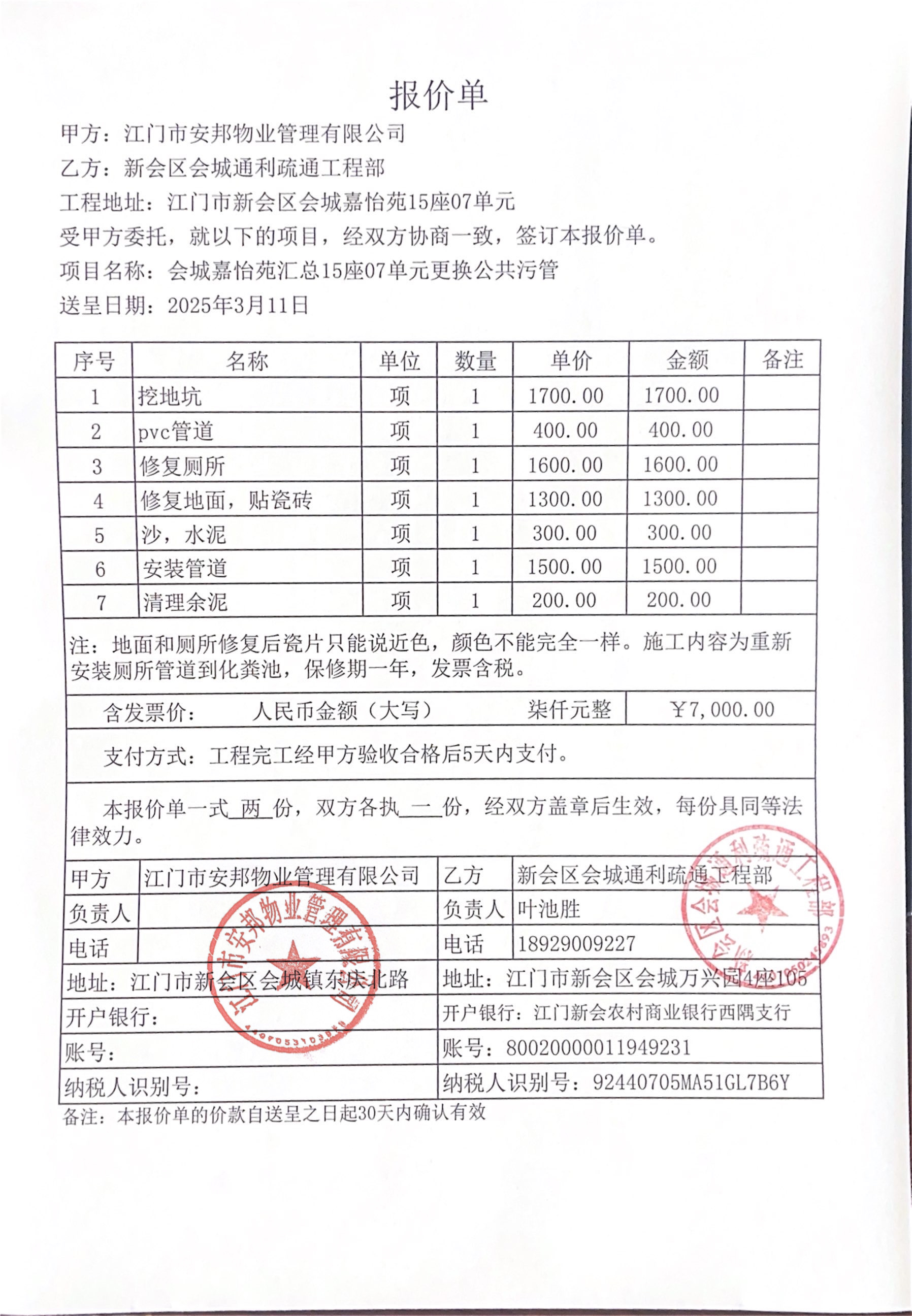 <td VALIGN="top" VALUES="" STYLE="border-width:0" BINDTYPE="0" ROWSPAN="19" COLSPAN="7" DATASOURCE="投票结果" ><font style="font-size:14pt;"><p style="white-space: normal; font-family: 宋体; line-height: 1.75em;">会城嘉怡苑汇总嘉怡苑15座全体业主:</p><p style="white-space: normal; font-family: 宋体; line-height: 1.75em; text-indent: 2em;">本小区关于会城嘉怡苑汇总15座07单元更换公共污管使用维修资金的投票的投票已表决结束,询异时间从2025年04月16日开始,投票询异公示期间,业主可通过微信查询自己的表决情况或可凭身份证件申请查询自己的表决情况;如公示的业主表决情况与查询的本人表决意见不一致的,可以以书面形式向投票组织机构申诉,投票组织机构予以纠正并重新公示表决结果。异议提出人对投票组织机构的处理仍有异议的,可以向街道办事处(镇人民政府)反映处理,涉及住宅专项维修资金的,可向属地住宅专项维修资金管理中心反映处理。</p><p style="white-space: normal;"><br/></p><p style="white-space: normal; font-family: 宋体; line-height: 1.75em;"><strong>附件:</strong></p><p style="white-space: normal; font-family: 宋体; line-height: 1.75em;"><strong>一、投票范围</strong></p><p style="white-space: normal; font-family: 宋体; line-height: 1.75em; text-indent: 2em;">会城嘉怡苑汇总嘉怡苑15座</p><p style="white-space: normal; font-family: 宋体; line-height: 1.75em; text-indent: 2em;">总人数(专有部分人数之和):7</p><p style="white-space: normal; font-family: 宋体; line-height: 1.75em; text-indent: 2em;"><span style="font-family: 宋体, SimSun;"><span style="font-family: 宋体; text-indent: 32px;"><span style="font-family: 宋体; text-indent: 32px;">总户数:7</span></span></span></p><p style="white-space: normal; font-family: 宋体; line-height: 1.75em; text-indent: 2em;">建筑物总面积(专有部分面积之和):586.25㎡</p><p style="white-space: normal; font-family: 宋体; line-height: 1.75em;"><strong>二、询异公示起止时间</strong></p><p dir="ltr" style="white-space: normal; font-family: 宋体; line-height: 1.75em; text-indent: 2em;"><span style="text-indent: 36px;">2025年04月16日至2025年04月26日</span></p><p style="white-space: normal; font-family: 宋体; line-height: 1.75em;"><strong>三、投票详细描述</strong></p><p style="white-space: normal; font-family: 宋体; line-height: 1.75em; text-indent: 2em;"><p>本小区15座07单元套间厕所公共污管堵塞倒灌,经检查,是因底下管道变形破损无法疏通,已过保修期。现需申请使用维修资金更换<span style="text-wrap-mode: wrap;">15座07单元的公共污管</span>,工程维修预算金额为7000.00元,项目最终费用以施工合同签订金额为准。维修费用的分摊标准为按分户分摊1000.00元/户,详见公示附件。如业主手机不能正常通过微信投票,请联系物业公司进行线下纸质投票,物业电话:13923073998。</p><p><br/></p></p><p style="white-space: normal; font-family: 宋体; line-height: 1.75em;"><strong>四、计票规则</strong></p><p style="white-space: normal; font-family: 宋体; line-height: 1.75em; text-indent: 2em;">表决事项:使用建筑物及其附属设施的维修资金<br /><p style='text-align: left; font-family: 宋体; font-size: 16px; line-height: 1.75em; text-indent: 2em;'>计票规则:弃权票不并入其它项 未表决票不并入其它项</p></p><p style="white-space: normal; font-family: 宋体; line-height: 1.75em;"><strong>五、通过规则</strong></p><p style="white-space: normal; font-family: 宋体; line-height: 1.75em;"><strong><strong style="white-space: normal;"><span style="font-family: 宋体, SimSun;"> 根据《中华人民共和国民法典》第二百七十八条规定:业主共同决定事项,应当由专有部分面积占比三分之二以上的业主且人数占比三分之二以上的业主参与表决。</span></strong></strong></p><p style="white-space: normal; font-family: 宋体; line-height: 1.75em; text-indent: 2em;">表决事项:使用建筑物及其附属设施的维修资金<br /><p style='text-align: left; font-family: 宋体; font-size: 16px; line-height: 1.75em; text-indent: 2em;'>通过规则:双2/3以上参与表决,参与表决双过半同意</p></p><p style="white-space: normal; font-family: 宋体; line-height: 1.75em;"><strong>六、投票结果</strong></p><p style="white-space: normal; font-family: 宋体; line-height: 1.75em; text-indent: 2em;"><div id='resultTable'><table style='table-layout: fixed; font-size:12px; margin-top:10px' width='100%' border='0' cellspacing='0' cellpadding='0'><tr><td height='28' colspan='10' align='center' style='border: 1px solid #666'><strong style='font-size: 14px;'> 使用建筑物及其附属设施的维修资金</strong></td> </tr><tr id='trfirst'><td height='28' colspan='4' style='border-left: 1px solid #666; border-bottom: 1px solid #666'><strong> 申报单位:</strong> 江门市安邦物业管理有限公司</td><td colspan='3' style='border-left: 1px solid #666; border-bottom: 1px solid #666'><strong> 联系方式:</strong> 13923073998 </td><td colspan='3' style='border-left: 1px solid #666; border-bottom: 1px solid #666; border-right: 1px solid #666'><strong> 申报日期:</strong> 2025年3月11日 </td></tr><tr> <td height='28' colspan='5' style='border-left: 1px solid #666; border-bottom: 1px solid #666'><strong> 总人数(专有部分人数之和):</strong>7人 </td><td colspan='5' style='border-left: 1px solid #666; border-bottom: 1px solid #666; border-right: 1px solid #666'><strong> 建筑物总面积(专有部分面积之和):</strong>586.25㎡ </td> </tr><tr><td height='28' colspan='10' bgcolor='#F3F3F3' style='border-left: 1px solid #666;border-bottom: 1px solid #666;border-right: 1px solid #666'><strong> 参与人数及面积统计</strong></td></tr><tr><td height='28' colspan='5' st