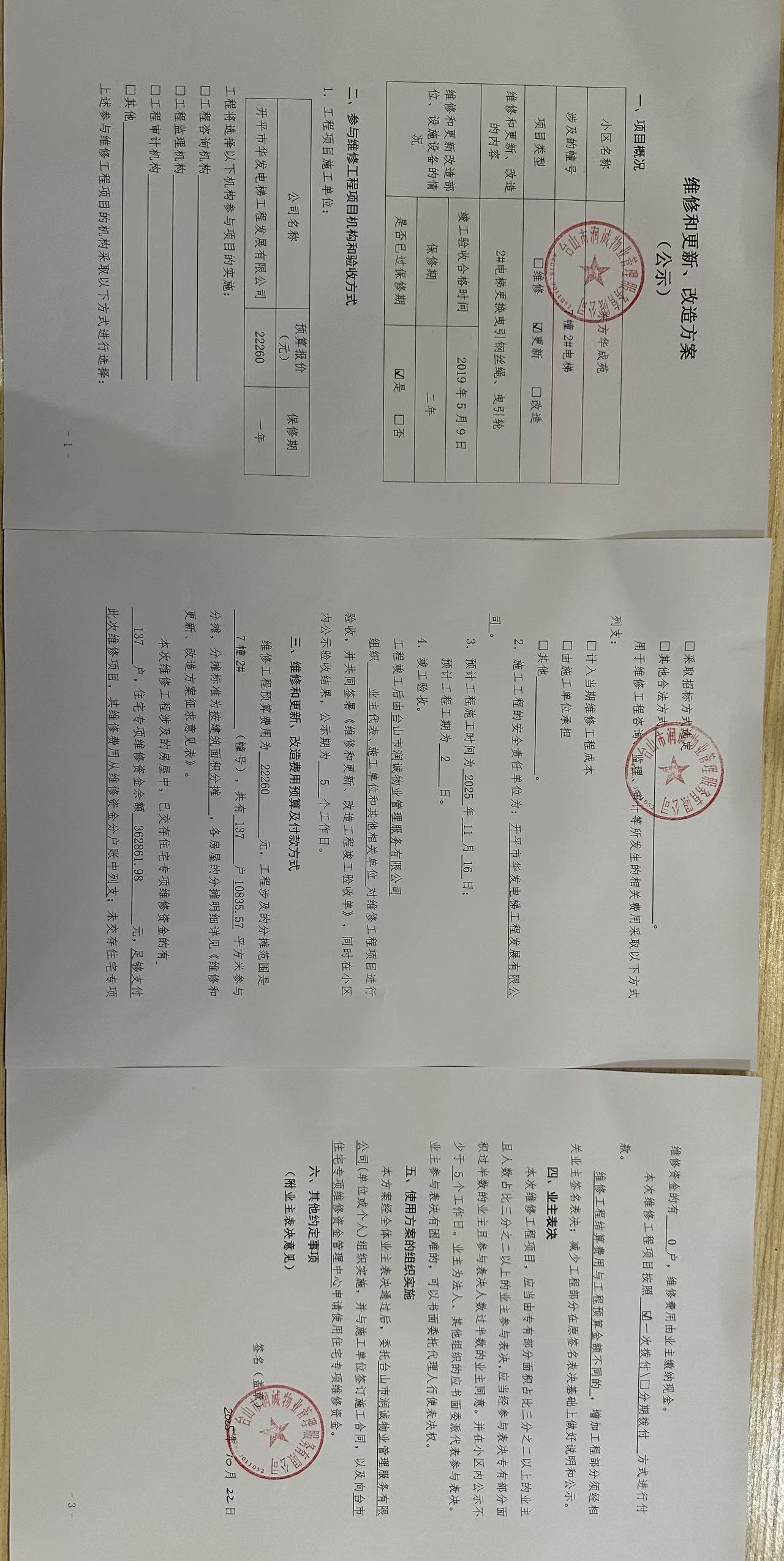 <td VALIGN="top" VALUES="" STYLE="border-width:0" BINDTYPE="0" ROWSPAN="18" COLSPAN="7" DATASOURCE="投票内容" ><font style="font-size:12pt;"><p style="text-align: left; font-family: 宋体; font-size: 16px; line-height: 1.75em;"><strong style="text-align: left; line-height: 1.75em;">一、投票范围</strong><br/></p><p style="white-space: normal; font-family: 宋体; font-size: 16px; line-height: 1.75em; text-indent: 2em;">台城东方华成苑东方华成苑7座</p><p style="white-space: normal; font-family: 宋体; font-size: 16px; line-height: 1.75em; text-indent: 2em;">总人数(专有部分人数之和):136</p><p style="white-space: normal; font-family: 宋体; font-size: 16px; line-height: 1.75em; text-indent: 2em;"><span style="font-family: 宋体; text-indent: 32px;">总户数:137</span></p><p style="white-space: normal; font-family: 宋体; font-size: 16px; line-height: 1.75em; text-indent: 2em;">建筑物总面积(专有部分面积之和):10835.57㎡</p><p style="white-space: normal; font-family: 宋体;font-size: 16px; line-height: 1.75em;"><strong>二、投票起止时间</strong></p><p style="white-space: normal; font-family: 宋体; line-height: 1.75em; text-indent: 2em;">投票表决时间:从2025年10月27日到2025年11月15日止</p><p style="white-space: normal; font-family: 宋体; line-height: 1.75em; text-indent: 2em;">投票补录时间:从2025年11月16日到2025年11月19日止</p><p style="white-space: normal; font-family: 宋体;font-size: 16px; line-height: 1.75em;"><strong>三、投票详细描述</strong></p><p style="white-space: normal; font-family: 宋体; font-size: 16px; line-height: 1.75em; text-indent: 2em;"><p style="margin-top: 5px;">小区7幢2#电梯日常运行时出现异常,经维保检查钢丝绳1条断股、其余4条钢丝绳也磨损严重,主机曳引轮绳槽磨损有深痕,不能正常运行。<br/></p><p style="margin-top: 5px;">现对7幢2#电梯,工程维修预算金额为22260元,项目最终费用以施工合同签订金额为准。因已过保修期,维修费用由相关业主按建筑面积分摊,每平方约2.05元,详见公示附件。如业主手机不能正常通过微信投票,请联系物业公司进行线下纸质投票,物业电话:0750-5555956</p></p><p style="white-space: normal; font-family: 宋体;font-size: 16px; line-height: 1.75em;"><strong>四、计票规则</strong></p><p style="white-space: normal; font-family: 宋体; font-size: 16px; line-height: 1.75em; text-indent: 2em;"><span style="font-family: 宋体; text-indent: 32px;">表决事项:使用建筑物及其附属设施的维修资金<br /><p style='text-align: left; font-family: 宋体; font-size: 16px; line-height: 1.75em; text-indent: 2em;'>计票规则:弃权票不并入其它项&nbsp;&nbsp;&nbsp;&nbsp;未表决票不并入其它项</p></span></p><p style="white-space: normal; font-family: 宋体;font-size: 16px; line-height: 1.75em;"><strong>五、通过规则</strong></p><p style="white-space: normal; font-family: 宋体;font-size: 16px; line-height: 1.75em;"><strong>&nbsp; 根据《中华人民共和国民法典》第二百七十八条规定:业主共同决定事项,应当由专有部分面积占比三分之二以上的业主且人数占比三分之二以上的业主参与表决。</strong></p><p style="white-space: normal; font-family: 宋体; font-size: 16px; line-height: 1.75em; text-indent: 2em;"><span style="font-family: 宋体; text-indent: 32px;">表决事项:使用建筑物及其附属设施的维修资金<br /><p style='text-align: left; font-family: 宋体; font-size: 16px; line-height: 1.75em; text-indent: 2em;'>通过规则:双2/3以上参与表决,参与表决双过半同意</p></span><span style="font-family: 宋体; text-indent: 32px;"></span></p><p style="text-align: left; font-family: 宋体; font-size: 16px; line-height: 1.75em;"><strong>六、投票方式</strong></p><p style="text-align: left; font-family: 宋体; font-size: 16px; line-height: 1.75em; text-indent: 2em;"><span style="font-size: 16px; font-family: 宋体">在投票事项通知公告日起,请业主扫描二维码或者关注微信公众号(<strong>江门住建</strong>)查看详细情况并进行投票。</span></p><p style="text-align: center; font-family: 宋体; font-size: 16px; line-height: 1.75em; text-indent: 2em;"><span style="font-size: 16px; font-family: 宋体"><strong style="font-family: 宋体; text-align: center; white-space: normal; line-height: 1.75em;"><img src="http://jmzjj.jiangmen.cn:8071/Areas/Custom/Content/images/jmzjybs.jpg"/></strong></span></p><p style="text-align: right; font-family: 宋体; font-size: 16px; line-height: 1.75em; text-indent: 2em;"><span style="text-align: right;">申报单位(盖章):台山市润诚物业管理服务有限公司</span></p><p style="text-align: right; font-family: 宋体; font-size: 16px; line-height: 1.75em;">2025年10月27日</p></font></td>