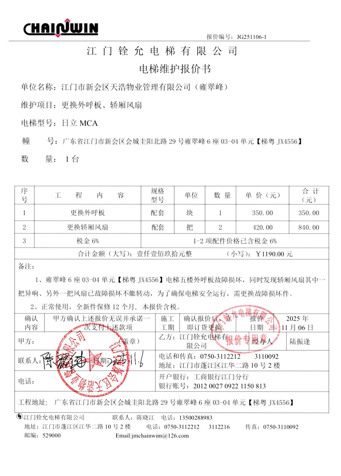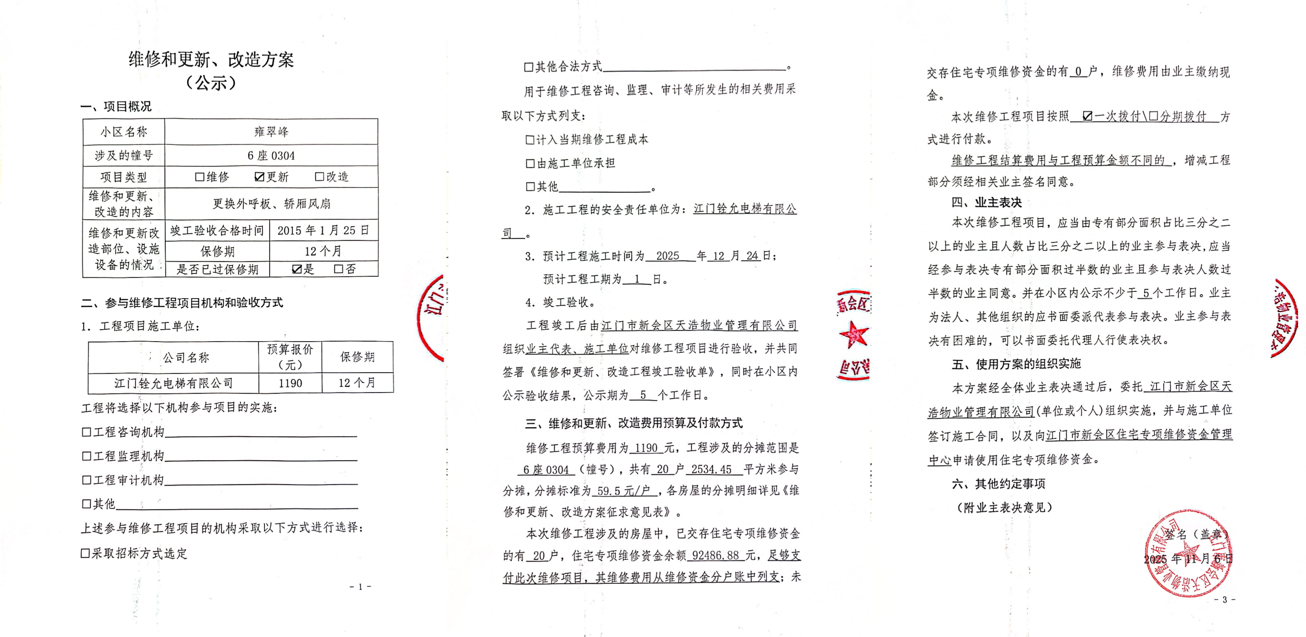 <td VALIGN="top" VALUES="" STYLE="border-width:0" BINDTYPE="0" ROWSPAN="19" COLSPAN="7" DATASOURCE="投票结果" ><font style="font-size:14pt;"><p style="white-space: normal; font-family: 宋体; line-height: 1.75em;">雍翠峰雍翠峰6座全体业主:</p><p style="white-space: normal; font-family: 宋体; line-height: 1.75em; text-indent: 2em;">本小区关于雍翠峰6座0304单元电梯【梯粤JX4556】更换外呼板和轿厢风扇使用维修资金的投票的投票已表决结束,询异时间从2025年11月07日开始,投票询异公示期间,业主可通过微信查询自己的表决情况或可凭身份证件申请查询自己的表决情况;如公示的业主表决情况与查询的本人表决意见不一致的,可以以书面形式向投票组织机构申诉,投票组织机构予以纠正并重新公示表决结果。异议提出人对投票组织机构的处理仍有异议的,可以向街道办事处(镇人民政府)反映处理,涉及住宅专项维修资金的,可向属地住宅专项维修资金管理中心反映处理。</p><p style="white-space: normal;"><br/></p><p style="white-space: normal; font-family: 宋体; line-height: 1.75em;"><strong>附件:</strong></p><p style="white-space: normal; font-family: 宋体; line-height: 1.75em;"><strong>一、投票范围</strong></p><p style="white-space: normal; font-family: 宋体; line-height: 1.75em; text-indent: 2em;">雍翠峰雍翠峰6座</p><p style="white-space: normal; font-family: 宋体; line-height: 1.75em; text-indent: 2em;">总人数(专有部分人数之和):20</p><p style="white-space: normal; font-family: 宋体; line-height: 1.75em; text-indent: 2em;"><span style="font-family: 宋体, SimSun;"><span style="font-family: 宋体; text-indent: 32px;"><span style="font-family: 宋体; text-indent: 32px;">总户数:20</span></span></span></p><p style="white-space: normal; font-family: 宋体; line-height: 1.75em; text-indent: 2em;">建筑物总面积(专有部分面积之和):2534.45㎡</p><p style="white-space: normal; font-family: 宋体; line-height: 1.75em;"><strong>二、询异公示起止时间</strong></p><p dir="ltr" style="white-space: normal; font-family: 宋体; line-height: 1.75em; text-indent: 2em;"><span style="text-indent: 36px;">2025年11月07日至2025年11月17日</span></p><p style="white-space: normal; font-family: 宋体; line-height: 1.75em;"><strong>三、投票详细描述</strong></p><p style="white-space: normal; font-family: 宋体; line-height: 1.75em; text-indent: 2em;"><p> 雍翠峰6座0304单元电梯【梯粤JX4556】上报5楼外呼板失灵,电梯不能运行,经检查确认为电梯5楼外呼板故障损坏,同时发现轿厢其中一把风扇存在异响,另外一把风扇损坏已不能正常转动,以上配件日常使用自然损坏,已过保修期。</p><p> 现需申请使用维修资金对6座0304单元电梯【梯粤JX4556】进行维修,工程维修预算金额为1190元,项目最终费用以施工合同签订金额为准。维修费用的分摊标准为按分户分摊,每户分摊59.5元,详见公示附件。如业主不能正常通过微信投票,请联系物业公司进行线下纸质投票,物业电话:0750-6125500</p><p><br/></p></p><p style="white-space: normal; font-family: 宋体; line-height: 1.75em;"><strong>四、计票规则</strong></p><p style="white-space: normal; font-family: 宋体; line-height: 1.75em; text-indent: 2em;">表决事项:使用建筑物及其附属设施的维修资金<br /><p style='text-align: left; font-family: 宋体; font-size: 16px; line-height: 1.75em; text-indent: 2em;'>计票规则:弃权票不并入其它项 未表决票不并入其它项</p></p><p style="white-space: normal; font-family: 宋体; line-height: 1.75em;"><strong>五、通过规则</strong></p><p style="white-space: normal; font-family: 宋体; line-height: 1.75em;"><strong><strong style="white-space: normal;"><span style="font-family: 宋体, SimSun;"> 根据《中华人民共和国民法典》第二百七十八条规定:业主共同决定事项,应当由专有部分面积占比三分之二以上的业主且人数占比三分之二以上的业主参与表决。</span></strong></strong></p><p style="white-space: normal; font-family: 宋体; line-height: 1.75em; text-indent: 2em;">表决事项:使用建筑物及其附属设施的维修资金<br /><p style='text-align: left; font-family: 宋体; font-size: 16px; line-height: 1.75em; text-indent: 2em;'>通过规则:双2/3以上参与表决,参与表决双过半同意</p></p><p style="white-space: normal; font-family: 宋体; line-height: 1.75em;"><strong>六、投票结果</strong></p><p style="white-space: normal; font-family: 宋体; line-height: 1.75em; text-indent: 2em;"><div id='resultTable'><table style='table-layout: fixed; font-size:12px; margin-top:10px' width='100%' border='0' cellspacing='0' cellpadding='0'><tr><td height='28' colspan='10' align='center' style='border: 1px solid #666'><strong style='font-size: 14px;'> 使用建筑物及其附属设施的维修资金</strong></td> </tr><tr id='trfirst'><td height='28' colspan='4' style='border-left: 1px solid #666; border-bottom: 1px solid #666'><strong> 申报单位:</strong> 江门市新会区天浩物业管理有限公司</td><td colspan='3' style='border-left: 1px solid #666; border-bottom: 1px solid #666'><strong> 联系方式:</strong> </td><td colspan='3' style='border-left: 1px solid #666; border-bottom: 1px solid #666; border-right: 1px solid #666'><strong> 申报日期:</strong> 2025年11月6日 </td></tr><tr> <td height='28' colspan='5' style='border-left: 1px solid #666; border-bottom: 1px solid #666'><strong> 总人数(专有部分人数之和):</strong>20人 </td><td colspan='5' style='border-left: 1px solid #666; border-bottom: 1px solid #666; border-right: 1px solid #666'><strong> 建筑物总面积(专有部分面积之和):</strong>2534.45㎡ </td> </tr><tr><td height='28' colspan='10' bgcolor='#F3F3F3' style='border-left: 1px solid #666;border