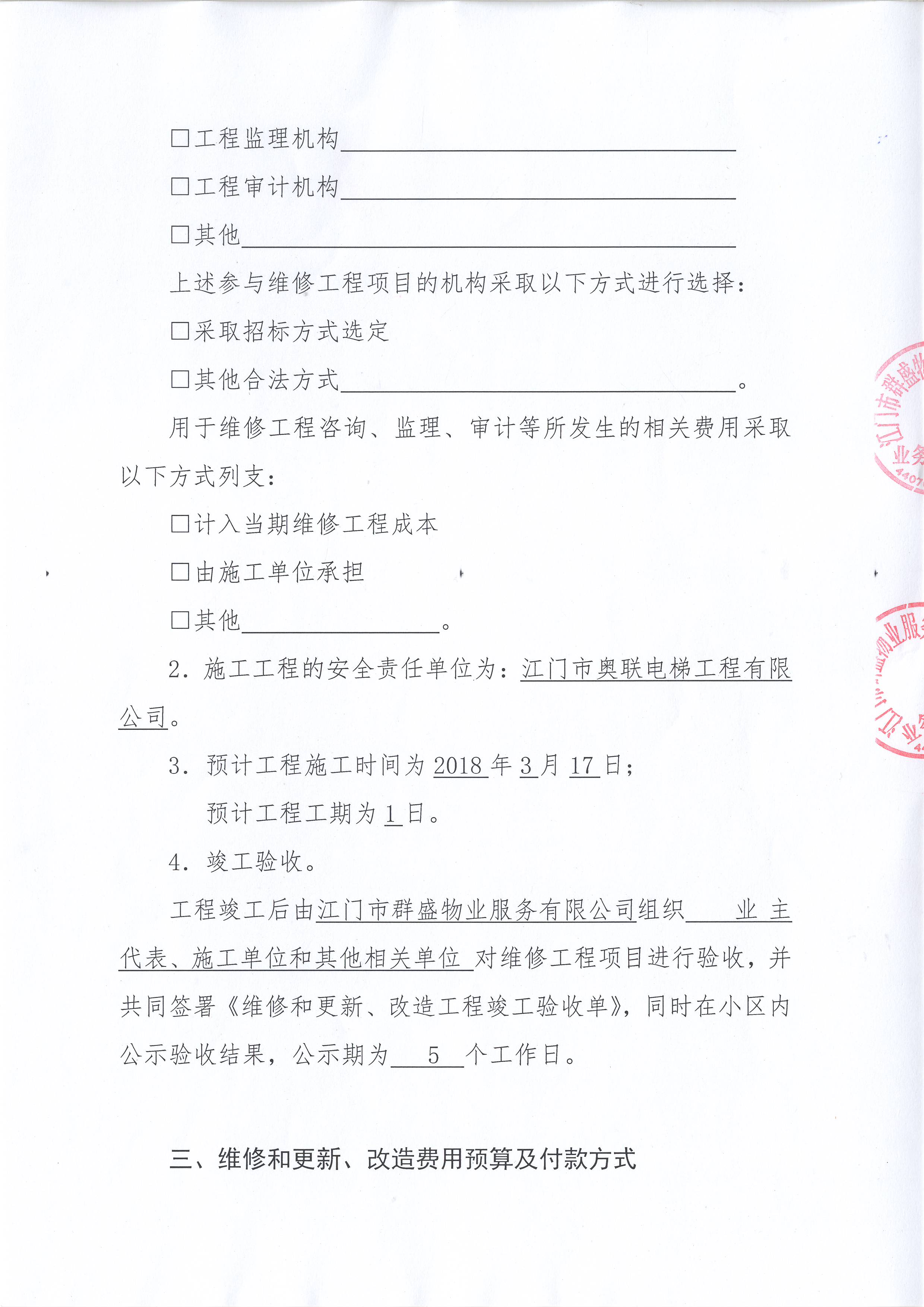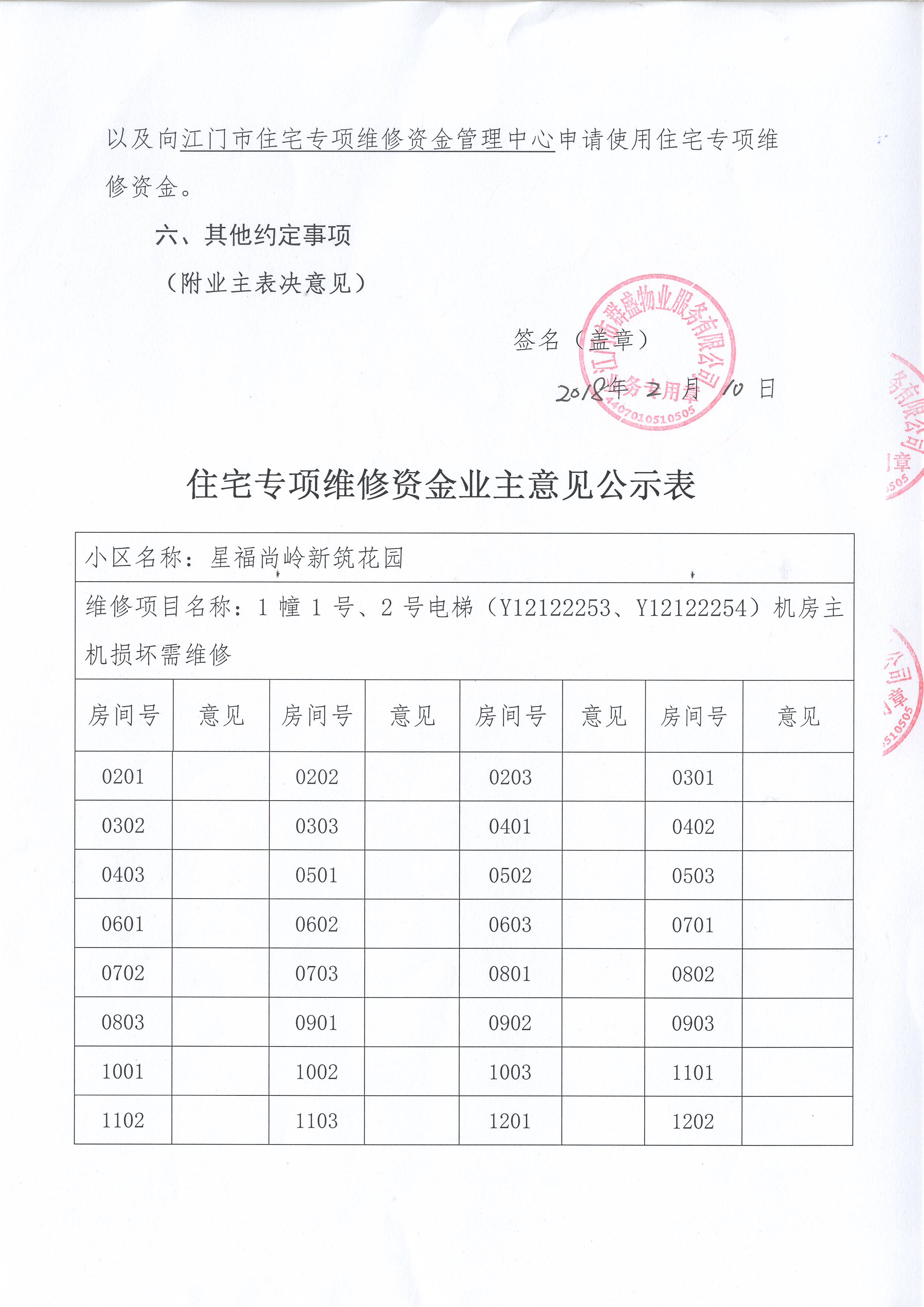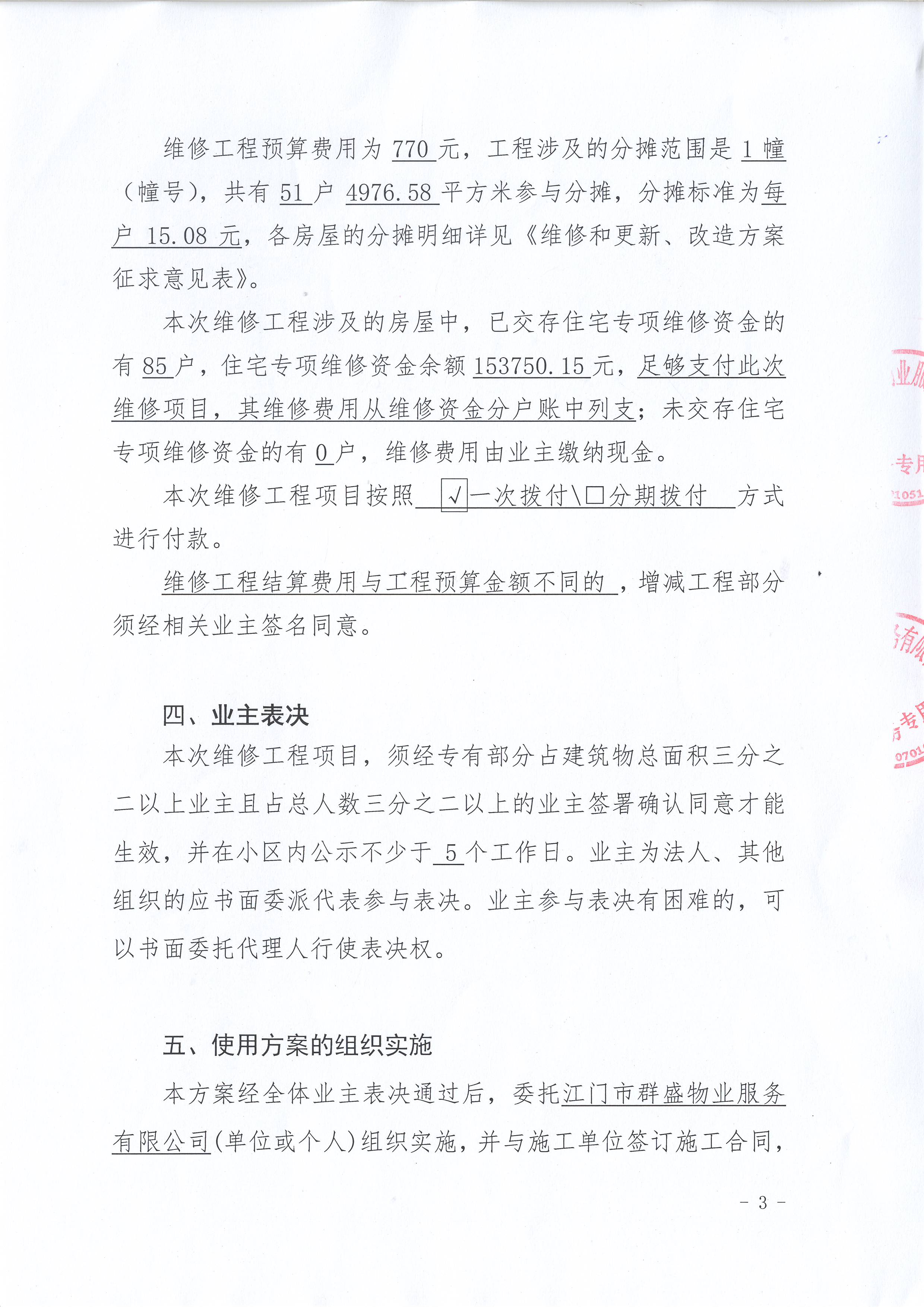四、法律效力 本次表决的所有事项符合相关法律法规的规定,对业主有约束力,公告期结束,由申报单位完成后续工作。 申报单位:江门市群盛物业服务有限公司 |