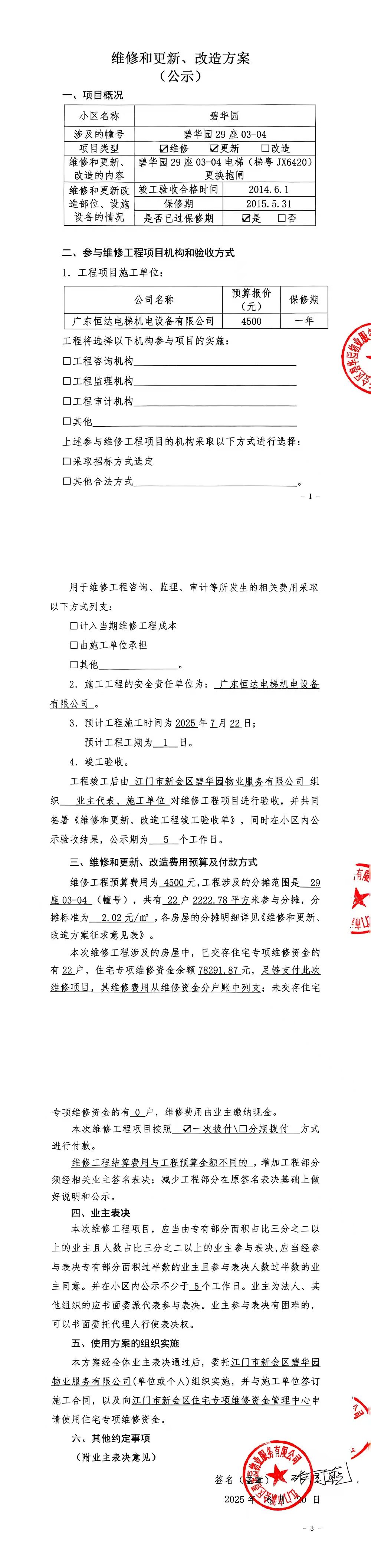 <td VALIGN="top" VALUES="" STYLE="border-width:0" BINDTYPE="0" ROWSPAN="17" COLSPAN="7" DATASOURCE="投票结果" ><font style=" font-family:方正小标宋简体;font-size:14pt;"><p style="line-height: 1.75em;"><span style="font-family: 宋体, SimSun;">各位尊敬的业主:</span><br/></p><p style="text-indent: 2em; line-height: 1.75em;"><span style="font-family: 宋体, SimSun;">根据法律法规的规定,本小区业主利用“江门市物业事项表决管理系统”已对本小区公共事务决策事项(<span style="font-family: 宋体; text-indent: 32px;">碧华园29座03-04电梯(梯粤JX6420)更换抱闸使用维修资金的投票</span>)进行了表决,在经过7日的询异公示期后,未收到业主有效的异议。现将投票结果公告,并就产生的法律效力说明如下:</span></p><p style="line-height: 1.75em; text-indent: 0em;"><strong style="text-indent: 2em;"><span style="font-family: 宋体, SimSun;">一、投票范围</span></strong></p><p style="text-indent: 2em; line-height: 1.75em;"><span style="font-family: 宋体, SimSun;">碧华园碧华园29座</span></p><p style="text-indent: 2em; line-height: 1.75em;"><span style="font-family: 宋体, SimSun;">总人数(专有部分人数之和):22</span></p><p style="text-indent: 2em; line-height: 1.75em;"><span style="font-family: 宋体, SimSun;"><span style="font-family: 宋体, SimSun; text-indent: 32px;"><span style="font-family: 宋体; text-indent: 32px;"><span style="font-family: 宋体; text-indent: 32px;">总户数:22</span></span></span></span></p><p style="text-indent: 2em; line-height: 1.75em;"><span style="font-family: 宋体, SimSun;">建筑物总面积(专有部分面积之和):2222.78㎡</span></p><p style="line-height: 1.75em;"><strong><span style="font-family: 宋体, SimSun;">二、投票结果公告时间</span></strong></p><p style="text-indent: 2em; line-height: 1.75em;"><span style="font-family: 宋体, SimSun;"><span style="font-family: 宋体, SimSun; text-indent: 32px;">从2025年07月18日开始</span></span></p><p style="line-height: 1.75em;"><strong><span style="font-family: 宋体, SimSun;">三、计票规则</span></strong></p><p style="text-indent: 2em; line-height: 1.75em;"><span style="font-family: 宋体, SimSun;">表决事项:使用建筑物及其附属设施的维修资金<br /><p style='font-family: 宋体, SimSun;line-height: 1.75em; text-indent: 2em;'>计票规则:弃权票不并入其它项&nbsp;&nbsp;&nbsp;&nbsp;未表决票不并入其它项</p></span></p><p style="line-height: 1.75em;"><strong><span style="font-family: 宋体, SimSun;">四、通过规则</span></strong></p><p style="line-height: 1.75em;"><strong><span style="font-family: 宋体, SimSun;">&nbsp; 根据《中华人民共和国民法典》第二百七十八条规定:业主共同决定事项,应当由专有部分面积占比三分之二以上的业主且人数占比三分之二以上的业主参与表决。</span></strong></p><p style="text-indent: 2em; line-height: 1.75em;"><span style="font-family: 宋体, SimSun;"><span style="font-family: 宋体, SimSun; text-indent: 32px;">表决事项:使用建筑物及其附属设施的维修资金<br /><p style='font-family: 宋体, SimSun;line-height: 1.75em; text-indent: 2em;'>通过规则:双2/3以上参与表决,参与表决双过半同意</p></span></span></p><p style="line-height: 1.75em;"><strong><span style="font-family: 宋体, SimSun;">五、投票结果</span></strong></p><p style="line-height: 1.75em; text-indent: 2em;"><span style="font-family: 宋体, SimSun; text-indent: 2em;"><div id='resultTable'><table style='table-layout: fixed; font-size:12px; margin-top:10px' width='100%' border='0' cellspacing='0' cellpadding='0'><tr><td height='28' colspan='10' align='center' style='border: 1px solid #666'><strong style='font-size: 14px;'> 使用建筑物及其附属设施的维修资金</strong></td> </tr><tr id='trfirst'><td height='28' colspan='4' style='border-left: 1px solid #666; border-bottom: 1px solid #666'><strong>&nbsp;申报单位:</strong> 江门市新会区碧华园物业服务有限公司</td><td colspan='3' style='border-left: 1px solid #666; border-bottom: 1px solid #666'><strong>&nbsp;联系方式:</strong> 6329973 </td><td colspan='3' style='border-left: 1px solid #666; border-bottom: 1px solid #666; border-right: 1px solid #666'><strong>&nbsp;申报日期:</strong> 2025年6月23日 </td></tr><tr> <td height='28' colspan='5' style='border-left: 1px solid #666; border-bottom: 1px solid #666'><strong>&nbsp;列支总人数(专有部分人数之和):</strong>22人 </td><td colspan='5' style='border-left: 1px solid #666; border-bottom: 1px solid #666; border-right: 1px solid #666'><strong>&nbsp;列支建筑物总面积(专有部分面积之和):</strong>2222.78㎡ </td> </tr><tr><td height='28' colspan='10' bgcolor='#F3F3F3' style='border-left: 1px solid #666;border-bottom: 1px solid #666;border-right: 1px solid #666'><strong>&nbsp;参与表决人数及面积统计</strong></td></tr><tr><td height='28' colspan='5' style='border-left: 1px solid #666; border-bottom: 1px solid #666'><strong>&nbsp;参与表决人数:</strong>17人</td><td colspan='5' style='border-left: 1px solid #666; border-bottom: 1px solid #666; border-right: 1px solid #666'><strong>&nbsp;参与表决人数占总人数比例:</strong>77.27%</td></tr><tr><td height='28' colspan='5' style='border-left: 1px solid #666; border-bottom: 1px solid #666'><strong>&nbsp;参与表决面积:</strong>1763.46㎡</td><td colspan='5' style='border-left: 1px solid #666; border-bottom: 1px solid #666; border-right: 1px solid #666'><strong>&nbsp;参与表决面积占总面积比例:</strong>79.34%</td></tr><tr><td height='28' colspan='10' bgcolor='#F3F3F3' style='border-left: 1px solid #666; border-bottom: 1px solid #666;border-right: 1px solid #666'> <strong>&nbsp;参与表决同意人数及面积统计</strong></td> </tr><tr><td height='28' colspan='5' style='border-left: 1px solid #666; borde
