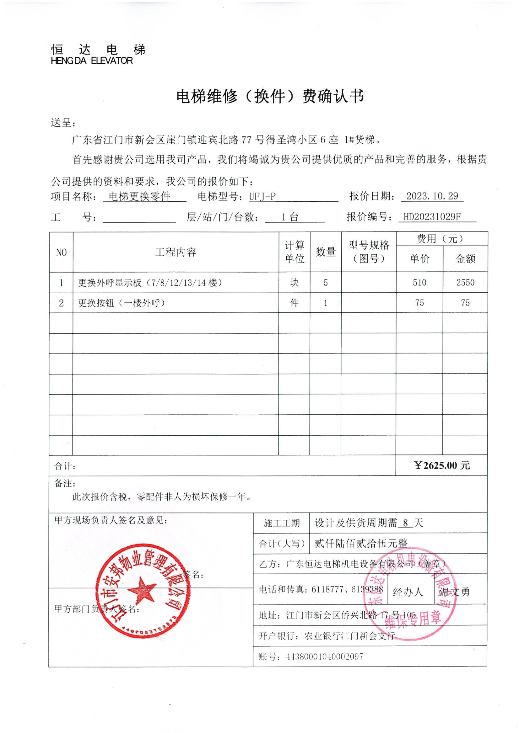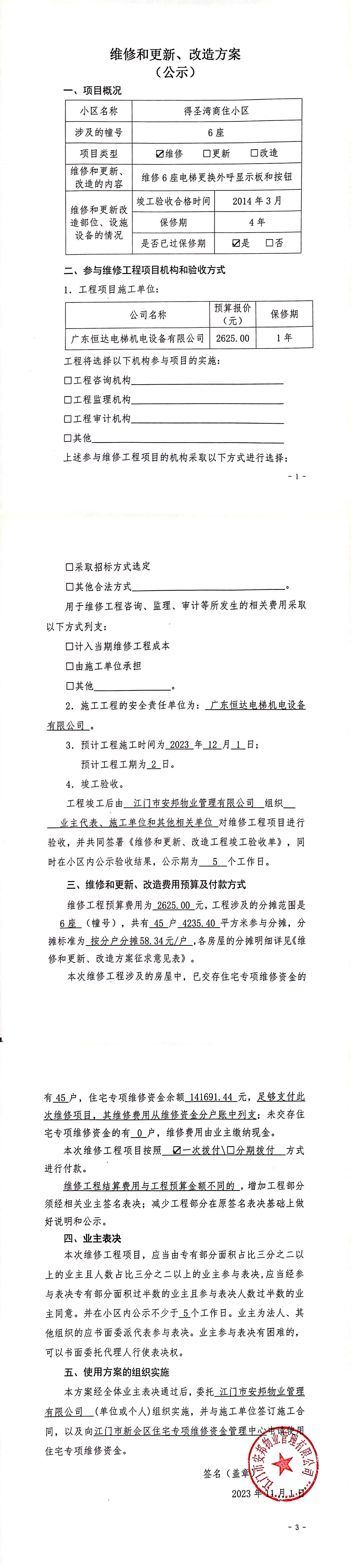 <td VALIGN="top" VALUES="" STYLE="border-width:0" BINDTYPE="0" ROWSPAN="19" COLSPAN="7" DATASOURCE="投票结果" ><font style="font-size:14pt;"><p style="white-space: normal; font-family: 宋体; line-height: 1.75em;">得圣湾商住小区得圣湾6座全体业主:</p><p style="white-space: normal; font-family: 宋体; line-height: 1.75em; text-indent: 2em;">本小区关于得圣湾商住小区6座电梯更换外呼显示板和按钮使用维修资金的投票的投票已表决结束,询异时间从2023年12月07日开始,投票询异公示期间,业主可通过微信查询自己的表决情况或可凭身份证件申请查询自己的表决情况;如公示的业主表决情况与查询的本人表决意见不一致的,可以以书面形式向投票组织机构申诉,投票组织机构予以纠正并重新公示表决结果。异议提出人对投票组织机构的处理仍有异议的,可以向街道办事处(镇人民政府)反映处理,涉及住宅专项维修资金的,可向属地住宅专项维修资金管理中心反映处理。</p><p style="white-space: normal;"><br/></p><p style="white-space: normal; font-family: 宋体; line-height: 1.75em;"><strong>附件:</strong></p><p style="white-space: normal; font-family: 宋体; line-height: 1.75em;"><strong>一、投票范围</strong></p><p style="white-space: normal; font-family: 宋体; line-height: 1.75em; text-indent: 2em;">得圣湾商住小区得圣湾6座</p><p style="white-space: normal; font-family: 宋体; line-height: 1.75em; text-indent: 2em;">总人数(专有部分人数之和):45</p><p style="white-space: normal; font-family: 宋体; line-height: 1.75em; text-indent: 2em;"><span style="font-family: 宋体, SimSun;">总户数:45</span></p><p style="white-space: normal; font-family: 宋体; line-height: 1.75em; text-indent: 2em;">建筑物总面积(专有部分面积之和):4235.40㎡</p><p style="white-space: normal; font-family: 宋体; line-height: 1.75em;"><strong>二、询异公示起止时间</strong></p><p dir="ltr" style="white-space: normal; font-family: 宋体; line-height: 1.75em; text-indent: 2em;"><span style="text-indent: 36px;">2023年12月07日至2023年12月13日</span></p><p style="white-space: normal; font-family: 宋体; line-height: 1.75em;"><strong>三、投票详细描述</strong></p><p style="white-space: normal; font-family: 宋体; line-height: 1.75em; text-indent: 2em;"><p>本小区6座的电梯出现故障,经检查,是由于外呼显示板和一楼外呼按钮的问题,已过保修期。现需申请使用维修资金<span style="text-wrap: wrap;">更换</span>6座电梯外呼显示板和按钮,工程维修预算金额为2625.00元,项目最终费用以施工合同签订金额为准。维修费用的分摊标准为按分户分摊58.34元/户,详见公示附件。如业主手机不能正常通过微信投票,请联系物业公司进行线下纸质投票,物业电话:13923073998。</p></p><p style="white-space: normal; font-family: 宋体; line-height: 1.75em;"><strong>四、计票规则</strong></p><p style="white-space: normal; font-family: 宋体; line-height: 1.75em; text-indent: 2em;">表决事项:使用建筑物及其附属设施的维修资金 <br /><p style='text-align: left; font-family: 宋体; font-size: 16px; line-height: 1.75em; text-indent: 2em;'>计票规则:弃权票不并入其它项 未表决票不并入其它项</p></p><p style="white-space: normal; font-family: 宋体; line-height: 1.75em;"><strong>五、通过规则</strong></p><p style="white-space: normal; font-family: 宋体; line-height: 1.75em;"><strong><strong style="white-space: normal;"><span style="font-family: 宋体, SimSun;">&nbsp; 根据《中华人民共和国民法典》第二百七十八条规定:业主共同决定事项,应当由专有部分面积占比三分之二以上的业主且人数占比三分之二以上的业主参与表决。</span></strong></strong></p><p style="white-space: normal; font-family: 宋体; line-height: 1.75em; text-indent: 2em;">表决事项:使用建筑物及其附属设施的维修资金 <br /><p style='text-align: left; font-family: 宋体; font-size: 16px; line-height: 1.75em; text-indent: 2em;'>通过规则:参与表决专有部分面积过半数的业主且参与表决人数过半数的业主同意</p></p><p style="white-space: normal; font-family: 宋体; line-height: 1.75em;"><strong>六、投票结果</strong></p><p style="white-space: normal; font-family: 宋体; line-height: 1.75em; text-indent: 2em;"><div id='resultTable'><table style='table-layout: fixed; font-size:12px; margin-top:10px' width='100%' border='0' cellspacing='0' cellpadding='0'><tr><td height='28' colspan='10' align='center' style='border: 1px solid #666'><strong style='font-size: 14px;'> 使用建筑物及其附属设施的维修资金 </strong></td> </tr><tr id='trfirst'><td height='28' colspan='4' style='border-left: 1px solid #666; border-bottom: 1px solid #666'><strong> 申报单位:</strong> 江门市安邦物业管理有限公司</td><td colspan='3' style='border-left: 1px solid #666; border-bottom: 1px solid #666'><strong> 联系方式:</strong> 13923073998 </td><td colspan='3' style='border-left: 1px solid #666; border-bottom: 1px solid #666; border-right: 1px solid #666'><strong> 申报日期:</strong> 2023年11月1日 </td></tr><tr> <td height='28' colspan='5' style='border-left: 1px solid #666; border-bottom: 1px solid #666'><strong> 总人数(专有部分人数之和):</strong>45人 </td><td colspan='5' style='border-left: 1px solid #666; border-bottom: 1px solid #666; border-right: 1px solid #666'><strong> 建筑物总面积(专有部分面积之和):</strong>4235.40㎡ </td> </tr><tr><td height='28' colspan='10' bgcolor='#F3F3F3' style='border-left: 1px solid #666;border-bottom: 1px solid #666;border-right: 1px solid #666'><strong> 参与人数及面积统计</strong></td></tr><tr><td height='28' colspan='5' style='border-left: 1px solid #666; border-bottom: 1px solid #666'><strong> 参与表