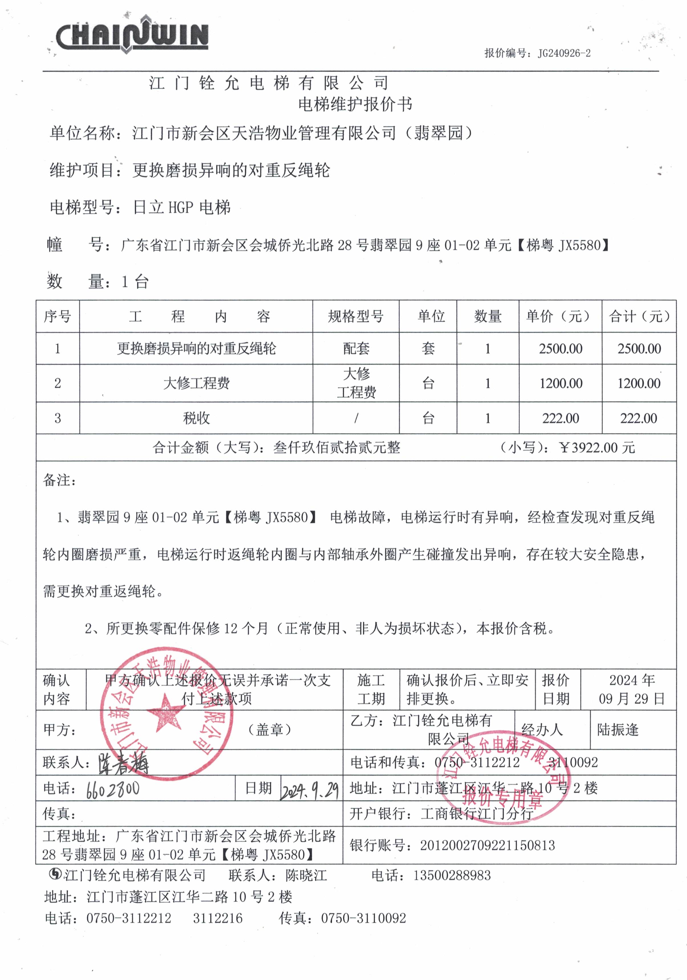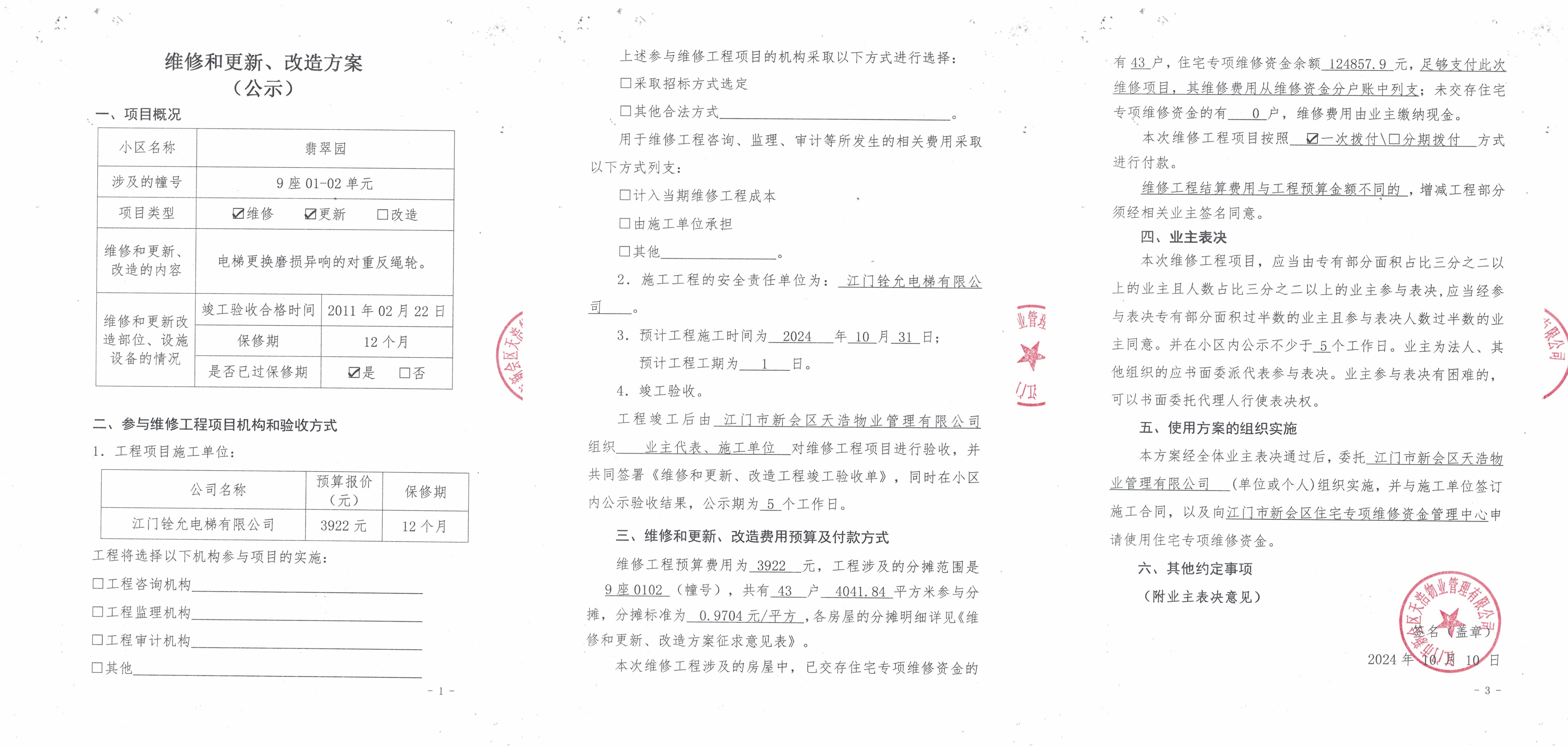 <td VALIGN="top" VALUES="" STYLE="border-width:0" BINDTYPE="0" ROWSPAN="18" COLSPAN="7" DATASOURCE="投票内容" ><font style="font-size:12pt;"><p style="text-align: left; font-family: 宋体; font-size: 16px; line-height: 1.75em;"><strong style="text-align: left; line-height: 1.75em;">一、投票范围</strong><br/></p><p style="white-space: normal; font-family: 宋体; font-size: 16px; line-height: 1.75em; text-indent: 2em;">翡翠园翡翠园9座</p><p style="white-space: normal; font-family: 宋体; font-size: 16px; line-height: 1.75em; text-indent: 2em;">总人数(专有部分人数之和):24</p><p style="white-space: normal; font-family: 宋体; font-size: 16px; line-height: 1.75em; text-indent: 2em;"><span style="font-family: 宋体; text-indent: 32px;">总户数:43</span></p><p style="white-space: normal; font-family: 宋体; font-size: 16px; line-height: 1.75em; text-indent: 2em;">建筑物总面积(专有部分面积之和):4041.84㎡</p><p style="white-space: normal; font-family: 宋体;font-size: 16px; line-height: 1.75em;"><strong>二、投票起止时间</strong></p><p style="white-space: normal; font-family: 宋体; line-height: 1.75em; text-indent: 2em;">投票表决时间:从2024年10月10日到2024年11月29日止</p><p style="white-space: normal; font-family: 宋体; line-height: 1.75em; text-indent: 2em;">投票补录时间:从2024年11月30日到2024年12月04日止</p><p style="white-space: normal; font-family: 宋体;font-size: 16px; line-height: 1.75em;"><strong>三、投票详细描述</strong></p><p style="white-space: normal; font-family: 宋体; font-size: 16px; line-height: 1.75em; text-indent: 2em;"><p><span style="font-size: 14px; font-family: 宋体, SimSun;">&nbsp; 翡翠园9座0102电梯【梯粤JX5580】电梯故障,电梯运行时有异响,经检查发现对重反绳轮内圈磨损严重,电梯运行时返绳轮内圈与内部轴承外圈产生碰撞发生异响,<span style="font-size: 14px; text-wrap: wrap; background-color: rgb(255, 255, 255);">存在较大安全隐患,需更换对重返绳轮,已过保修期</span>。</span></p><p><span style="font-family: 宋体, SimSun;"><span style="font-family: 宋体, SimSun; font-size: 14px;">&nbsp; 现需申请使用维修资金对9座0102电梯【梯粤JX5580】进行维修,工程维修预算金额为3922元,项目最终费用以施工合同签订金额为准。</span><span style="font-family: 宋体, SimSun; text-wrap: wrap; background-color: rgb(255, 255, 255); font-size: 14px;">因已过保修期,维修费用由相关业主按建筑面积分摊 ,每平方约0.9704元,详见公示附件。如业主手机不能正常通过微信投票,请联系物业公司进行线下纸质投票,物业电话:0750-6602800</span></span></p></p><p style="white-space: normal; font-family: 宋体;font-size: 16px; line-height: 1.75em;"><strong>四、计票规则</strong></p><p style="white-space: normal; font-family: 宋体; font-size: 16px; line-height: 1.75em; text-indent: 2em;"><span style="font-family: 宋体; text-indent: 32px;">表决事项:使用建筑物及其附属设施的维修资金<br /><p style='text-align: left; font-family: 宋体; font-size: 16px; line-height: 1.75em; text-indent: 2em;'>计票规则:弃权票不并入其它项&nbsp;&nbsp;&nbsp;&nbsp;未表决票不并入其它项</p></span></p><p style="white-space: normal; font-family: 宋体;font-size: 16px; line-height: 1.75em;"><strong>五、通过规则</strong></p><p style="white-space: normal; font-family: 宋体;font-size: 16px; line-height: 1.75em;"><strong>&nbsp; 根据《中华人民共和国民法典》第二百七十八条规定:业主共同决定事项,应当由专有部分面积占比三分之二以上的业主且人数占比三分之二以上的业主参与表决。</strong></p><p style="white-space: normal; font-family: 宋体; font-size: 16px; line-height: 1.75em; text-indent: 2em;"><span style="font-family: 宋体; text-indent: 32px;">表决事项:使用建筑物及其附属设施的维修资金<br /><p style='text-align: left; font-family: 宋体; font-size: 16px; line-height: 1.75em; text-indent: 2em;'>通过规则:双2/3以上参与表决,参与表决双过半同意</p></span><span style="font-family: 宋体; text-indent: 32px;"></span></p><p style="text-align: left; font-family: 宋体; font-size: 16px; line-height: 1.75em;"><strong>六、投票方式</strong></p><p style="text-align: left; font-family: 宋体; font-size: 16px; line-height: 1.75em; text-indent: 2em;"><span style="font-size: 16px; font-family: 宋体">在投票事项通知公告日起,请业主扫描二维码或者关注微信公众号(<strong>江门住建易办事</strong>)查看详细情况并进行投票。</span></p><p style="text-align: center; font-family: 宋体; font-size: 16px; line-height: 1.75em; text-indent: 2em;"><span style="font-size: 16px; font-family: 宋体"><strong style="font-family: 宋体; text-align: center; white-space: normal; line-height: 1.75em;"><img src="http://jmzjj.jiangmen.cn:8071/Areas/Custom/Content/images/jmzjybs.jpg"/></strong></span></p><p style="text-align: right; font-family: 宋体; font-size: 16px; line-height: 1.75em; text-indent: 2em;"><span style="text-align: right;">申报单位(盖章):江门市新会区天浩物业管理有限公司</span></p><p style="text-align: right; font-family: 宋体; font-size: 16px; line-height: 1.75em;">2024年10月10日</p></font></td>