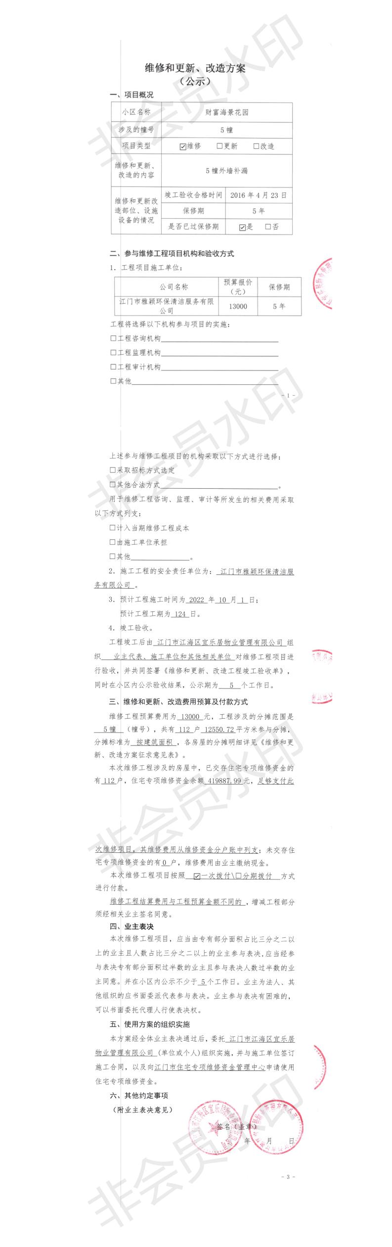 | <p style="text-align: left; font-family: 宋体; font-size: 16px; line-height: 1.75em;"><span style="font-family: 宋体;">江海区外海财富海景花园江海区外海财富海景花园5幢全体业主:</span></p><p style="text-align: left; font-family: 宋体; font-size: 16px; line-height: 1.75em; text-indent: 2em;">本小区关于江门财富海景花园5幢外墙补漏使用维修资金的投票的投票已表决结束,询异时间从2022年10月10日开始,投票询异公示期间,业主可通过微信查询自己的表决情况或可凭身份证件赴发起机构申请查询自己的表决情况;如公示的业主表决情况与在服务平台查询的本人表决意见不一致的,可以以书面形式向发起机构核查。经核查业主反映情况属实的,发起机构应当予以纠正并重新公示表决结果。</p><p><br/></p><p style="text-align: left; font-family: 宋体; font-size: 16px; line-height: 1.75em;"><strong><span style="font-family: 宋体">附件:</span></strong></p><p style="text-align: left; font-family: 宋体; font-size: 16px; line-height: 1.75em;"><strong>一、投票范围</strong></p><p style="text-align: left; font-family: 宋体; font-size: 16px; line-height: 1.75em; text-indent: 2em;">江海区外海财富海景花园江海区外海财富海景花园5幢</p><p style="text-align: left; font-family: 宋体; font-size: 16px; line-height: 1.75em; text-indent: 2em;">总人数(专有部分人数之和):110</p><p style="text-align: left; font-family: 宋体; font-size: 16px; line-height: 1.75em; text-indent: 2em;"><span style="font-family: 宋体, SimSun; text-indent: 32px;">总户数:{TotalHouseCount}</span></p><p style="text-align: left; font-family: 宋体; font-size: 16px; line-height: 1.75em; text-indent: 2em;">建筑物总面积(专有部分面积之和):12550.72㎡</p><p style="text-align: left; font-family: 宋体; font-size: 16px; line-height: 1.75em;"><strong>二、投票起止时间</strong></p><p dir="ltr" style="text-align: left; font-family: 宋体; font-size: 16px; line-height: 1.75em; text-indent: 2em;">投票表决时间:从2022年09月19日到2022年10月09日止</p><p dir="ltr" style="text-align: left; font-family: 宋体; font-size: 16px; line-height: 1.75em; text-indent: 2em;">投票询异公示时间:从2022年10月10日开始</p><p dir="ltr" style="text-align: left; font-family: 宋体; font-size: 16px; line-height: 1.75em; text-indent: 2em;">投票结果通知公告时间:从2022年10月17日开始<br/></p><p style="text-align: left; font-family: 宋体; font-size: 16px; line-height: 1.75em;"><strong>三、投票详细描述</strong></p><p style="text-align: left; font-family: 宋体; font-size: 16px; line-height: 1.75em; text-indent: 2em;"><p style="text-indent: 2em;">本小区5幢多户屋内墙体渗水,经检查,是由于外墙渗水,已过保修期。</p><p style="text-indent: 2em;"><span style="text-indent: 2em;">现需申请使用维修资金对5幢部分外墙补漏,工程维修预算金额为13000元,项目最终费用以施工合同签订金额为准。维修费用的分摊标准为按建筑面积分摊,每平方约1.04元,详见公示附件。如业主手机不能正常通过微信投票,请联系物业服务中心进行线下纸质投票,物业服务中心电话:0750-3813899。</span></p></p><p style="text-align: left; font-family: 宋体; font-size: 16px; line-height: 1.75em;"><strong>四、计票规则</strong></p><p style="text-align: left; font-family: 宋体; font-size: 16px; line-height: 1.75em; text-indent: 2em;">表决事项:使用建筑物及其附属设施的维修资金<br /><p style='text-align: left; font-family: 宋体; font-size: 16px; line-height: 1.75em; text-indent: 2em;'>计票规则:弃权票不并入其它项&nbsp;&nbsp;&nbsp;&nbsp;未表决票不并入其它项</p></p><p style="text-align: left; font-family: 宋体; font-size: 16px; line-height: 1.75em;"><strong>五、通过规则</strong></p><p style="text-align: left; font-family: 宋体; font-size: 16px; line-height: 1.75em; text-indent: 2em;"><span style="font-family: 宋体; text-indent: 32px;">表决事项:使用建筑物及其附属设施的维修资金<br /><p style='text-align: left; font-family: 宋体; font-size: 16px; line-height: 1.75em; text-indent: 2em;'>通过规则:参与表决专有部分面积过半数的业主且参与表决人数过半数的业主同意</p></span></p><p style="text-align: left; font-family: 宋体; font-size: 16px; line-height: 1.75em;"><strong>六、投票结果</strong></p><p style="text-align: left; font-family: 宋体; font-size: 16px; line-height: 1.75em; text-indent: 2em;"><div id='resultTable'><table style='table-layout: fixed; font-size:12px; margin-top:10px' width='100%' border='0' cellspacing='0' cellpadding='0'><tr><td height='28' colspan='10' align='center' style='border: 1px solid #666'><strong style='font-size: 14px;'> 使用建筑物及其附属设施的维修资金</strong></td> </tr><tr id='trfirst'><td height='28' colspan='4' style='border-left: 1px solid #666; border-bottom: 1px solid #666'><strong>&nbsp;申报单位:</strong> 江门市江海区宜乐居物业管理有限公司</td><td colspan='3' style='border-left: 1px solid #666; border-bottom: 1px solid #666'><strong>&nbsp;联系方式:</strong> </td><td colspan='3' style='border-left: 1px solid #666; border-bottom: 1px solid #666; border-right: 1px solid #666'><strong>&nbsp;申报日期:</strong> 2022年9月15日 </td></tr><tr> <td height='28' colspan='5' style='border-left: 1px solid #666; border-bottom: 1px solid #666'><strong>&nbsp;总人数(专有部分人数之和):</strong>110人 </td><td colspan='5' style='border-left: 1px solid #666; border-bottom: 1px solid #666; border-right: 1px solid #666'><strong>&nbsp;建筑物总面积(专有部分面积之和):</strong>12550.72㎡ </td> </tr><tr><td height='28' colspan='10' style='border: 1px solid #666'><strong>&nbsp;该事项表决是否通过:未通过</strong></td></tr><tr><td h