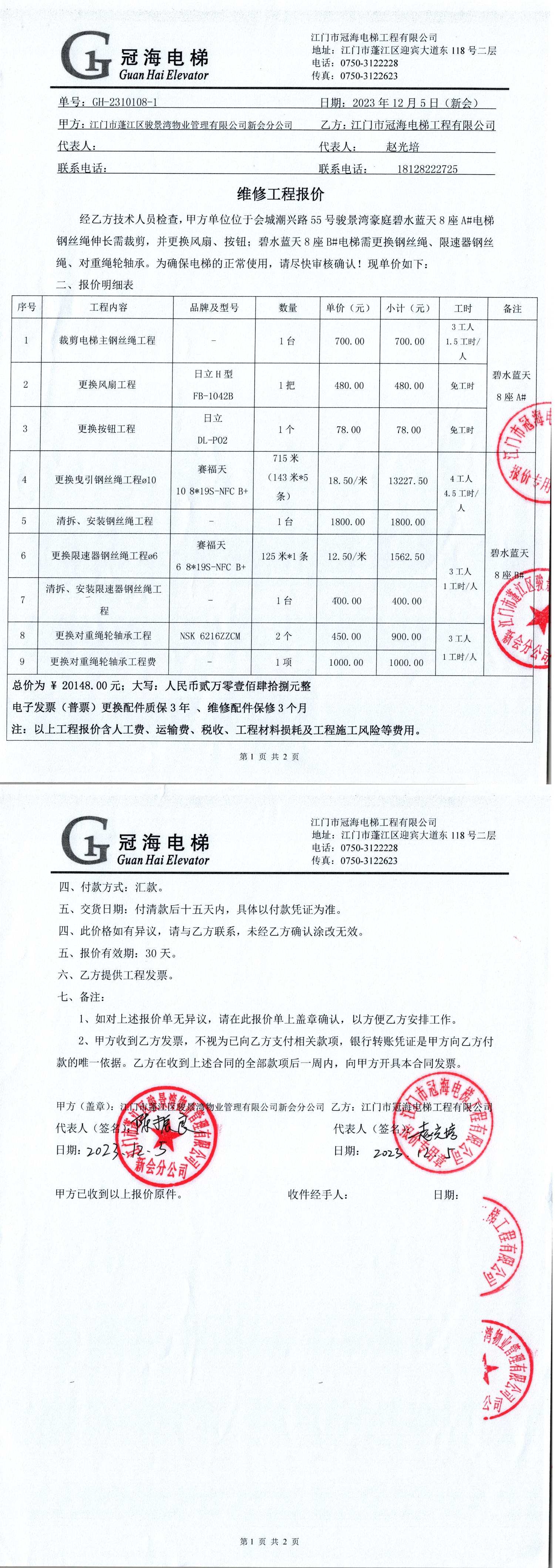 新会骏景湾豪庭碧水蓝天8座A电梯裁剪钢丝绳,更换风扇、按钮;B电梯更换曳引钢丝绳、限速器钢丝绳、对重绳轮轴承使用维修资金的投票