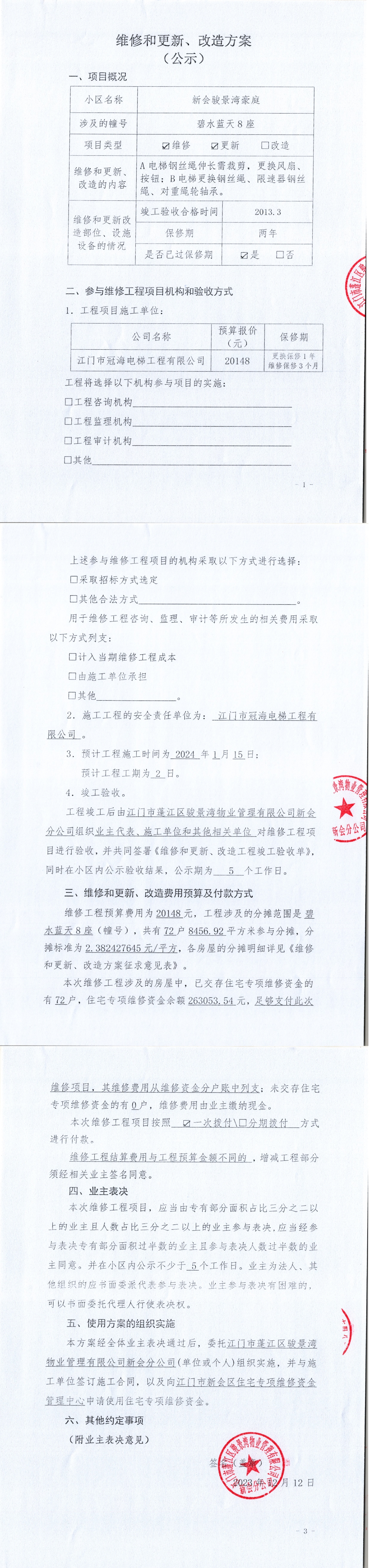 新会骏景湾豪庭碧水蓝天8座A电梯裁剪钢丝绳,更换风扇、按钮;B电梯更换曳引钢丝绳、限速器钢丝绳、对重绳轮轴承使用维修资金的投票投票通知公告