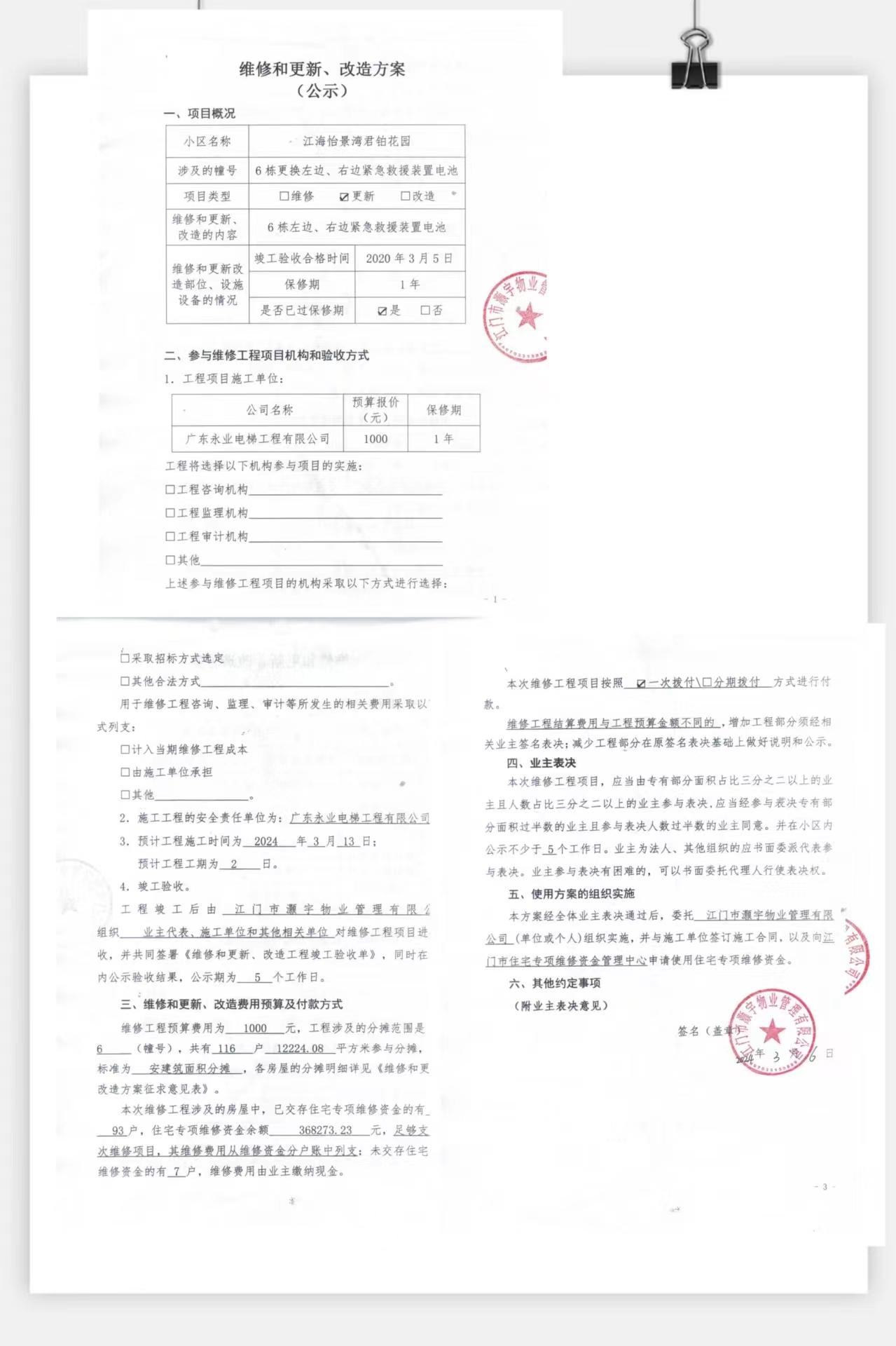 江海怡景湾君铂花园6栋客梯、货梯更换紧急救援装置电池投票询异公示