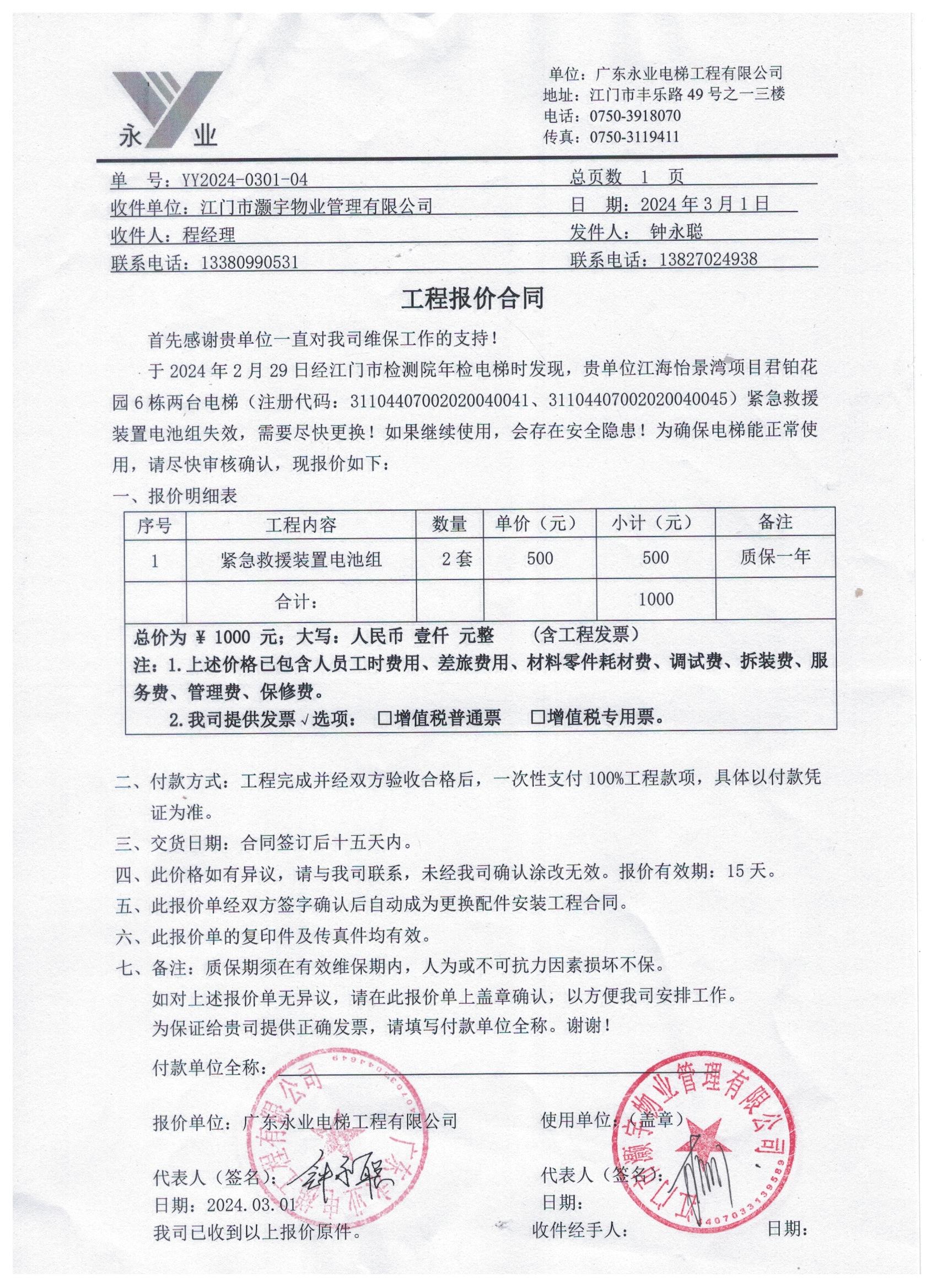 江海怡景湾君铂花园6栋客梯、货梯更换紧急救援装置电池