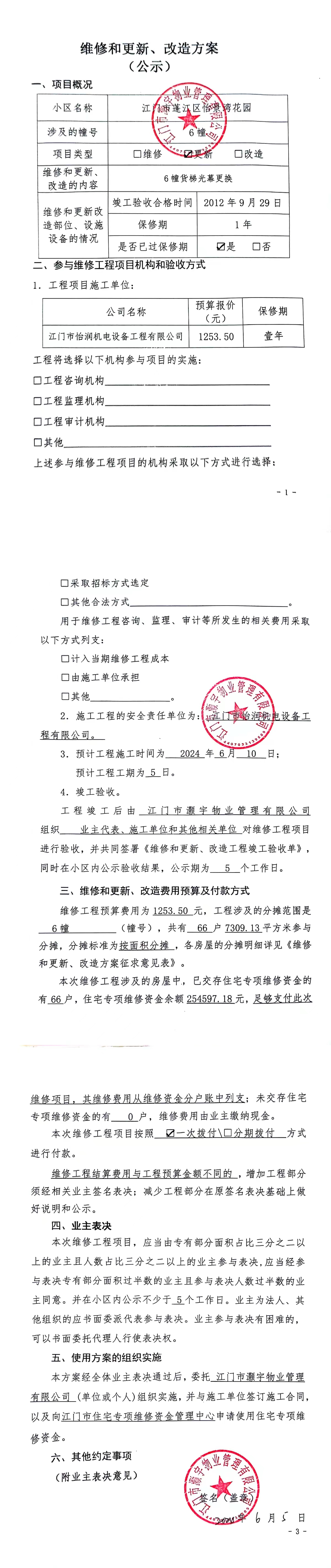 <td VALIGN="top" VALUES="" STYLE="border-width:0" BINDTYPE="0" ROWSPAN="19" COLSPAN="7" DATASOURCE="投票结果" ><font style="font-size:14pt;"><p style="white-space: normal; font-family: 宋体; line-height: 1.75em;">蓬江区怡景湾蓬江区怡景湾花园6幢全体业主:</p><p style="white-space: normal; font-family: 宋体; line-height: 1.75em; text-indent: 2em;">本小区关于蓬江区怡景湾6幢客梯变频器电容、大模块、驱动模块设施设备维修使用维修资金的投票的投票已表决结束,询异时间从2024年12月27日开始,投票询异公示期间,业主可通过微信查询自己的表决情况或可凭身份证件申请查询自己的表决情况;如公示的业主表决情况与查询的本人表决意见不一致的,可以以书面形式向投票组织机构申诉,投票组织机构予以纠正并重新公示表决结果。异议提出人对投票组织机构的处理仍有异议的,可以向街道办事处(镇人民政府)反映处理,涉及住宅专项维修资金的,可向属地住宅专项维修资金管理中心反映处理。</p><p style="white-space: normal;"><br/></p><p style="white-space: normal; font-family: 宋体; line-height: 1.75em;"><strong>附件:</strong></p><p style="white-space: normal; font-family: 宋体; line-height: 1.75em;"><strong>一、投票范围</strong></p><p style="white-space: normal; font-family: 宋体; line-height: 1.75em; text-indent: 2em;">蓬江区怡景湾蓬江区怡景湾花园6幢</p><p style="white-space: normal; font-family: 宋体; line-height: 1.75em; text-indent: 2em;">总人数(专有部分人数之和):63</p><p style="white-space: normal; font-family: 宋体; line-height: 1.75em; text-indent: 2em;"><span style="font-family: 宋体, SimSun;"><span style="font-family: 宋体; text-indent: 32px;"><span style="font-family: 宋体; text-indent: 32px;">总户数:66</span></span></span></p><p style="white-space: normal; font-family: 宋体; line-height: 1.75em; text-indent: 2em;">建筑物总面积(专有部分面积之和):7309.13㎡</p><p style="white-space: normal; font-family: 宋体; line-height: 1.75em;"><strong>二、询异公示起止时间</strong></p><p dir="ltr" style="white-space: normal; font-family: 宋体; line-height: 1.75em; text-indent: 2em;"><span style="text-indent: 36px;">2024年12月27日至2025年01月06日</span></p><p style="white-space: normal; font-family: 宋体; line-height: 1.75em;"><strong>三、投票详细描述</strong></p><p style="white-space: normal; font-family: 宋体; line-height: 1.75em; text-indent: 2em;"><p><span style="font-family: "Helvetica Neue", Helvetica, Arial, sans-serif; font-size: 14px; text-wrap: wrap; background-color: rgb(255, 255, 255);">小区6幢客梯变频器电容、大模块、驱动板故障,现需申请使用维修资金对6幢客梯<span style="font-family: "Helvetica Neue", Helvetica, Arial, sans-serif; font-size: 14px; text-wrap-mode: wrap; background-color: rgb(255, 255, 255);">变频器电容、大模块、驱动板</span>进行更换,工程维修预算金额为7130元,项目最终费用以施工合同签订金额为准。维修费用的分摊标准为按面积分摊 ,每平约0.98元,详见公示附件。如业主手机不能正常通过微信投票,请联系物业公司进行线下纸质投票,物业电话:0750-3692722</span></p></p><p style="white-space: normal; font-family: 宋体; line-height: 1.75em;"><strong>四、计票规则</strong></p><p style="white-space: normal; font-family: 宋体; line-height: 1.75em; text-indent: 2em;">表决事项:使用建筑物及其附属设施的维修资金<br /><p style='text-align: left; font-family: 宋体; font-size: 16px; line-height: 1.75em; text-indent: 2em;'>计票规则:弃权票不并入其它项 未表决票不并入其它项</p></p><p style="white-space: normal; font-family: 宋体; line-height: 1.75em;"><strong>五、通过规则</strong></p><p style="white-space: normal; font-family: 宋体; line-height: 1.75em;"><strong><strong style="white-space: normal;"><span style="font-family: 宋体, SimSun;"> 根据《中华人民共和国民法典》第二百七十八条规定:业主共同决定事项,应当由专有部分面积占比三分之二以上的业主且人数占比三分之二以上的业主参与表决。</span></strong></strong></p><p style="white-space: normal; font-family: 宋体; line-height: 1.75em; text-indent: 2em;">表决事项:使用建筑物及其附属设施的维修资金<br /><p style='text-align: left; font-family: 宋体; font-size: 16px; line-height: 1.75em; text-indent: 2em;'>通过规则:双2/3以上参与表决,参与表决双过半同意</p></p><p style="white-space: normal; font-family: 宋体; line-height: 1.75em;"><strong>六、投票结果</strong></p><p style="white-space: normal; font-family: 宋体; line-height: 1.75em; text-indent: 2em;"><div id='resultTable'><table style='table-layout: fixed; font-size:12px; margin-top:10px' width='100%' border='0' cellspacing='0' cellpadding='0'><tr><td height='28' colspan='10' align='center' style='border: 1px solid #666'><strong style='font-size: 14px;'> 使用建筑物及其附属设施的维修资金</strong></td> </tr><tr id='trfirst'><td height='28' colspan='4' style='border-left: 1px solid #666; border-bottom: 1px solid #666'><strong> 申报单位:</strong> 江门市灏宇物业管理有限公司</td><td colspan='3' style='border-left: 1px solid #666; border-bottom: 1px solid #666'><strong> 联系方式:</strong> </td><td colspan='3' style='border-left: 1px solid #666; border-bottom: 1px solid #666; border-right: 1px solid #666'><strong> 申报日期:</strong> 2024年12月12日 </td></tr><tr> <td height='28' colspan='5' style='border-left: 1px solid #666; border-bottom: 1px solid #666'><strong> 总人数(专有部分人数之和):</strong>63人 </td><td colspan='5' style='border-left: 1px solid #666; border-bottom: 1px solid #666; border-right: 1px solid #666'><strong> 建筑物总面积(专有部分面积之