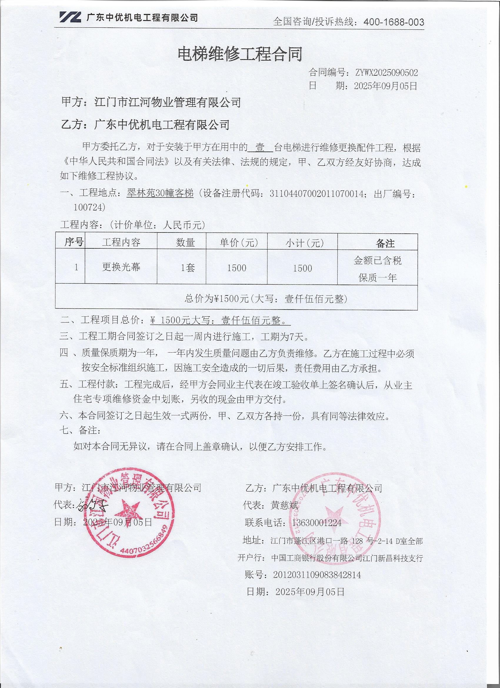 <td VALIGN="top" VALUES="" STYLE="border-width:0" BINDTYPE="0" ROWSPAN="19" COLSPAN="7" DATASOURCE="投票结果" ><font style="font-size:14pt;"><p style="white-space: normal; font-family: 宋体; line-height: 1.75em;">翠林苑蓬江区翠林苑30幢全体业主:</p><p style="white-space: normal; font-family: 宋体; line-height: 1.75em; text-indent: 2em;">本小区关于翠林苑小区30幢客梯更换光幕使用维修资金的投票的投票已表决结束,询异时间从2025年11月04日开始,投票询异公示期间,业主可通过微信查询自己的表决情况或可凭身份证件申请查询自己的表决情况;如公示的业主表决情况与查询的本人表决意见不一致的,可以以书面形式向投票组织机构申诉,投票组织机构予以纠正并重新公示表决结果。异议提出人对投票组织机构的处理仍有异议的,可以向街道办事处(镇人民政府)反映处理,涉及住宅专项维修资金的,可向属地住宅专项维修资金管理中心反映处理。</p><p style="white-space: normal;"><br/></p><p style="white-space: normal; font-family: 宋体; line-height: 1.75em;"><strong>附件:</strong></p><p style="white-space: normal; font-family: 宋体; line-height: 1.75em;"><strong>一、投票范围</strong></p><p style="white-space: normal; font-family: 宋体; line-height: 1.75em; text-indent: 2em;">翠林苑蓬江区翠林苑30幢</p><p style="white-space: normal; font-family: 宋体; line-height: 1.75em; text-indent: 2em;">总人数(专有部分人数之和):45</p><p style="white-space: normal; font-family: 宋体; line-height: 1.75em; text-indent: 2em;"><span style="font-family: 宋体, SimSun;"><span style="font-family: 宋体; text-indent: 32px;"><span style="font-family: 宋体; text-indent: 32px;">总户数:45</span></span></span></p><p style="white-space: normal; font-family: 宋体; line-height: 1.75em; text-indent: 2em;">建筑物总面积(专有部分面积之和):6819.52㎡</p><p style="white-space: normal; font-family: 宋体; line-height: 1.75em;"><strong>二、询异公示起止时间</strong></p><p dir="ltr" style="white-space: normal; font-family: 宋体; line-height: 1.75em; text-indent: 2em;"><span style="text-indent: 36px;">2025年11月04日至2025年11月14日</span></p><p style="white-space: normal; font-family: 宋体; line-height: 1.75em;"><strong>三、投票详细描述</strong></p><p style="white-space: normal; font-family: 宋体; line-height: 1.75em; text-indent: 2em;"><p>翠林苑小区30幢客梯在电梯维保员开展电梯门接焊工作期间,进入电梯时电梯门非正常闭合,经检查后发现故障原因是:光幕失效,电梯安全存在安全隐患<span style="font-family:宋体">,需更换</span>。</p><p> 现对30幢客梯光幕进行更换,工程维修预算金额为1500元,项目最终费用以施工合同签订金额为准。因已过保修期,维修费用由相关业主按分户分摊,每户分摊33.33元,详见公示附件。如业主手机不能正常通过微信投票,请联系物业公司进行线下纸质投票,物业电话:3221022。</p><p><br/></p><p><br/></p></p><p style="white-space: normal; font-family: 宋体; line-height: 1.75em;"><strong>四、计票规则</strong></p><p style="white-space: normal; font-family: 宋体; line-height: 1.75em; text-indent: 2em;">表决事项:翠林苑小区30幢客梯更换光幕的投票<br /><p style='text-align: left; font-family: 宋体; font-size: 16px; line-height: 1.75em; text-indent: 2em;'>计票规则:弃权票不并入其它项 未表决票不并入其它项</p></p><p style="white-space: normal; font-family: 宋体; line-height: 1.75em;"><strong>五、通过规则</strong></p><p style="white-space: normal; font-family: 宋体; line-height: 1.75em;"><strong><strong style="white-space: normal;"><span style="font-family: 宋体, SimSun;"> 根据《中华人民共和国民法典》第二百七十八条规定:业主共同决定事项,应当由专有部分面积占比三分之二以上的业主且人数占比三分之二以上的业主参与表决。</span></strong></strong></p><p style="white-space: normal; font-family: 宋体; line-height: 1.75em; text-indent: 2em;">表决事项:翠林苑小区30幢客梯更换光幕的投票<br /><p style='text-align: left; font-family: 宋体; font-size: 16px; line-height: 1.75em; text-indent: 2em;'>通过规则:双2/3以上参与表决,参与表决双过半同意</p></p><p style="white-space: normal; font-family: 宋体; line-height: 1.75em;"><strong>六、投票结果</strong></p><p style="white-space: normal; font-family: 宋体; line-height: 1.75em; text-indent: 2em;"><div id='resultTable'><table style='table-layout: fixed; font-size:12px; margin-top:10px' width='100%' border='0' cellspacing='0' cellpadding='0'><tr><td height='28' colspan='10' align='center' style='border: 1px solid #666'><strong style='font-size: 14px;'> 翠林苑小区30幢客梯更换光幕的投票</strong></td> </tr><tr id='trfirst'><td height='28' colspan='4' style='border-left: 1px solid #666; border-bottom: 1px solid #666'><strong> 申报单位:</strong> 江门市江河物业管理有限公司</td><td colspan='3' style='border-left: 1px solid #666; border-bottom: 1px solid #666'><strong> 联系方式:</strong> 3221022 </td><td colspan='3' style='border-left: 1px solid #666; border-bottom: 1px solid #666; border-right: 1px solid #666'><strong> 申报日期:</strong> 2025年9月9日 </td></tr><tr> <td height='28' colspan='5' style='border-left: 1px solid #666; border-bottom: 1px solid #666'><strong> 总人数(专有部分人数之和):</strong>45人 </td><td colspan='5' style='border-left: 1px solid #666; border-bottom: 1px solid #666; border-right: 1px solid #666'><strong> 建筑物总面积(专有部分面积之和):</strong>6819.52㎡ </td> </tr><tr><td height='28' colspan='10' bgcolor='#F3F3F3' style='border-left: 1px solid #666;border-bottom: 1px solid #666;border-right: 1px solid #666'><strong> 参与人数及面积