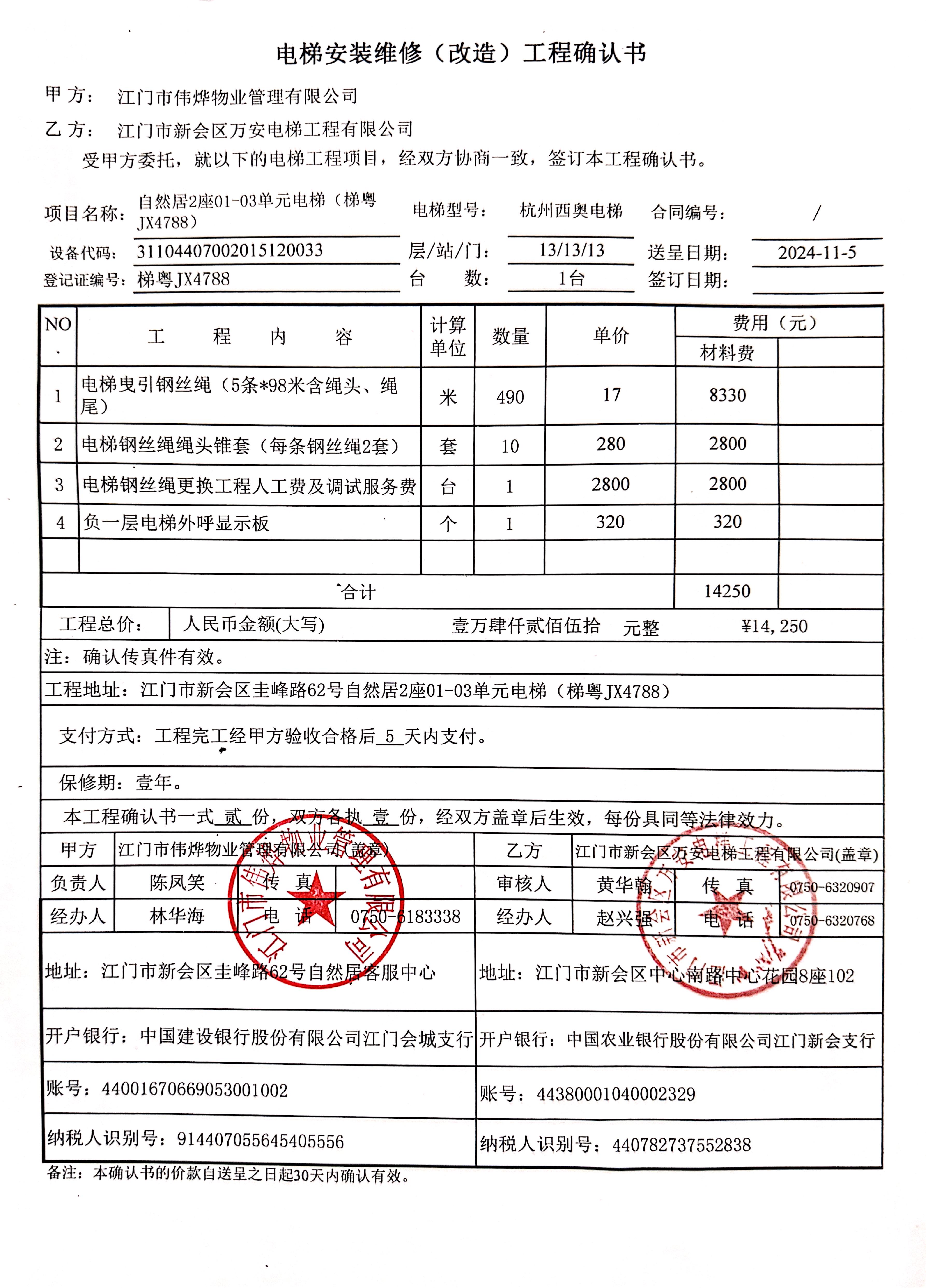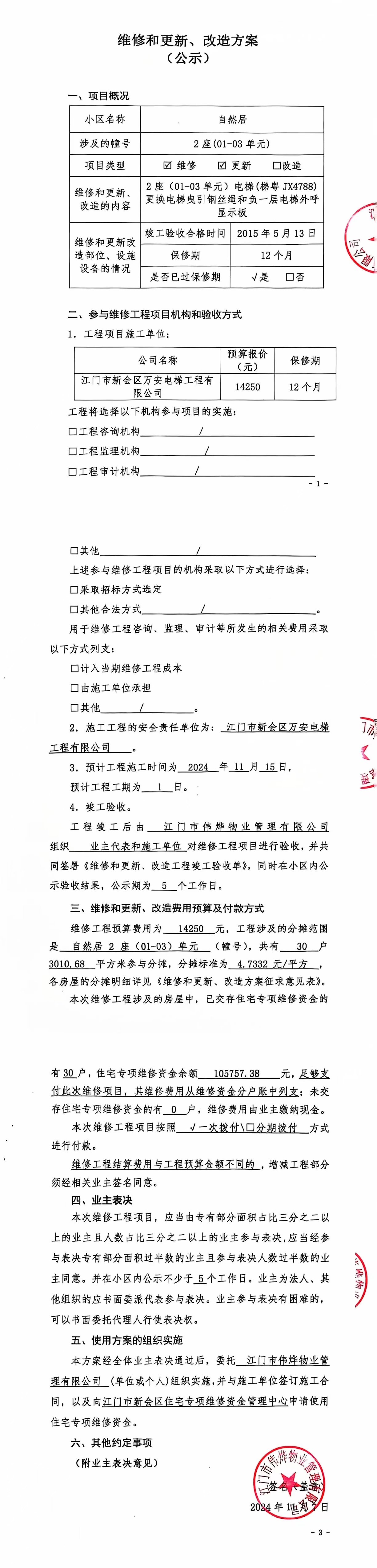 <td VALIGN="top" VALUES="" STYLE="border-width:0" BINDTYPE="0" ROWSPAN="18" COLSPAN="7" DATASOURCE="投票内容" ><font style="font-size:12pt;"><p style="text-align: left; font-family: 宋体; font-size: 16px; line-height: 1.75em;"><strong style="text-align: left; line-height: 1.75em;">一、投票范围</strong><br/></p><p style="white-space: normal; font-family: 宋体; font-size: 16px; line-height: 1.75em; text-indent: 2em;">自然居自然居2座</p><p style="white-space: normal; font-family: 宋体; font-size: 16px; line-height: 1.75em; text-indent: 2em;">总人数(专有部分人数之和):30</p><p style="white-space: normal; font-family: 宋体; font-size: 16px; line-height: 1.75em; text-indent: 2em;"><span style="font-family: 宋体; text-indent: 32px;">总户数:30</span></p><p style="white-space: normal; font-family: 宋体; font-size: 16px; line-height: 1.75em; text-indent: 2em;">建筑物总面积(专有部分面积之和):3010.68㎡</p><p style="white-space: normal; font-family: 宋体;font-size: 16px; line-height: 1.75em;"><strong>二、投票起止时间</strong></p><p style="white-space: normal; font-family: 宋体; line-height: 1.75em; text-indent: 2em;">投票表决时间:从2024年11月07日到2024年12月06日止</p><p style="white-space: normal; font-family: 宋体; line-height: 1.75em; text-indent: 2em;">投票补录时间:从2024年12月07日到2024年12月11日止</p><p style="white-space: normal; font-family: 宋体;font-size: 16px; line-height: 1.75em;"><strong>三、投票详细描述</strong></p><p style="white-space: normal; font-family: 宋体; font-size: 16px; line-height: 1.75em; text-indent: 2em;"><p><span style="font-family: 宋体; font-size: 14px; text-wrap: wrap; background-color: rgb(255, 255, 255);">&nbsp;</span><span style="font-family: 宋体; font-size: 14px; text-wrap: wrap; background-color: rgb(255, 255, 255);"> 自然居2座01-03单元(梯粤JX4788)电梯日常运行时出现异响,负一层电梯外呼显示板老化故障,将会影响正常使用,已无法修复,经检查,是由于电梯曳引钢丝绳有断股现象,<span style="font-family: 宋体; font-size: 14px; text-wrap: wrap; background-color: rgb(255, 255, 255);">存在安全隐患</span>导致不能运行。</span></p><p><span style="font-family: 宋体; font-size: 14px; text-wrap: wrap; background-color: rgb(255, 255, 255);">&nbsp; 现对2座01-03单元电梯曳引钢丝绳和负一层外呼显示板进行更换维修,工程维修预算金额为14250元,项目最终费用以施工合同签订金额为准。因已过保修期,维修费用由相关业主按建筑面积分摊,每平方约4.7332 元/平方。详见公示附件。如业主手机不能正常通过微信投票,请联系物业公司进行线下纸质投票,物业电话:0750-6183338</span></p><p><br/></p></p><p style="white-space: normal; font-family: 宋体;font-size: 16px; line-height: 1.75em;"><strong>四、计票规则</strong></p><p style="white-space: normal; font-family: 宋体; font-size: 16px; line-height: 1.75em; text-indent: 2em;"><span style="font-family: 宋体; text-indent: 32px;">表决事项:使用建筑物及其附属设施的维修资金<br /><p style='text-align: left; font-family: 宋体; font-size: 16px; line-height: 1.75em; text-indent: 2em;'>计票规则:弃权票不并入其它项&nbsp;&nbsp;&nbsp;&nbsp;未表决票不并入其它项</p></span></p><p style="white-space: normal; font-family: 宋体;font-size: 16px; line-height: 1.75em;"><strong>五、通过规则</strong></p><p style="white-space: normal; font-family: 宋体;font-size: 16px; line-height: 1.75em;"><strong>&nbsp; 根据《中华人民共和国民法典》第二百七十八条规定:业主共同决定事项,应当由专有部分面积占比三分之二以上的业主且人数占比三分之二以上的业主参与表决。</strong></p><p style="white-space: normal; font-family: 宋体; font-size: 16px; line-height: 1.75em; text-indent: 2em;"><span style="font-family: 宋体; text-indent: 32px;">表决事项:使用建筑物及其附属设施的维修资金<br /><p style='text-align: left; font-family: 宋体; font-size: 16px; line-height: 1.75em; text-indent: 2em;'>通过规则:双2/3以上参与表决,参与表决双过半同意</p></span><span style="font-family: 宋体; text-indent: 32px;"></span></p><p style="text-align: left; font-family: 宋体; font-size: 16px; line-height: 1.75em;"><strong>六、投票方式</strong></p><p style="text-align: left; font-family: 宋体; font-size: 16px; line-height: 1.75em; text-indent: 2em;"><span style="font-size: 16px; font-family: 宋体">在投票事项通知公告日起,请业主扫描二维码或者关注微信公众号(<strong>江门住建易办事</strong>)查看详细情况并进行投票。</span></p><p style="text-align: center; font-family: 宋体; font-size: 16px; line-height: 1.75em; text-indent: 2em;"><span style="font-size: 16px; font-family: 宋体"><strong style="font-family: 宋体; text-align: center; white-space: normal; line-height: 1.75em;"><img src="http://jmzjj.jiangmen.cn:8071/Areas/Custom/Content/images/jmzjybs.jpg"/></strong></span></p><p style="text-align: right; font-family: 宋体; font-size: 16px; line-height: 1.75em; text-indent: 2em;"><span style="text-align: right;">申报单位(盖章):江门市伟烨物业管理有限公司</span></p><p style="text-align: right; font-family: 宋体; font-size: 16px; line-height: 1.75em;">2024年11月07日</p></font></td>