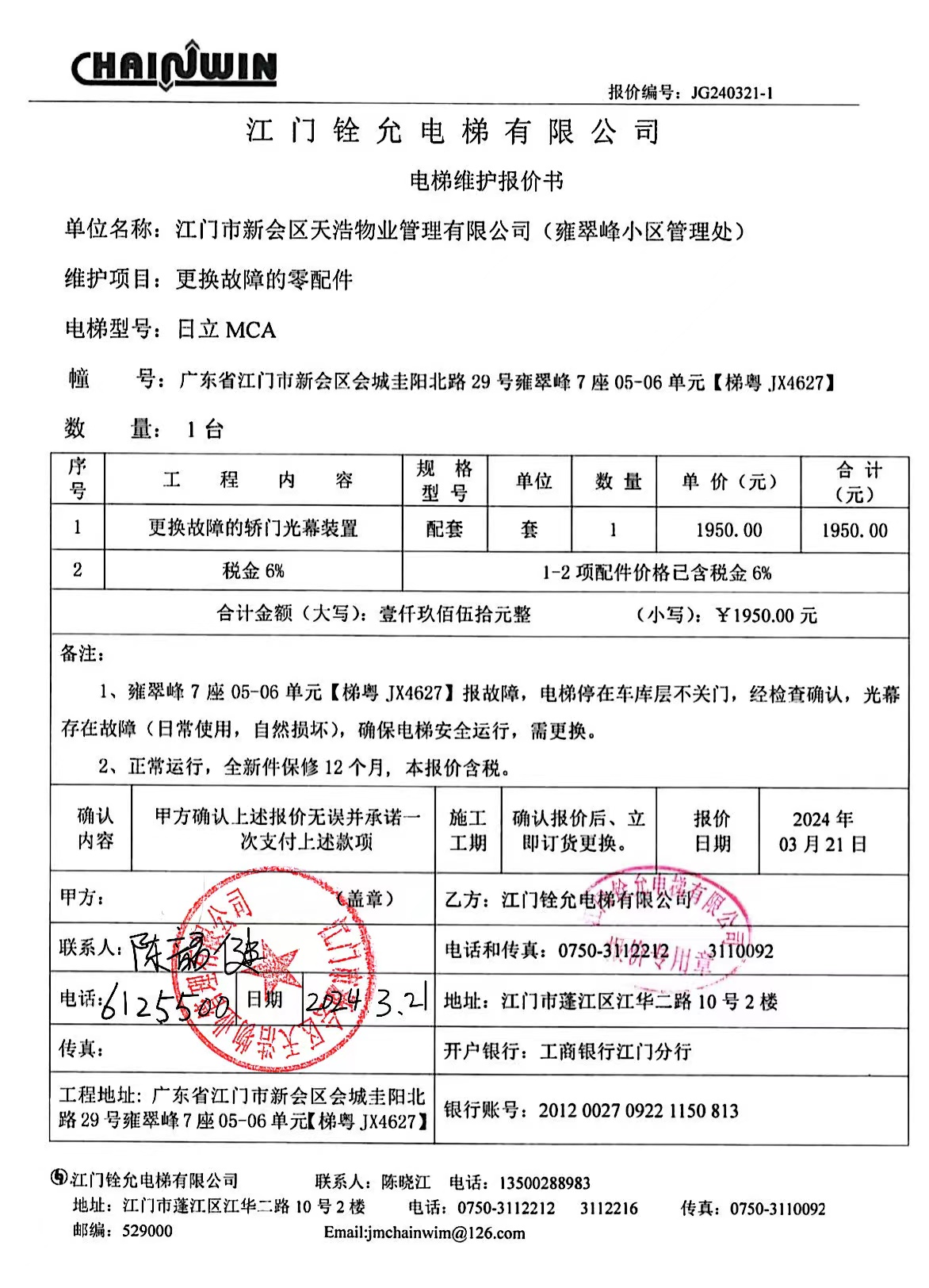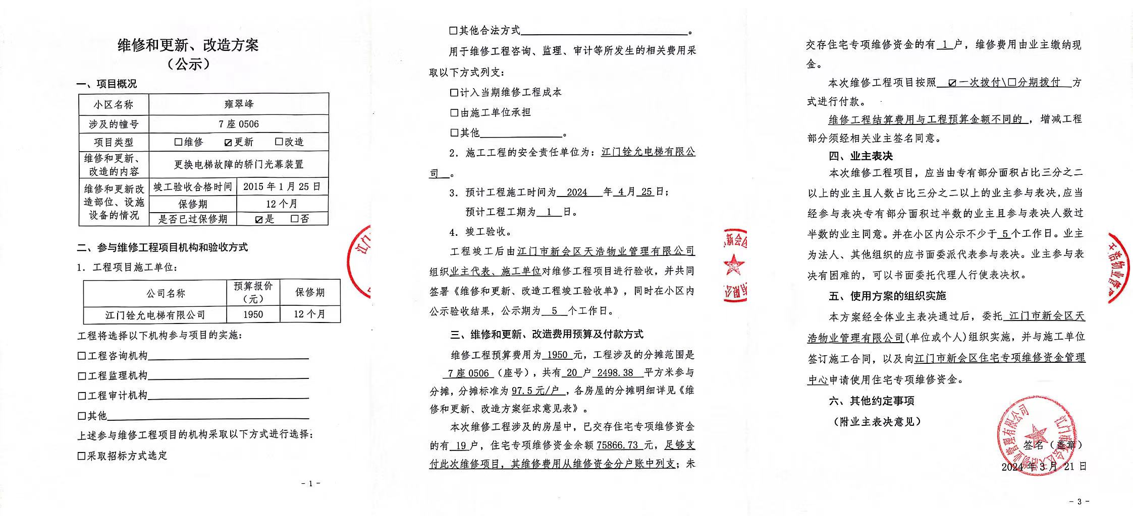 <td VALIGN="top" VALUES="" STYLE="border-width:0" BINDTYPE="0" ROWSPAN="19" COLSPAN="7" DATASOURCE="投票结果" ><font style="font-size:14pt;"><p style="white-space: normal; font-family: 宋体; line-height: 1.75em;">雍翠峰雍翠峰7座全体业主:</p><p style="white-space: normal; font-family: 宋体; line-height: 1.75em; text-indent: 2em;">本小区关于雍翠峰7座0506电梯【梯粤JX4627】更换电梯故障的轿门光幕装置使用维修资金的投票的投票已表决结束,询异时间从2024年03月23日开始,投票询异公示期间,业主可通过微信查询自己的表决情况或可凭身份证件申请查询自己的表决情况;如公示的业主表决情况与查询的本人表决意见不一致的,可以以书面形式向投票组织机构申诉,投票组织机构予以纠正并重新公示表决结果。异议提出人对投票组织机构的处理仍有异议的,可以向街道办事处(镇人民政府)反映处理,涉及住宅专项维修资金的,可向属地住宅专项维修资金管理中心反映处理。</p><p style="white-space: normal;"><br/></p><p style="white-space: normal; font-family: 宋体; line-height: 1.75em;"><strong>附件:</strong></p><p style="white-space: normal; font-family: 宋体; line-height: 1.75em;"><strong>一、投票范围</strong></p><p style="white-space: normal; font-family: 宋体; line-height: 1.75em; text-indent: 2em;">雍翠峰雍翠峰7座</p><p style="white-space: normal; font-family: 宋体; line-height: 1.75em; text-indent: 2em;">总人数(专有部分人数之和):20</p><p style="white-space: normal; font-family: 宋体; line-height: 1.75em; text-indent: 2em;"><span style="font-family: 宋体, SimSun;"><span style="font-family: 宋体; text-indent: 32px;"><span style="font-family: 宋体; text-indent: 32px;">总户数:20</span></span></span></p><p style="white-space: normal; font-family: 宋体; line-height: 1.75em; text-indent: 2em;">建筑物总面积(专有部分面积之和):2498.38㎡</p><p style="white-space: normal; font-family: 宋体; line-height: 1.75em;"><strong>二、询异公示起止时间</strong></p><p dir="ltr" style="white-space: normal; font-family: 宋体; line-height: 1.75em; text-indent: 2em;"><span style="text-indent: 36px;">2024年03月23日至2024年03月29日</span></p><p style="white-space: normal; font-family: 宋体; line-height: 1.75em;"><strong>三、投票详细描述</strong></p><p style="white-space: normal; font-family: 宋体; line-height: 1.75em; text-indent: 2em;"><p> 小区7座0506电梯【梯粤JX4627】报故障,电梯停在车库层不关门,经检查确认,光幕存在故障,日常使用时间较长,自然磨损损坏导致。 现对7座0506电梯【梯粤JX4627】进行维修,工程维修预算金额为1950元,项目最终费用以施工合同签订金额为准。因已过保修期,维修费用由相关业主按分户分摊,每户97.5元,详见公示附件。如业主手机不能正常通过微信投票,请联系物业公司进行线下纸质投票,物业电话:0750-6125500。</p></p><p style="white-space: normal; font-family: 宋体; line-height: 1.75em;"><strong>四、计票规则</strong></p><p style="white-space: normal; font-family: 宋体; line-height: 1.75em; text-indent: 2em;">表决事项:使用建筑物及其附属设施的维修资金<br /><p style='text-align: left; font-family: 宋体; font-size: 16px; line-height: 1.75em; text-indent: 2em;'>计票规则:弃权票不并入其它项 未表决票不并入其它项</p></p><p style="white-space: normal; font-family: 宋体; line-height: 1.75em;"><strong>五、通过规则</strong></p><p style="white-space: normal; font-family: 宋体; line-height: 1.75em;"><strong><strong style="white-space: normal;"><span style="font-family: 宋体, SimSun;"> 根据《中华人民共和国民法典》第二百七十八条规定:业主共同决定事项,应当由专有部分面积占比三分之二以上的业主且人数占比三分之二以上的业主参与表决。</span></strong></strong></p><p style="white-space: normal; font-family: 宋体; line-height: 1.75em; text-indent: 2em;">表决事项:使用建筑物及其附属设施的维修资金<br /><p style='text-align: left; font-family: 宋体; font-size: 16px; line-height: 1.75em; text-indent: 2em;'>通过规则:双2/3以上参与表决,参与表决双过半同意</p></p><p style="white-space: normal; font-family: 宋体; line-height: 1.75em;"><strong>六、投票结果</strong></p><p style="white-space: normal; font-family: 宋体; line-height: 1.75em; text-indent: 2em;"><div id='resultTable'><table style='table-layout: fixed; font-size:12px; margin-top:10px' width='100%' border='0' cellspacing='0' cellpadding='0'><tr><td height='28' colspan='10' align='center' style='border: 1px solid #666'><strong style='font-size: 14px;'> 使用建筑物及其附属设施的维修资金</strong></td> </tr><tr id='trfirst'><td height='28' colspan='4' style='border-left: 1px solid #666; border-bottom: 1px solid #666'><strong> 申报单位:</strong> 江门市新会区天浩物业管理有限公司</td><td colspan='3' style='border-left: 1px solid #666; border-bottom: 1px solid #666'><strong> 联系方式:</strong> </td><td colspan='3' style='border-left: 1px solid #666; border-bottom: 1px solid #666; border-right: 1px solid #666'><strong> 申报日期:</strong> 2024年3月21日 </td></tr><tr> <td height='28' colspan='5' style='border-left: 1px solid #666; border-bottom: 1px solid #666'><strong> 总人数(专有部分人数之和):</strong>20人 </td><td colspan='5' style='border-left: 1px solid #666; border-bottom: 1px solid #666; border-right: 1px solid #666'><strong> 建筑物总面积(专有部分面积之和):</strong>2498.38㎡ </td> </tr><tr><td height='28' colspan='10' bgcolor='#F3F3F3' style='border-left: 1px solid #666;border-bottom: 1px solid #666;border-right: 1px solid #666'><strong> 参与人数及面积统计</strong></td></tr><tr><td height='28' colspan='5' style='border-l