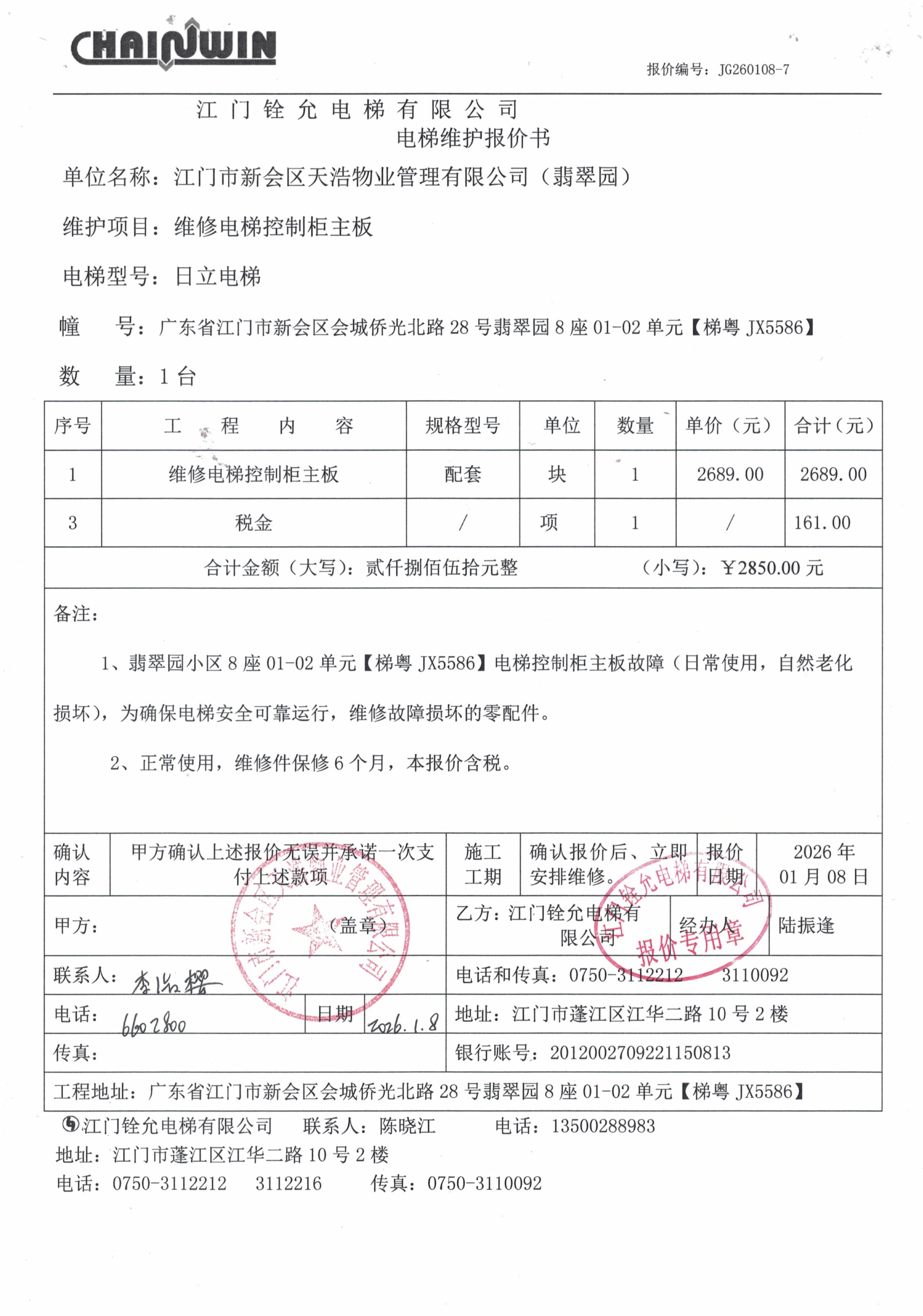 <td VALIGN="top" VALUES="" STYLE="border-width:0" BINDTYPE="0" ROWSPAN="19" COLSPAN="7" DATASOURCE="投票结果" ><font style="font-size:14pt;"><p style="white-space: normal; font-family: 宋体; line-height: 1.75em;">翡翠园翡翠园8座全体业主:</p><p style="white-space: normal; font-family: 宋体; line-height: 1.75em; text-indent: 2em;">本小区关于翡翠园8座0102单元电梯【梯粤JX5586】维修控制柜主板使用维修资金的投票的投票已表决结束,询异时间从2026年01月19日开始,投票询异公示期间,业主可通过微信查询自己的表决情况或可凭身份证件申请查询自己的表决情况;如公示的业主表决情况与查询的本人表决意见不一致的,可以以书面形式向投票组织机构申诉,投票组织机构予以纠正并重新公示表决结果。异议提出人对投票组织机构的处理仍有异议的,可以向街道办事处(镇人民政府)反映处理,涉及住宅专项维修资金的,可向属地住宅专项维修资金管理中心反映处理。</p><p style="white-space: normal;"><br/></p><p style="white-space: normal; font-family: 宋体; line-height: 1.75em;"><strong>附件:</strong></p><p style="white-space: normal; font-family: 宋体; line-height: 1.75em;"><strong>一、投票范围</strong></p><p style="white-space: normal; font-family: 宋体; line-height: 1.75em; text-indent: 2em;">翡翠园翡翠园8座</p><p style="white-space: normal; font-family: 宋体; line-height: 1.75em; text-indent: 2em;">总人数(专有部分人数之和):20</p><p style="white-space: normal; font-family: 宋体; line-height: 1.75em; text-indent: 2em;"><span style="font-family: 宋体, SimSun;"><span style="font-family: 宋体; text-indent: 32px;"><span style="font-family: 宋体; text-indent: 32px;">总户数:40</span></span></span></p><p style="white-space: normal; font-family: 宋体; line-height: 1.75em; text-indent: 2em;">建筑物总面积(专有部分面积之和):3315.28㎡</p><p style="white-space: normal; font-family: 宋体; line-height: 1.75em;"><strong>二、询异公示起止时间</strong></p><p dir="ltr" style="white-space: normal; font-family: 宋体; line-height: 1.75em; text-indent: 2em;"><span style="text-indent: 36px;">2026年01月19日至2026年01月29日</span></p><p style="white-space: normal; font-family: 宋体; line-height: 1.75em;"><strong>三、投票详细描述</strong></p><p style="white-space: normal; font-family: 宋体; line-height: 1.75em; text-indent: 2em;"><p><span style="font-family: 宋体, SimSun; font-size: 14px;"> 翡翠园8座0102单元电梯(梯粤JX5586)控制柜主板故障,配件日常使用自然损坏,已过保修期。</span></p><p><span style="font-family: 宋体, SimSun; font-size: 14px;"> 现需申请使用维修资金对8座0102单元电梯(梯粤JX5586)进行维修,工程维修预算金额为2850元,项目最终费用以施工合同签订金额为准。因已过保修期,维修费用由相关业主按建筑面积分摊,每平方约0.859655元,详见公示附件。如业主手机不能正常通过微信投票,请联系物业公司进行线下纸质投票,物业电话:0750-6602800。</span></p><p><br/></p></p><p style="white-space: normal; font-family: 宋体; line-height: 1.75em;"><strong>四、计票规则</strong></p><p style="white-space: normal; font-family: 宋体; line-height: 1.75em; text-indent: 2em;">表决事项:使用建筑物及其附属设施的维修资金<br /><p style='text-align: left; font-family: 宋体; font-size: 16px; line-height: 1.75em; text-indent: 2em;'>计票规则:弃权票不并入其它项 未表决票不并入其它项</p></p><p style="white-space: normal; font-family: 宋体; line-height: 1.75em;"><strong>五、通过规则</strong></p><p style="white-space: normal; font-family: 宋体; line-height: 1.75em;"><strong><strong style="white-space: normal;"><span style="font-family: 宋体, SimSun;"> 根据《中华人民共和国民法典》第二百七十八条规定:业主共同决定事项,应当由专有部分面积占比三分之二以上的业主且人数占比三分之二以上的业主参与表决。</span></strong></strong></p><p style="white-space: normal; font-family: 宋体; line-height: 1.75em; text-indent: 2em;">表决事项:使用建筑物及其附属设施的维修资金<br /><p style='text-align: left; font-family: 宋体; font-size: 16px; line-height: 1.75em; text-indent: 2em;'>通过规则:双2/3以上参与表决,参与表决双过半同意</p></p><p style="white-space: normal; font-family: 宋体; line-height: 1.75em;"><strong>六、投票结果</strong></p><p style="white-space: normal; font-family: 宋体; line-height: 1.75em; text-indent: 2em;"><div id='resultTable'><table style='table-layout: fixed; font-size:12px; margin-top:10px' width='100%' border='0' cellspacing='0' cellpadding='0'><tr><td height='28' colspan='10' align='center' style='border: 1px solid #666'><strong style='font-size: 14px;'> 使用建筑物及其附属设施的维修资金</strong></td> </tr><tr id='trfirst'><td height='28' colspan='4' style='border-left: 1px solid #666; border-bottom: 1px solid #666'><strong> 申报单位:</strong> 江门市新会区天浩物业管理有限公司</td><td colspan='3' style='border-left: 1px solid #666; border-bottom: 1px solid #666'><strong> 联系方式:</strong> </td><td colspan='3' style='border-left: 1px solid #666; border-bottom: 1px solid #666; border-right: 1px solid #666'><strong> 申报日期:</strong> 2026年1月10日 </td></tr><tr> <td height='28' colspan='5' style='border-left: 1px solid #666; border-bottom: 1px solid #666'><strong> 总人数(专有部分人数之和):</strong>20人 </td><td colspan='5' style='border-left: 1px solid #666; border-bottom: 1px solid #666; border-right: 1px solid #666'><strong> 建筑物总面积(专有部分面积之和):</strong>3315.28㎡ </td> </tr><tr><td height='28' colspan='10' bgcolor='#F3F3F3' style='border-left: 1px solid #666;border-bottom: 1px solid #66