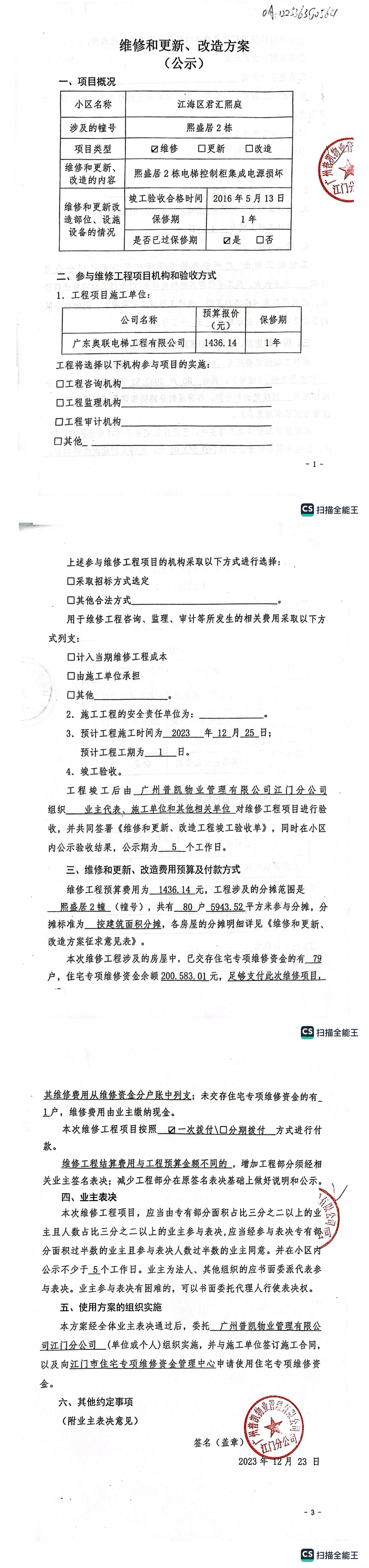 <td VALIGN="top" VALUES="" STYLE="border-width:0" BINDTYPE="0" ROWSPAN="19" COLSPAN="7" DATASOURCE="投票结果" ><font style="font-size:14pt;"><p style="white-space: normal; font-family: 宋体; line-height: 1.75em;">江海区君汇熙庭江海区君汇熙庭熙盛居2幢全体业主:</p><p style="white-space: normal; font-family: 宋体; line-height: 1.75em; text-indent: 2em;">本小区关于江海区君汇熙庭熙盛居 2 栋电梯更换控制柜集成电源使用维修资金的投票的投票已表决结束,询异时间从2024年01月21日开始,投票询异公示期间,业主可通过微信查询自己的表决情况或可凭身份证件申请查询自己的表决情况;如公示的业主表决情况与查询的本人表决意见不一致的,可以以书面形式向投票组织机构申诉,投票组织机构予以纠正并重新公示表决结果。异议提出人对投票组织机构的处理仍有异议的,可以向街道办事处(镇人民政府)反映处理,涉及住宅专项维修资金的,可向属地住宅专项维修资金管理中心反映处理。</p><p style="white-space: normal;"><br/></p><p style="white-space: normal; font-family: 宋体; line-height: 1.75em;"><strong>附件:</strong></p><p style="white-space: normal; font-family: 宋体; line-height: 1.75em;"><strong>一、投票范围</strong></p><p style="white-space: normal; font-family: 宋体; line-height: 1.75em; text-indent: 2em;">江海区君汇熙庭江海区君汇熙庭熙盛居2幢</p><p style="white-space: normal; font-family: 宋体; line-height: 1.75em; text-indent: 2em;">总人数(专有部分人数之和):79</p><p style="white-space: normal; font-family: 宋体; line-height: 1.75em; text-indent: 2em;"><span style="font-family: 宋体, SimSun;"><span style="font-family: 宋体; text-indent: 32px;"><span style="font-family: 宋体; text-indent: 32px;">总户数:80</span></span></span></p><p style="white-space: normal; font-family: 宋体; line-height: 1.75em; text-indent: 2em;">建筑物总面积(专有部分面积之和):5943.52㎡</p><p style="white-space: normal; font-family: 宋体; line-height: 1.75em;"><strong>二、询异公示起止时间</strong></p><p dir="ltr" style="white-space: normal; font-family: 宋体; line-height: 1.75em; text-indent: 2em;"><span style="text-indent: 36px;">2024年01月21日至2024年01月27日</span></p><p style="white-space: normal; font-family: 宋体; line-height: 1.75em;"><strong>三、投票详细描述</strong></p><p style="white-space: normal; font-family: 宋体; line-height: 1.75em; text-indent: 2em;"><p>本小区10幢的货梯日常运行时无反应,经检查,是由于货梯控制柜集成电源损坏,导致通电故障电梯不能正常运行,已过保修期。现需申请使用维修资金对10幢货梯进行维修,工程维修预算金额为1436.14元,项目最终费用以施工合同签订金额为准。维修费用的分摊标准为 按建筑面积分摊每平方约0.242元,详见公示附件。如业主手机不能正常通过微信投票,请联系物业公司进行线下纸质投票,物业电话:0750-3825113</p></p><p style="white-space: normal; font-family: 宋体; line-height: 1.75em;"><strong>四、计票规则</strong></p><p style="white-space: normal; font-family: 宋体; line-height: 1.75em; text-indent: 2em;">表决事项:使用建筑物及其附属设施的维修资金<br /><p style='text-align: left; font-family: 宋体; font-size: 16px; line-height: 1.75em; text-indent: 2em;'>计票规则:弃权票不并入其它项 未表决票不并入其它项</p></p><p style="white-space: normal; font-family: 宋体; line-height: 1.75em;"><strong>五、通过规则</strong></p><p style="white-space: normal; font-family: 宋体; line-height: 1.75em;"><strong><strong style="white-space: normal;"><span style="font-family: 宋体, SimSun;"> 根据《中华人民共和国民法典》第二百七十八条规定:业主共同决定事项,应当由专有部分面积占比三分之二以上的业主且人数占比三分之二以上的业主参与表决。</span></strong></strong></p><p style="white-space: normal; font-family: 宋体; line-height: 1.75em; text-indent: 2em;">表决事项:使用建筑物及其附属设施的维修资金<br /><p style='text-align: left; font-family: 宋体; font-size: 16px; line-height: 1.75em; text-indent: 2em;'>通过规则:参与表决专有部分面积过半数的业主且参与表决人数过半数的业主同意</p></p><p style="white-space: normal; font-family: 宋体; line-height: 1.75em;"><strong>六、投票结果</strong></p><p style="white-space: normal; font-family: 宋体; line-height: 1.75em; text-indent: 2em;"><div id='resultTable'><table style='table-layout: fixed; font-size:12px; margin-top:10px' width='100%' border='0' cellspacing='0' cellpadding='0'><tr><td height='28' colspan='10' align='center' style='border: 1px solid #666'><strong style='font-size: 14px;'> 使用建筑物及其附属设施的维修资金</strong></td> </tr><tr id='trfirst'><td height='28' colspan='4' style='border-left: 1px solid #666; border-bottom: 1px solid #666'><strong> 申报单位:</strong> 广州普凯物业管理有限公司江门分公司</td><td colspan='3' style='border-left: 1px solid #666; border-bottom: 1px solid #666'><strong> 联系方式:</strong> </td><td colspan='3' style='border-left: 1px solid #666; border-bottom: 1px solid #666; border-right: 1px solid #666'><strong> 申报日期:</strong> 2024年1月3日 </td></tr><tr> <td height='28' colspan='5' style='border-left: 1px solid #666; border-bottom: 1px solid #666'><strong> 总人数(专有部分人数之和):</strong>79人 </td><td colspan='5' style='border-left: 1px solid #666; border-bottom: 1px solid #666; border-right: 1px solid #666'><strong> 建筑物总面积(专有部分面积之和):</strong>5943.52㎡ </td> </tr><tr><td height='28' colspan='10' style='border: 1px solid #666'><strong> 该事项表决是否通过:通过(选项为:A:同意)</strong></td></tr><tr><td