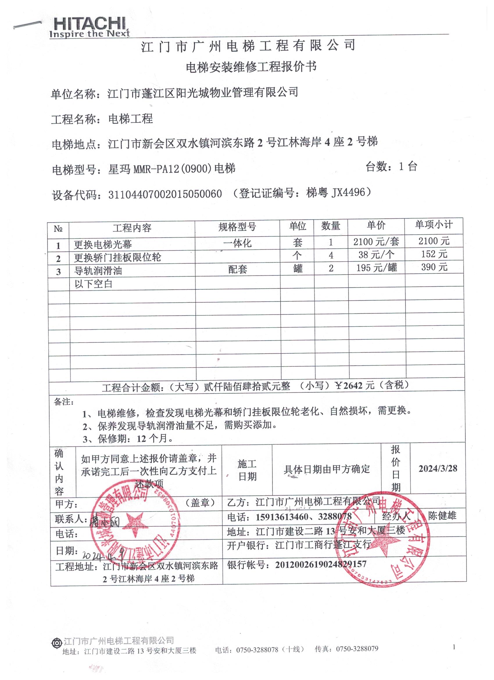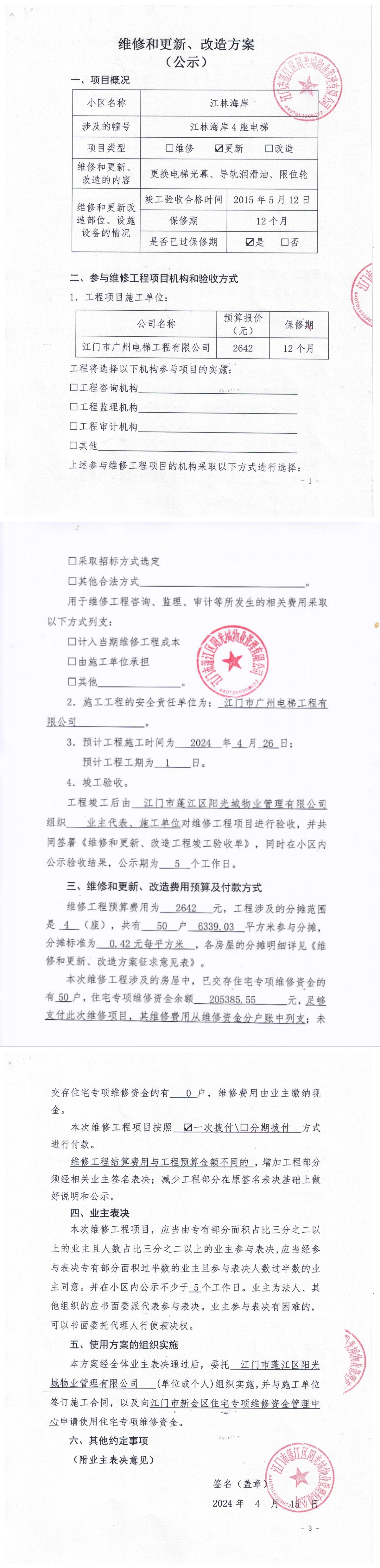 <td VALIGN="top" VALUES="" STYLE="border-width:0" BINDTYPE="0" ROWSPAN="18" COLSPAN="7" DATASOURCE="投票内容" ><font style="font-size:12pt;"><p style="text-align: left; font-family: 宋体; font-size: 16px; line-height: 1.75em;"><strong style="text-align: left; line-height: 1.75em;">一、投票范围</strong><br/></p><p style="white-space: normal; font-family: 宋体; font-size: 16px; line-height: 1.75em; text-indent: 2em;">江林海岸江林海岸4座</p><p style="white-space: normal; font-family: 宋体; font-size: 16px; line-height: 1.75em; text-indent: 2em;">总人数(专有部分人数之和):46</p><p style="white-space: normal; font-family: 宋体; font-size: 16px; line-height: 1.75em; text-indent: 2em;"><span style="font-family: 宋体; text-indent: 32px;">总户数:50</span></p><p style="white-space: normal; font-family: 宋体; font-size: 16px; line-height: 1.75em; text-indent: 2em;">建筑物总面积(专有部分面积之和):6339.03㎡</p><p style="white-space: normal; font-family: 宋体;font-size: 16px; line-height: 1.75em;"><strong>二、投票起止时间</strong></p><p style="white-space: normal; font-family: 宋体; font-size: 16px; line-height: 1.75em; text-indent: 2em;">投票表决时间:从2024年04月22日到2024年04月26日止</p><p style="white-space: normal; font-family: 宋体; font-size: 16px; line-height: 1.75em; text-indent: 2em;">投票询异公示时间:从2024年04月27日开始</p><p style="white-space: normal; font-family: 宋体; font-size: 16px; line-height: 1.75em; text-indent: 2em;">投票结果通知公告时间:从2024年05月04日开始</p><p style="white-space: normal; font-family: 宋体;font-size: 16px; line-height: 1.75em;"><strong>三、投票详细描述</strong></p><p style="white-space: normal; font-family: 宋体; font-size: 16px; line-height: 1.75em; text-indent: 2em;"><p>&nbsp; 小区4座的2号电梯日常运行时电梯门经常关不上门导致运行不了,运行时出现异响声,经检查是由于电梯光幕和挂板限位轮老化损坏,同时检查发现导轨润滑油量不足导致发出异声。<br/></p><p>&nbsp; 现对4座的2号电梯进行更换光幕、限位轮、导轨油,工程预算金额2642元,项目最终费用以施工合同签订金额为准。因已过保修期,维修费用由相关业主按建筑面积分摊,每平方约0.42元,详见公示附件。如业主手机不能正常通过微信投票,请联系物业公司进行线下纸质投票,物业电话:0750-6412233。</p></p><p style="white-space: normal; font-family: 宋体;font-size: 16px; line-height: 1.75em;"><strong>四、计票规则</strong></p><p style="white-space: normal; font-family: 宋体; font-size: 16px; line-height: 1.75em; text-indent: 2em;"><span style="font-family: 宋体; text-indent: 32px;">表决事项:使用建筑物及其附属设施的维修资金<br /><p style='text-align: left; font-family: 宋体; font-size: 16px; line-height: 1.75em; text-indent: 2em;'>计票规则:弃权票不并入其它项&nbsp;&nbsp;&nbsp;&nbsp;未表决票不并入其它项</p></span></p><p style="white-space: normal; font-family: 宋体;font-size: 16px; line-height: 1.75em;"><strong>五、通过规则</strong></p><p style="white-space: normal; font-family: 宋体;font-size: 16px; line-height: 1.75em;"><strong>&nbsp; 根据《中华人民共和国民法典》第二百七十八条规定:业主共同决定事项,应当由专有部分面积占比三分之二以上的业主且人数占比三分之二以上的业主参与表决。</strong></p><p style="white-space: normal; font-family: 宋体; font-size: 16px; line-height: 1.75em; text-indent: 2em;"><span style="font-family: 宋体; text-indent: 32px;">表决事项:使用建筑物及其附属设施的维修资金<br /><p style='text-align: left; font-family: 宋体; font-size: 16px; line-height: 1.75em; text-indent: 2em;'>通过规则:双2/3以上参与表决,参与表决双过半同意</p></span><span style="font-family: 宋体; text-indent: 32px;"></span></p><p style="text-align: left; font-family: 宋体; font-size: 16px; line-height: 1.75em;"><strong>六、投票方式</strong></p><p style="text-align: left; font-family: 宋体; font-size: 16px; line-height: 1.75em; text-indent: 2em;"><span style="font-size: 16px; font-family: 宋体">在投票事项通知公告日起,请业主扫描二维码或者关注微信公众号(<strong>江门住建易办事</strong>)查看详细情况并进行投票。</span></p><p style="text-align: center; font-family: 宋体; font-size: 16px; line-height: 1.75em; text-indent: 2em;"><span style="font-size: 16px; font-family: 宋体"><strong style="font-family: 宋体; text-align: center; white-space: normal; line-height: 1.75em;"><img src="http://jmzjj.jiangmen.cn:8071/Areas/Custom/Content/images/jmzjybs.jpg"/></strong></span></p><p style="text-align: right; font-family: 宋体; font-size: 16px; line-height: 1.75em; text-indent: 2em;"><span style="text-align: right;">申报单位(盖章):江门市蓬江区阳光城物业管理有限公司</span></p><p style="text-align: right; font-family: 宋体; font-size: 16px; line-height: 1.75em;">2024年04月22日</p></font></td>