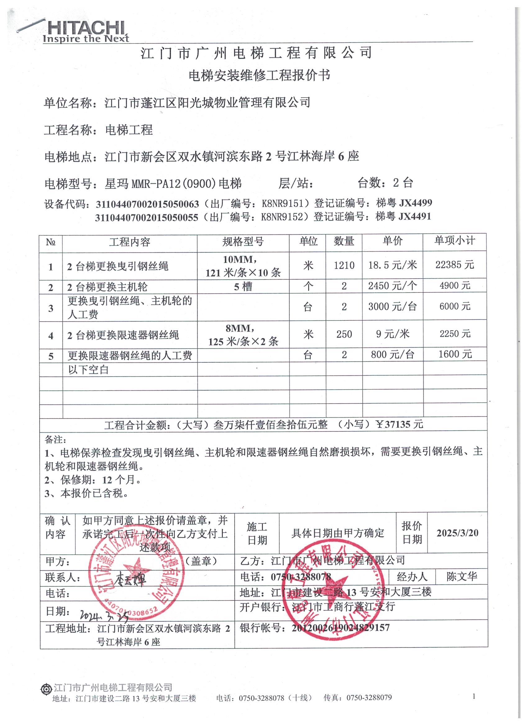 <td VALIGN="top" VALUES="" STYLE="border-width:0" BINDTYPE="0" ROWSPAN="19" COLSPAN="7" DATASOURCE="投票结果" ><font style="font-size:14pt;"><p style="white-space: normal; font-family: 宋体; line-height: 1.75em;">江林海岸江林海岸6座全体业主:</p><p style="white-space: normal; font-family: 宋体; line-height: 1.75em; text-indent: 2em;">本小区关于江林海岸6座1号电梯(梯粤JX4491)和2号电梯(梯粤JX4499)更换曳引钢丝绳、限速器钢丝绳及主机轮使用维修资金投票的投票已表决结束,询异时间从2025年05月27日开始,投票询异公示期间,业主可通过微信查询自己的表决情况或可凭身份证件申请查询自己的表决情况;如公示的业主表决情况与查询的本人表决意见不一致的,可以以书面形式向投票组织机构申诉,投票组织机构予以纠正并重新公示表决结果。异议提出人对投票组织机构的处理仍有异议的,可以向街道办事处(镇人民政府)反映处理,涉及住宅专项维修资金的,可向属地住宅专项维修资金管理中心反映处理。</p><p style="white-space: normal;"><br/></p><p style="white-space: normal; font-family: 宋体; line-height: 1.75em;"><strong>附件:</strong></p><p style="white-space: normal; font-family: 宋体; line-height: 1.75em;"><strong>一、投票范围</strong></p><p style="white-space: normal; font-family: 宋体; line-height: 1.75em; text-indent: 2em;">江林海岸江林海岸6座</p><p style="white-space: normal; font-family: 宋体; line-height: 1.75em; text-indent: 2em;">总人数(专有部分人数之和):62</p><p style="white-space: normal; font-family: 宋体; line-height: 1.75em; text-indent: 2em;"><span style="font-family: 宋体, SimSun;"><span style="font-family: 宋体; text-indent: 32px;"><span style="font-family: 宋体; text-indent: 32px;">总户数:68</span></span></span></p><p style="white-space: normal; font-family: 宋体; line-height: 1.75em; text-indent: 2em;">建筑物总面积(专有部分面积之和):6856.11㎡</p><p style="white-space: normal; font-family: 宋体; line-height: 1.75em;"><strong>二、询异公示起止时间</strong></p><p dir="ltr" style="white-space: normal; font-family: 宋体; line-height: 1.75em; text-indent: 2em;"><span style="text-indent: 36px;">2025年05月27日至2025年06月06日</span></p><p style="white-space: normal; font-family: 宋体; line-height: 1.75em;"><strong>三、投票详细描述</strong></p><p style="white-space: normal; font-family: 宋体; line-height: 1.75em; text-indent: 2em;"><p> 小区6座1号电梯(梯粤JX4491)和2号电梯(梯粤JX4499)在保养检查发现曳引钢丝绳、限速器钢丝绳和主机轮在日常使用中出现自然磨损损坏,钢丝绳拉伸过长、变细,钢丝绳直径比原来直径减少10%,已达到国家报废标准,钢丝绳直径减少会使电梯摩檫力减少其承载能力大幅下降存在安全隐患,钢丝绳拉伸过长会使电梯在运行时对重缓冲距离越来越小,压住液压缓冲器,会造成开关失效引起电梯故障,同时发现1号电梯因钢丝绳、主机轮磨损导致电梯在运行时有一根钢丝绳上行时紧,下行时松,建议尽快更换钢丝绳、主机轮。</p><p> 现对<span style="text-wrap: wrap;">6座1号电梯(梯粤JX4491)和2号电梯(梯粤JX4499)</span>更换曳引钢丝绳、限速器钢丝绳及主机轮,工程维修预算金额为37135元,项目最终费用以施工合同签订金额为准。因已过保修期,维修费用由相关业主按建筑面积分摊,每平方约5.42元,详见公示附件。如业主手机不能正常通过微信投票,请联系物业公司进行线下纸质投票,物业电话:0750-6412233。</p><p><br/></p></p><p style="white-space: normal; font-family: 宋体; line-height: 1.75em;"><strong>四、计票规则</strong></p><p style="white-space: normal; font-family: 宋体; line-height: 1.75em; text-indent: 2em;">表决事项:使用建筑物及其附属设施的维修资金<br /><p style='text-align: left; font-family: 宋体; font-size: 16px; line-height: 1.75em; text-indent: 2em;'>计票规则:弃权票不并入其它项 未表决票不并入其它项</p></p><p style="white-space: normal; font-family: 宋体; line-height: 1.75em;"><strong>五、通过规则</strong></p><p style="white-space: normal; font-family: 宋体; line-height: 1.75em;"><strong><strong style="white-space: normal;"><span style="font-family: 宋体, SimSun;"> 根据《中华人民共和国民法典》第二百七十八条规定:业主共同决定事项,应当由专有部分面积占比三分之二以上的业主且人数占比三分之二以上的业主参与表决。</span></strong></strong></p><p style="white-space: normal; font-family: 宋体; line-height: 1.75em; text-indent: 2em;">表决事项:使用建筑物及其附属设施的维修资金<br /><p style='text-align: left; font-family: 宋体; font-size: 16px; line-height: 1.75em; text-indent: 2em;'>通过规则:双2/3以上参与表决,参与表决双过半同意</p></p><p style="white-space: normal; font-family: 宋体; line-height: 1.75em;"><strong>六、投票结果</strong></p><p style="white-space: normal; font-family: 宋体; line-height: 1.75em; text-indent: 2em;"><div id='resultTable'><table style='table-layout: fixed; font-size:12px; margin-top:10px' width='100%' border='0' cellspacing='0' cellpadding='0'><tr><td height='28' colspan='10' align='center' style='border: 1px solid #666'><strong style='font-size: 14px;'> 使用建筑物及其附属设施的维修资金</strong></td> </tr><tr id='trfirst'><td height='28' colspan='4' style='border-left: 1px solid #666; border-bottom: 1px solid #666'><strong> 申报单位:</strong> 江门市蓬江区阳光城物业管理有限公司</td><td colspan='3' style='border-left: 1px solid #666; border-bottom: 1px solid #666'><strong> 联系方式:</strong> 3332898 </td><td colspan='3' style='border-left: 1px solid #666; border-bottom: 1px solid #666; bord