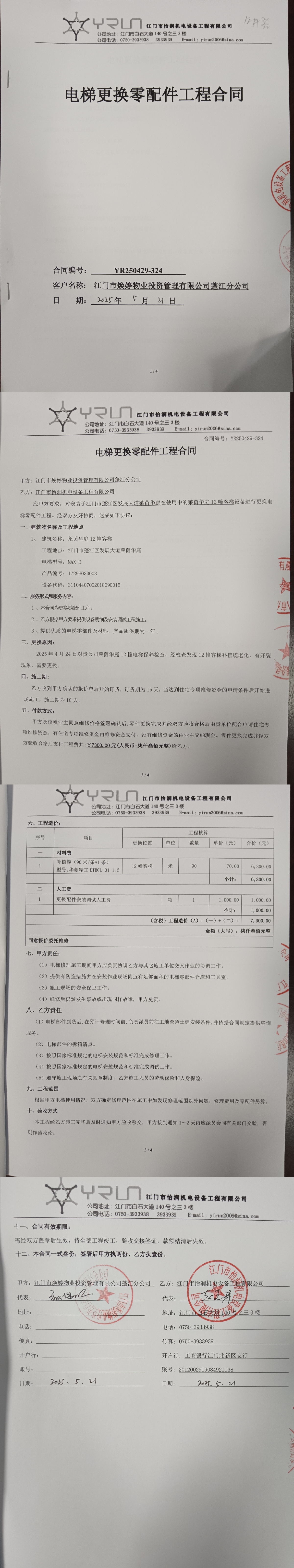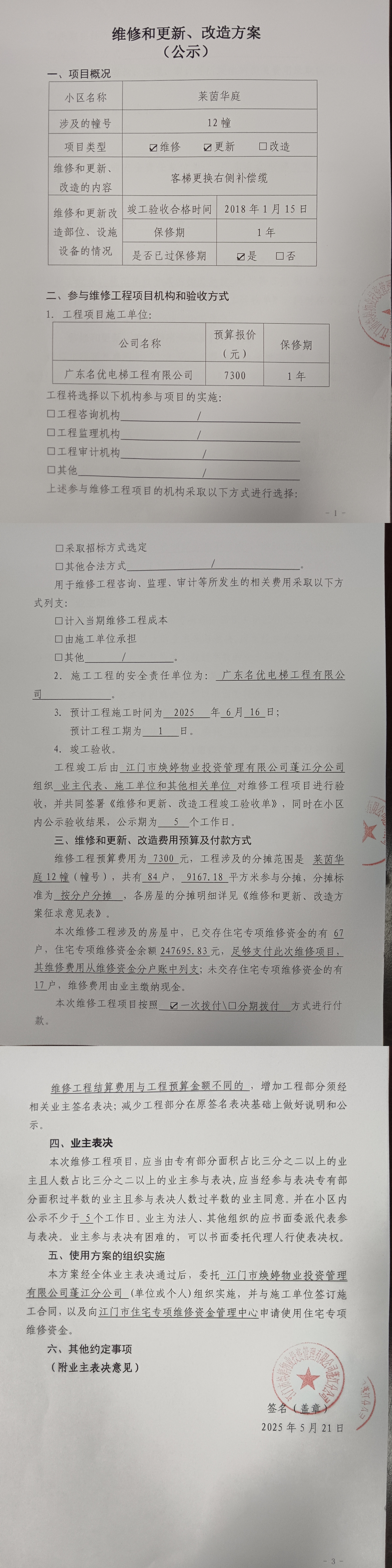 <td VALIGN="top" VALUES="" STYLE="border-width:0" BINDTYPE="0" ROWSPAN="18" COLSPAN="7" DATASOURCE="投票内容" ><font style="font-size:12pt;"><p style="text-align: left; font-family: 宋体; font-size: 16px; line-height: 1.75em;"><strong style="text-align: left; line-height: 1.75em;">一、投票范围</strong><br/></p><p style="white-space: normal; font-family: 宋体; font-size: 16px; line-height: 1.75em; text-indent: 2em;">莱茵华庭蓬江区莱茵华庭12幢</p><p style="white-space: normal; font-family: 宋体; font-size: 16px; line-height: 1.75em; text-indent: 2em;">总人数(专有部分人数之和):83</p><p style="white-space: normal; font-family: 宋体; font-size: 16px; line-height: 1.75em; text-indent: 2em;"><span style="font-family: 宋体; text-indent: 32px;">总户数:84</span></p><p style="white-space: normal; font-family: 宋体; font-size: 16px; line-height: 1.75em; text-indent: 2em;">建筑物总面积(专有部分面积之和):9167.18㎡</p><p style="white-space: normal; font-family: 宋体;font-size: 16px; line-height: 1.75em;"><strong>二、投票起止时间</strong></p><p style="white-space: normal; font-family: 宋体; line-height: 1.75em; text-indent: 2em;">投票表决时间:从2025年05月22日到2025年06月22日止</p><p style="white-space: normal; font-family: 宋体; line-height: 1.75em; text-indent: 2em;">投票补录时间:从2025年06月23日到2025年06月26日止</p><p style="white-space: normal; font-family: 宋体;font-size: 16px; line-height: 1.75em;"><strong>三、投票详细描述</strong></p><p style="white-space: normal; font-family: 宋体; font-size: 16px; line-height: 1.75em; text-indent: 2em;"><p>小区12幢的客梯在电梯维保人员对电梯保养检查时发现12幢客梯补偿缆(右侧)老化,有开裂现象;电梯暂时还可以使用,但开裂的位置在运行时容易发生折曲导致补偿缆会折断,引致其它零部件损坏和困人故障,需要更换电梯补偿缆才能保障电梯的正常运行。</p><p> 现对12幢客梯进行维修,工程维修预算金额为7300元,项目最终费用以施工合同签订金额为准。因已过保修期,维修费用由相关业主按分户分摊,每户约86.91元,详见公示附件。如业主手机不能正常通过微信投票,请联系物业公司进行线下纸质投票,物业电话:0750-3212633。</p><p><br style="font-family: &quot;Helvetica Neue&quot;, Helvetica, Arial, sans-serif; font-size: 14px; white-space: normal; background-color: rgb(255, 255, 255);"/></p><p><br/></p></p><p style="white-space: normal; font-family: 宋体;font-size: 16px; line-height: 1.75em;"><strong>四、计票规则</strong></p><p style="white-space: normal; font-family: 宋体; font-size: 16px; line-height: 1.75em; text-indent: 2em;"><span style="font-family: 宋体; text-indent: 32px;">表决事项:使用建筑物及其附属设施的维修资金<br /><p style='text-align: left; font-family: 宋体; font-size: 16px; line-height: 1.75em; text-indent: 2em;'>计票规则:弃权票不并入其它项&nbsp;&nbsp;&nbsp;&nbsp;未表决票不并入其它项</p></span></p><p style="white-space: normal; font-family: 宋体;font-size: 16px; line-height: 1.75em;"><strong>五、通过规则</strong></p><p style="white-space: normal; font-family: 宋体;font-size: 16px; line-height: 1.75em;"><strong>&nbsp; 根据《中华人民共和国民法典》第二百七十八条规定:业主共同决定事项,应当由专有部分面积占比三分之二以上的业主且人数占比三分之二以上的业主参与表决。</strong></p><p style="white-space: normal; font-family: 宋体; font-size: 16px; line-height: 1.75em; text-indent: 2em;"><span style="font-family: 宋体; text-indent: 32px;">表决事项:使用建筑物及其附属设施的维修资金<br /><p style='text-align: left; font-family: 宋体; font-size: 16px; line-height: 1.75em; text-indent: 2em;'>通过规则:双2/3以上参与表决,参与表决双过半同意</p></span><span style="font-family: 宋体; text-indent: 32px;"></span></p><p style="text-align: left; font-family: 宋体; font-size: 16px; line-height: 1.75em;"><strong>六、投票方式</strong></p><p style="text-align: left; font-family: 宋体; font-size: 16px; line-height: 1.75em; text-indent: 2em;"><span style="font-size: 16px; font-family: 宋体">在投票事项通知公告日起,请业主扫描二维码或者关注微信公众号(<strong>江门住建</strong>)查看详细情况并进行投票。</span></p><p style="text-align: center; font-family: 宋体; font-size: 16px; line-height: 1.75em; text-indent: 2em;"><span style="font-size: 16px; font-family: 宋体"><strong style="font-family: 宋体; text-align: center; white-space: normal; line-height: 1.75em;"><img src="http://jmzjj.jiangmen.cn:8071/Areas/Custom/Content/images/jmzjybs.jpg"/></strong></span></p><p style="text-align: right; font-family: 宋体; font-size: 16px; line-height: 1.75em; text-indent: 2em;"><span style="text-align: right;">申报单位(盖章):江门市焕婷物业投资管理有限公司蓬江分公司</span></p><p style="text-align: right; font-family: 宋体; font-size: 16px; line-height: 1.75em;">2025年05月22日</p></font></td>