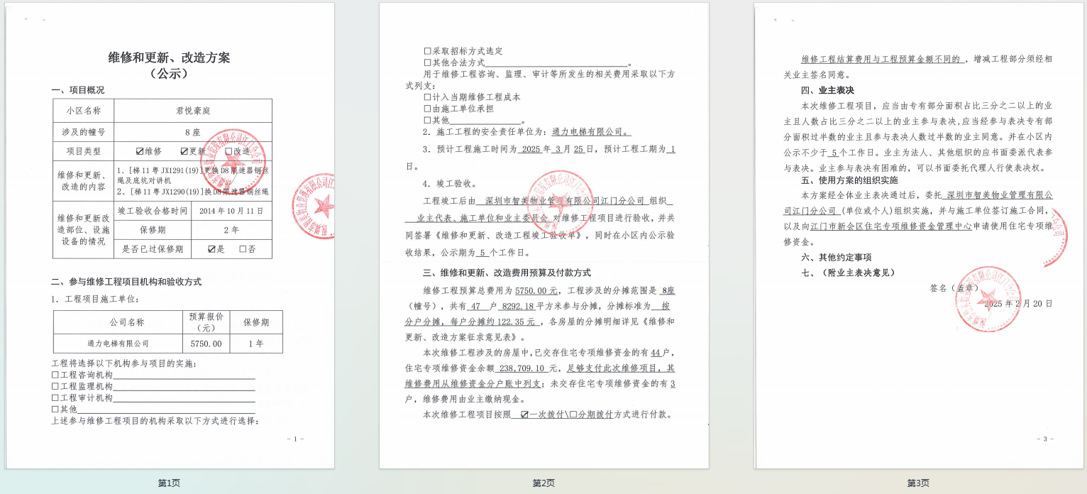 <td VALIGN="top" VALUES="" STYLE="border-width:0" BINDTYPE="0" ROWSPAN="18" COLSPAN="7" DATASOURCE="投票内容" ><font style="font-size:12pt;"><p style="text-align: left; font-family: 宋体; font-size: 16px; line-height: 1.75em;"><strong style="text-align: left; line-height: 1.75em;">一、投票范围</strong><br/></p><p style="white-space: normal; font-family: 宋体; font-size: 16px; line-height: 1.75em; text-indent: 2em;">君悦豪庭君悦豪庭8座</p><p style="white-space: normal; font-family: 宋体; font-size: 16px; line-height: 1.75em; text-indent: 2em;">总人数(专有部分人数之和):47</p><p style="white-space: normal; font-family: 宋体; font-size: 16px; line-height: 1.75em; text-indent: 2em;"><span style="font-family: 宋体; text-indent: 32px;">总户数:47</span></p><p style="white-space: normal; font-family: 宋体; font-size: 16px; line-height: 1.75em; text-indent: 2em;">建筑物总面积(专有部分面积之和):8292.18㎡</p><p style="white-space: normal; font-family: 宋体;font-size: 16px; line-height: 1.75em;"><strong>二、投票起止时间</strong></p><p style="white-space: normal; font-family: 宋体; line-height: 1.75em; text-indent: 2em;">投票表决时间:从2025年02月21日到2025年03月14日止</p><p style="white-space: normal; font-family: 宋体; line-height: 1.75em; text-indent: 2em;">投票补录时间:从2025年03月15日到2025年03月19日止</p><p style="white-space: normal; font-family: 宋体;font-size: 16px; line-height: 1.75em;"><strong>三、投票详细描述</strong></p><p style="white-space: normal; font-family: 宋体; font-size: 16px; line-height: 1.75em; text-indent: 2em;"><p>本小区8座电梯2台电梯[梯11粤JX1291(19)]、[梯11粤JX1290(19)]限速器钢丝绳生锈,经检查是由于使用时间较长,限速器钢丝绳磨损、老化,存在安全隐患,同时[梯11粤JX1291(19)]底坑对讲机损坏,影响通讯,两台电梯已过保修期。现需申请使用维修资紧对本小区8座电梯2台电梯以下部件进行更新维修:</p><p>1、[梯11粤JX1291(19)]更换D8限速器钢丝绳127米及底坑对讲机</p><p>2、[梯11粤JX1290(19)]换D8限速器钢丝绳134米</p><p>工程维修预算金额为5750.00 元,项目最终费用以施工合同签订金额为准。维修费用的分摊标准为按分户分摊,楼栋共47户,每户分摊约122.35元,详见公示附件。如业主手机不能正常通过微信投票,请联系物业公司进行线下纸质投票,物业电话:13555625107,管家电话: 18128218709。</p><p><br/></p></p><p style="white-space: normal; font-family: 宋体;font-size: 16px; line-height: 1.75em;"><strong>四、计票规则</strong></p><p style="white-space: normal; font-family: 宋体; font-size: 16px; line-height: 1.75em; text-indent: 2em;"><span style="font-family: 宋体; text-indent: 32px;">表决事项:使用建筑物及其附属设施的维修资金<br /><p style='text-align: left; font-family: 宋体; font-size: 16px; line-height: 1.75em; text-indent: 2em;'>计票规则:弃权票不并入其它项&nbsp;&nbsp;&nbsp;&nbsp;未表决票不并入其它项</p></span></p><p style="white-space: normal; font-family: 宋体;font-size: 16px; line-height: 1.75em;"><strong>五、通过规则</strong></p><p style="white-space: normal; font-family: 宋体;font-size: 16px; line-height: 1.75em;"><strong>&nbsp; 根据《中华人民共和国民法典》第二百七十八条规定:业主共同决定事项,应当由专有部分面积占比三分之二以上的业主且人数占比三分之二以上的业主参与表决。</strong></p><p style="white-space: normal; font-family: 宋体; font-size: 16px; line-height: 1.75em; text-indent: 2em;"><span style="font-family: 宋体; text-indent: 32px;">表决事项:使用建筑物及其附属设施的维修资金<br /><p style='text-align: left; font-family: 宋体; font-size: 16px; line-height: 1.75em; text-indent: 2em;'>通过规则:双2/3以上参与表决,参与表决双过半同意</p></span><span style="font-family: 宋体; text-indent: 32px;"></span></p><p style="text-align: left; font-family: 宋体; font-size: 16px; line-height: 1.75em;"><strong>六、投票方式</strong></p><p style="text-align: left; font-family: 宋体; font-size: 16px; line-height: 1.75em; text-indent: 2em;"><span style="font-size: 16px; font-family: 宋体">在投票事项通知公告日起,请业主扫描二维码或者关注微信公众号(<strong>江门住建易办事</strong>)查看详细情况并进行投票。</span></p><p style="text-align: center; font-family: 宋体; font-size: 16px; line-height: 1.75em; text-indent: 2em;"><span style="font-size: 16px; font-family: 宋体"><strong style="font-family: 宋体; text-align: center; white-space: normal; line-height: 1.75em;"><img src="http://jmzjj.jiangmen.cn:8071/Areas/Custom/Content/images/jmzjybs.jpg"/></strong></span></p><p style="text-align: right; font-family: 宋体; font-size: 16px; line-height: 1.75em; text-indent: 2em;"><span style="text-align: right;">申报单位(盖章):深圳市智美物业管理有限公司江门分公司</span></p><p style="text-align: right; font-family: 宋体; font-size: 16px; line-height: 1.75em;">2025年02月21日</p></font></td>