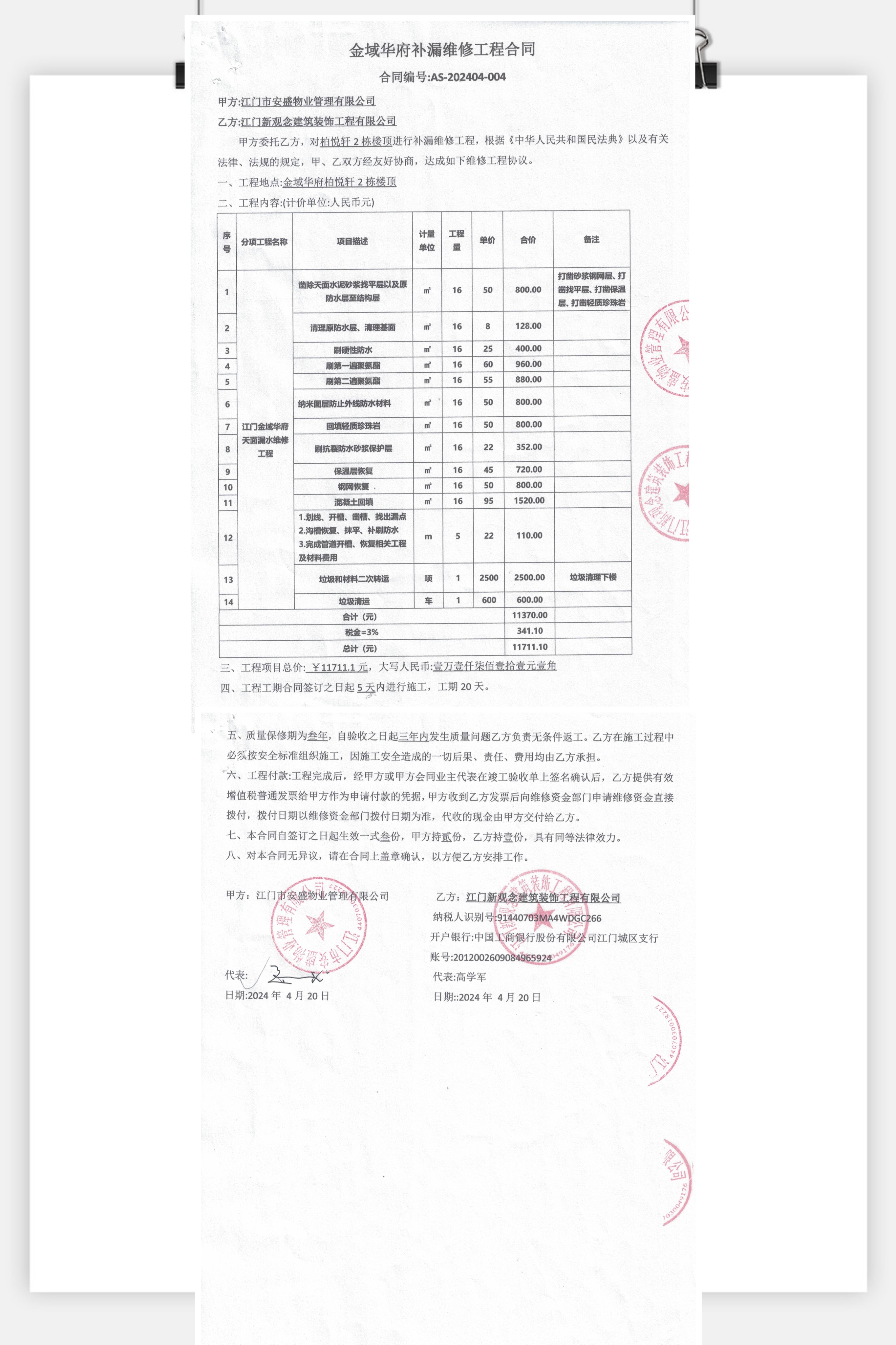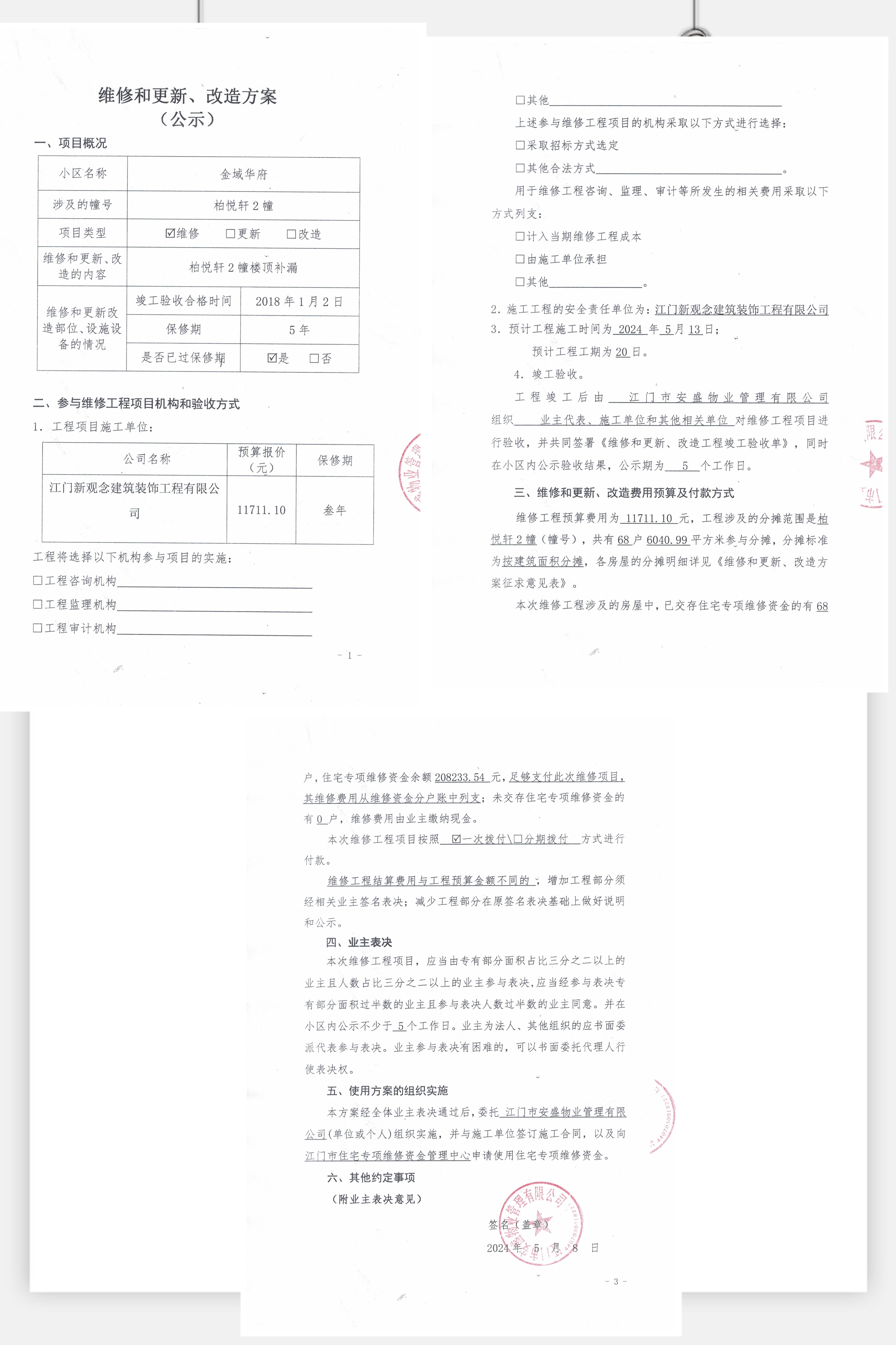 <td VALIGN="top" VALUES="" STYLE="border-width:0" BINDTYPE="0" ROWSPAN="19" COLSPAN="7" DATASOURCE="投票结果" ><font style="font-size:14pt;"><p style="white-space: normal; font-family: 宋体; line-height: 1.75em;">金域华府江门市蓬江区金域华府柏悦轩2幢全体业主:</p><p style="white-space: normal; font-family: 宋体; line-height: 1.75em; text-indent: 2em;">本小区关于金域华府小区柏悦轩2幢楼顶补漏维修工程使用维修资金的投票的投票已表决结束,询异时间从2024年07月01日开始,投票询异公示期间,业主可通过微信查询自己的表决情况或可凭身份证件申请查询自己的表决情况;如公示的业主表决情况与查询的本人表决意见不一致的,可以以书面形式向投票组织机构申诉,投票组织机构予以纠正并重新公示表决结果。异议提出人对投票组织机构的处理仍有异议的,可以向街道办事处(镇人民政府)反映处理,涉及住宅专项维修资金的,可向属地住宅专项维修资金管理中心反映处理。</p><p style="white-space: normal;"><br/></p><p style="white-space: normal; font-family: 宋体; line-height: 1.75em;"><strong>附件:</strong></p><p style="white-space: normal; font-family: 宋体; line-height: 1.75em;"><strong>一、投票范围</strong></p><p style="white-space: normal; font-family: 宋体; line-height: 1.75em; text-indent: 2em;">金域华府江门市蓬江区金域华府柏悦轩2幢</p><p style="white-space: normal; font-family: 宋体; line-height: 1.75em; text-indent: 2em;">总人数(专有部分人数之和):67</p><p style="white-space: normal; font-family: 宋体; line-height: 1.75em; text-indent: 2em;"><span style="font-family: 宋体, SimSun;"><span style="font-family: 宋体; text-indent: 32px;"><span style="font-family: 宋体; text-indent: 32px;">总户数:68</span></span></span></p><p style="white-space: normal; font-family: 宋体; line-height: 1.75em; text-indent: 2em;">建筑物总面积(专有部分面积之和):6040.99㎡</p><p style="white-space: normal; font-family: 宋体; line-height: 1.75em;"><strong>二、询异公示起止时间</strong></p><p dir="ltr" style="white-space: normal; font-family: 宋体; line-height: 1.75em; text-indent: 2em;"><span style="text-indent: 36px;">2024年07月01日至2024年07月07日</span></p><p style="white-space: normal; font-family: 宋体; line-height: 1.75em;"><strong>三、投票详细描述</strong></p><p style="white-space: normal; font-family: 宋体; line-height: 1.75em; text-indent: 2em;"><p>小区柏悦轩2幢楼顶渗水,现对该幢楼顶进行维修,因开发商5年保修期已过,需启用维修资金进行维修,工程维修预算金额为¥11711.10元,项目最终费用以施工合同签订金额为准。维修费用由本幢业主按建筑面积分摊,每平方约1.94元,具体金额详见公示附件。如业主手机不能正常通过微信投票,请联系物业公司进行线下纸质投票,物业电话:0750-3303688</p></p><p style="white-space: normal; font-family: 宋体; line-height: 1.75em;"><strong>四、计票规则</strong></p><p style="white-space: normal; font-family: 宋体; line-height: 1.75em; text-indent: 2em;">表决事项:使用建筑物及其附属设施的维修资金<br /><p style='text-align: left; font-family: 宋体; font-size: 16px; line-height: 1.75em; text-indent: 2em;'>计票规则:弃权票不并入其它项 未表决票不并入其它项</p></p><p style="white-space: normal; font-family: 宋体; line-height: 1.75em;"><strong>五、通过规则</strong></p><p style="white-space: normal; font-family: 宋体; line-height: 1.75em;"><strong><strong style="white-space: normal;"><span style="font-family: 宋体, SimSun;"> 根据《中华人民共和国民法典》第二百七十八条规定:业主共同决定事项,应当由专有部分面积占比三分之二以上的业主且人数占比三分之二以上的业主参与表决。</span></strong></strong></p><p style="white-space: normal; font-family: 宋体; line-height: 1.75em; text-indent: 2em;">表决事项:使用建筑物及其附属设施的维修资金<br /><p style='text-align: left; font-family: 宋体; font-size: 16px; line-height: 1.75em; text-indent: 2em;'>通过规则:双2/3以上参与表决,参与表决双过半同意</p></p><p style="white-space: normal; font-family: 宋体; line-height: 1.75em;"><strong>六、投票结果</strong></p><p style="white-space: normal; font-family: 宋体; line-height: 1.75em; text-indent: 2em;"><div id='resultTable'><table style='table-layout: fixed; font-size:12px; margin-top:10px' width='100%' border='0' cellspacing='0' cellpadding='0'><tr><td height='28' colspan='10' align='center' style='border: 1px solid #666'><strong style='font-size: 14px;'> 使用建筑物及其附属设施的维修资金</strong></td> </tr><tr id='trfirst'><td height='28' colspan='4' style='border-left: 1px solid #666; border-bottom: 1px solid #666'><strong> 申报单位:</strong> 江门市安盛物业管理有限公司</td><td colspan='3' style='border-left: 1px solid #666; border-bottom: 1px solid #666'><strong> 联系方式:</strong> 3303688 </td><td colspan='3' style='border-left: 1px solid #666; border-bottom: 1px solid #666; border-right: 1px solid #666'><strong> 申报日期:</strong> 2024年5月16日 </td></tr><tr> <td height='28' colspan='5' style='border-left: 1px solid #666; border-bottom: 1px solid #666'><strong> 总人数(专有部分人数之和):</strong>67人 </td><td colspan='5' style='border-left: 1px solid #666; border-bottom: 1px solid #666; border-right: 1px solid #666'><strong> 建筑物总面积(专有部分面积之和):</strong>6040.99㎡ </td> </tr><tr><td height='28' colspan='10' bgcolor='#F3F3F3' style='border-left: 1px solid #666;border-bottom: 1px solid #666;border-right: 1px solid #666'><strong> 参与人数及面积统计</strong></td></tr><tr><td height='28' colspan='5' style='border-left: 1px solid #666; border-bottom: 1px so