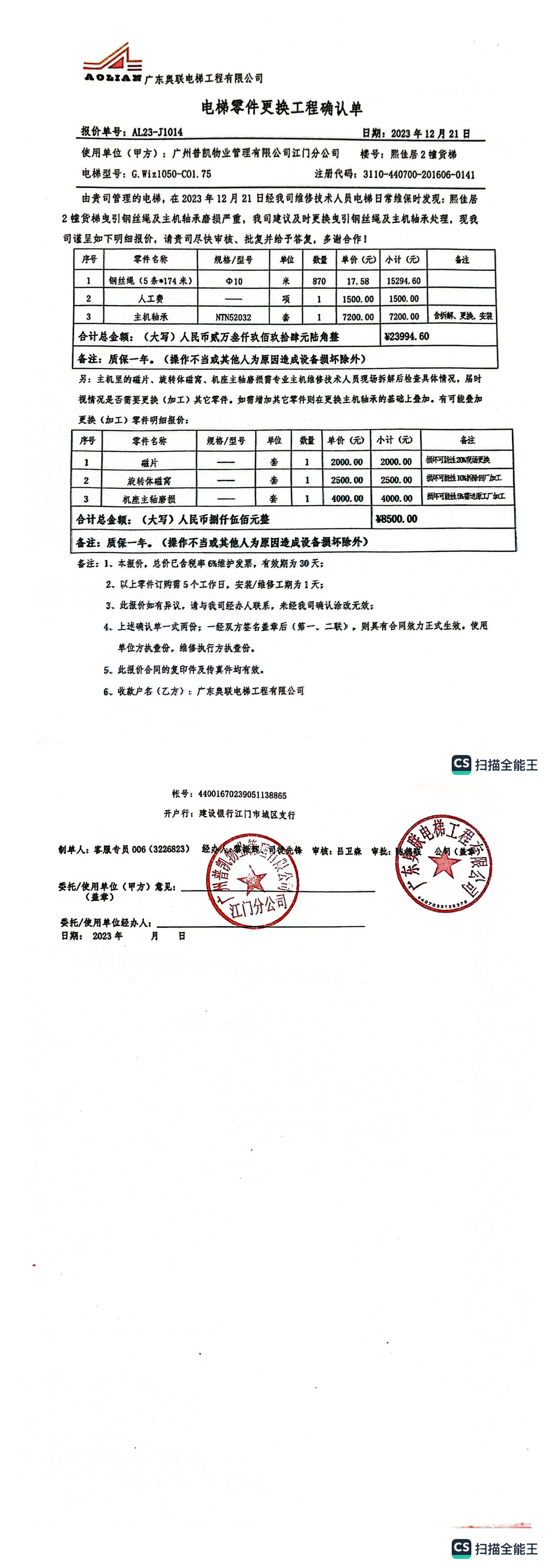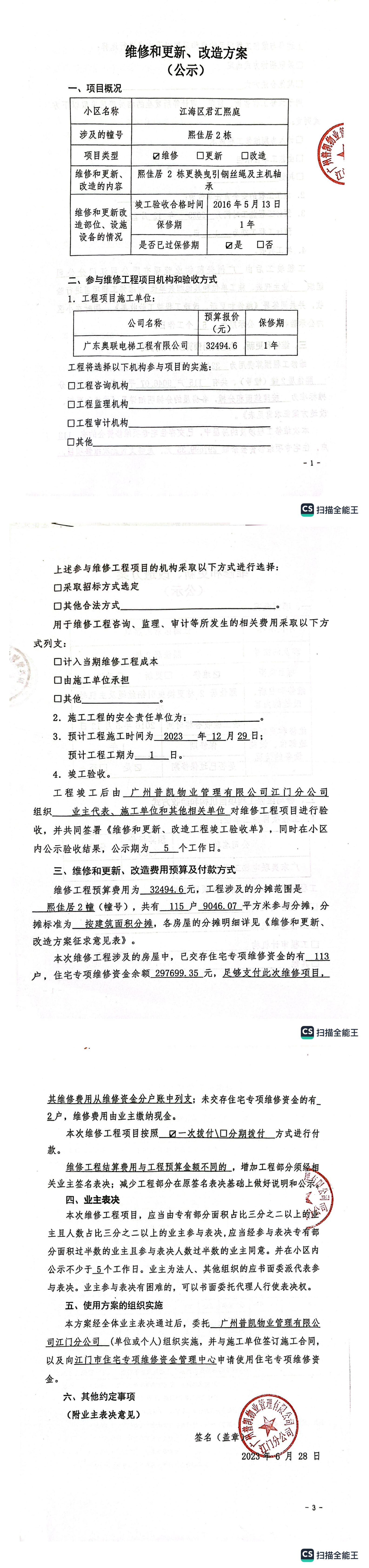 <td VALIGN="top" VALUES="" STYLE="border-width:0" BINDTYPE="0" ROWSPAN="19" COLSPAN="7" DATASOURCE="投票结果" ><font style="font-size:14pt;"><p style="white-space: normal; font-family: 宋体; line-height: 1.75em;">江海区君汇熙庭江海区君汇熙庭熙佳居2幢全体业主:</p><p style="white-space: normal; font-family: 宋体; line-height: 1.75em; text-indent: 2em;">本小区关于江海区君汇熙庭熙佳居 2 栋电梯更换曳引钢丝绳及主机轴承的投票已表决结束,询异时间从2024年01月13日开始,投票询异公示期间,业主可通过微信查询自己的表决情况或可凭身份证件申请查询自己的表决情况;如公示的业主表决情况与查询的本人表决意见不一致的,可以以书面形式向投票组织机构申诉,投票组织机构予以纠正并重新公示表决结果。异议提出人对投票组织机构的处理仍有异议的,可以向街道办事处(镇人民政府)反映处理,涉及住宅专项维修资金的,可向属地住宅专项维修资金管理中心反映处理。</p><p style="white-space: normal;"><br/></p><p style="white-space: normal; font-family: 宋体; line-height: 1.75em;"><strong>附件:</strong></p><p style="white-space: normal; font-family: 宋体; line-height: 1.75em;"><strong>一、投票范围</strong></p><p style="white-space: normal; font-family: 宋体; line-height: 1.75em; text-indent: 2em;">江海区君汇熙庭江海区君汇熙庭熙佳居2幢</p><p style="white-space: normal; font-family: 宋体; line-height: 1.75em; text-indent: 2em;">总人数(专有部分人数之和):115</p><p style="white-space: normal; font-family: 宋体; line-height: 1.75em; text-indent: 2em;"><span style="font-family: 宋体, SimSun;"><span style="font-family: 宋体; text-indent: 32px;"><span style="font-family: 宋体; text-indent: 32px;">总户数:115</span></span></span></p><p style="white-space: normal; font-family: 宋体; line-height: 1.75em; text-indent: 2em;">建筑物总面积(专有部分面积之和):9046.07㎡</p><p style="white-space: normal; font-family: 宋体; line-height: 1.75em;"><strong>二、询异公示起止时间</strong></p><p dir="ltr" style="white-space: normal; font-family: 宋体; line-height: 1.75em; text-indent: 2em;"><span style="text-indent: 36px;">2024年01月13日至2024年01月19日</span></p><p style="white-space: normal; font-family: 宋体; line-height: 1.75em;"><strong>三、投票详细描述</strong></p><p style="white-space: normal; font-family: 宋体; line-height: 1.75em; text-indent: 2em;"><p>本小区12幢的货梯日常运行时无反应,经检查,是由于货梯曳引钢丝绳及主机轴承损坏,电梯不能正常运行,已过保修期。现需申请使用维修资金对12幢货梯进行维修,工程维修预算金额为32494.6元,项目最终费用以施工合同签订金额为准。维修费用的分摊标准为 按建筑面积分摊每平方约3.59元,详见公示附件。如业主手机不能正常通过微信投票,请联系物业公司进行线下纸质投票,物业电话:0750-3825113</p></p><p style="white-space: normal; font-family: 宋体; line-height: 1.75em;"><strong>四、计票规则</strong></p><p style="white-space: normal; font-family: 宋体; line-height: 1.75em; text-indent: 2em;">表决事项:使用建筑物及其附属设施的维修资金<br /><p style='text-align: left; font-family: 宋体; font-size: 16px; line-height: 1.75em; text-indent: 2em;'>计票规则:弃权票不并入其它项 未表决票不并入其它项</p></p><p style="white-space: normal; font-family: 宋体; line-height: 1.75em;"><strong>五、通过规则</strong></p><p style="white-space: normal; font-family: 宋体; line-height: 1.75em;"><strong><strong style="white-space: normal;"><span style="font-family: 宋体, SimSun;"> 根据《中华人民共和国民法典》第二百七十八条规定:业主共同决定事项,应当由专有部分面积占比三分之二以上的业主且人数占比三分之二以上的业主参与表决。</span></strong></strong></p><p style="white-space: normal; font-family: 宋体; line-height: 1.75em; text-indent: 2em;">表决事项:使用建筑物及其附属设施的维修资金<br /><p style='text-align: left; font-family: 宋体; font-size: 16px; line-height: 1.75em; text-indent: 2em;'>通过规则:参与表决专有部分面积过半数的业主且参与表决人数过半数的业主同意</p></p><p style="white-space: normal; font-family: 宋体; line-height: 1.75em;"><strong>六、投票结果</strong></p><p style="white-space: normal; font-family: 宋体; line-height: 1.75em; text-indent: 2em;"><div id='resultTable'><table style='table-layout: fixed; font-size:12px; margin-top:10px' width='100%' border='0' cellspacing='0' cellpadding='0'><tr><td height='28' colspan='10' align='center' style='border: 1px solid #666'><strong style='font-size: 14px;'> 使用建筑物及其附属设施的维修资金</strong></td> </tr><tr id='trfirst'><td height='28' colspan='4' style='border-left: 1px solid #666; border-bottom: 1px solid #666'><strong> 申报单位:</strong> 广州普凯物业管理有限公司江门分公司</td><td colspan='3' style='border-left: 1px solid #666; border-bottom: 1px solid #666'><strong> 联系方式:</strong> </td><td colspan='3' style='border-left: 1px solid #666; border-bottom: 1px solid #666; border-right: 1px solid #666'><strong> 申报日期:</strong> 2023年12月29日 </td></tr><tr> <td height='28' colspan='5' style='border-left: 1px solid #666; border-bottom: 1px solid #666'><strong> 总人数(专有部分人数之和):</strong>115人 </td><td colspan='5' style='border-left: 1px solid #666; border-bottom: 1px solid #666; border-right: 1px solid #666'><strong> 建筑物总面积(专有部分面积之和):</strong>9046.07㎡ </td> </tr><tr><td height='28' colspan='10' bgcolor='#F3F3F3' style='border-left: 1px solid #666;border-bottom: 1px solid #666;border-right: 1px solid #666'><strong> 参与人数及面积