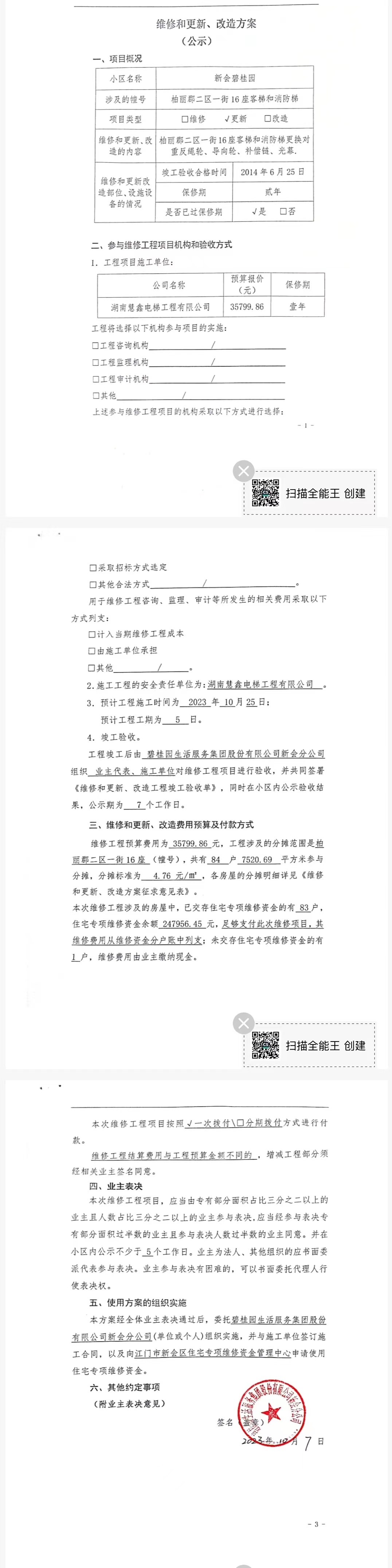 <td VALIGN="top" VALUES="" STYLE="border-width:0" BINDTYPE="0" ROWSPAN="18" COLSPAN="7" DATASOURCE="投票内容" ><font style="font-size:12pt;"><p style="text-align: left; font-family: 宋体; font-size: 16px; line-height: 1.75em;"><strong style="text-align: left; line-height: 1.75em;">一、投票范围</strong><br/></p><p style="white-space: normal; font-family: 宋体; font-size: 16px; line-height: 1.75em; text-indent: 2em;">新会碧桂园柏丽郡二区一街16座</p><p style="white-space: normal; font-family: 宋体; font-size: 16px; line-height: 1.75em; text-indent: 2em;">总人数(专有部分人数之和):82</p><p style="white-space: normal; font-family: 宋体; font-size: 16px; line-height: 1.75em; text-indent: 2em;"><span style="font-family: 宋体; text-indent: 32px;">总户数:84</span></p><p style="white-space: normal; font-family: 宋体; font-size: 16px; line-height: 1.75em; text-indent: 2em;">建筑物总面积(专有部分面积之和):7520.69㎡</p><p style="white-space: normal; font-family: 宋体;font-size: 16px; line-height: 1.75em;"><strong>二、投票起止时间</strong></p><p style="white-space: normal; font-family: 宋体; font-size: 16px; line-height: 1.75em; text-indent: 2em;">投票表决时间:从2023年10月08日到2023年11月07日止</p><p style="white-space: normal; font-family: 宋体; font-size: 16px; line-height: 1.75em; text-indent: 2em;">投票询异公示时间:从2023年11月08日开始</p><p style="white-space: normal; font-family: 宋体; font-size: 16px; line-height: 1.75em; text-indent: 2em;">投票结果通知公告时间:从2023年11月15日开始</p><p style="white-space: normal; font-family: 宋体;font-size: 16px; line-height: 1.75em;"><strong>三、投票详细描述</strong></p><p style="white-space: normal; font-family: 宋体; font-size: 16px; line-height: 1.75em; text-indent: 2em;"><table class="formGrid" width="1387" style="width: 733px;"><tbody><tr class="firstRow"><td colspan="3" style="border-left-style: dotted; border-left-color: rgb(212, 212, 212); border-bottom-color: rgb(212, 212, 212); padding: 0px;"><p>新会碧桂园柏丽郡二区一街16座客梯和消防梯有异响和振动严重,经检查由于反绳轮、导向轮、补偿链、光幕使用时间较长出现油泥、磨损等现象,导致电梯在运行过程中出现异响和振动严重。已过保修期,现申请使用维修资金对新会碧桂园柏丽郡二区一街16座客梯和消防梯反绳轮、导向轮、补偿链、光幕进行维修,工程维修预算约35799.86元,项目最终费用以施工合同签订为准,维修费用的分摊标准按建筑面积分摊,每平方约4.76元,详见公示,如果有业主手机不能正常通过微信投票的,请联系物业公司进行线下纸质投票,物业电话17308202882.</p></td></tr></tbody></table><p><br/></p></p><p style="white-space: normal; font-family: 宋体;font-size: 16px; line-height: 1.75em;"><strong>四、计票规则</strong></p><p style="white-space: normal; font-family: 宋体; font-size: 16px; line-height: 1.75em; text-indent: 2em;"><span style="font-family: 宋体; text-indent: 32px;">表决事项:使用建筑物及其附属设施的维修资金<br /><p style='text-align: left; font-family: 宋体; font-size: 16px; line-height: 1.75em; text-indent: 2em;'>计票规则:弃权票不并入其它项&nbsp;&nbsp;&nbsp;&nbsp;未表决票不并入其它项</p></span></p><p style="white-space: normal; font-family: 宋体;font-size: 16px; line-height: 1.75em;"><strong>五、通过规则</strong></p><p style="white-space: normal; font-family: 宋体; font-size: 16px; line-height: 1.75em; text-indent: 2em;"><span style="font-family: 宋体; text-indent: 32px;">表决事项:使用建筑物及其附属设施的维修资金<br /><p style='text-align: left; font-family: 宋体; font-size: 16px; line-height: 1.75em; text-indent: 2em;'>通过规则:参与表决专有部分面积过半数的业主且参与表决人数过半数的业主同意</p></span><span style="font-family: 宋体; text-indent: 32px;"></span></p><p style="text-align: left; font-family: 宋体; font-size: 16px; line-height: 1.75em;"><strong>六、投票方式</strong></p><p style="text-align: left; font-family: 宋体; font-size: 16px; line-height: 1.75em; text-indent: 2em;"><span style="font-size: 16px; font-family: 宋体">在投票事项通知公告日起,请业主扫描二维码或者关注微信公众号(<strong>江门住建易办事</strong>)查看详细情况并进行投票。</span></p><p style="text-align: center; font-family: 宋体; font-size: 16px; line-height: 1.75em; text-indent: 2em;"><span style="font-size: 16px; font-family: 宋体"><strong style="font-family: 宋体; text-align: center; white-space: normal; line-height: 1.75em;"><img src="http://jmzjj.jiangmen.cn:8071/Areas/Custom/Content/images/jmzjybs.jpg"/></strong></span></p><p style="text-align: right; font-family: 宋体; font-size: 16px; line-height: 1.75em; text-indent: 2em;"><span style="text-align: right;">申报单位(盖章):碧桂园生活服务集团股份有限公司新会分公司</span></p><p style="text-align: right; font-family: 宋体; font-size: 16px; line-height: 1.75em;">2023年10月08日</p></font></td>