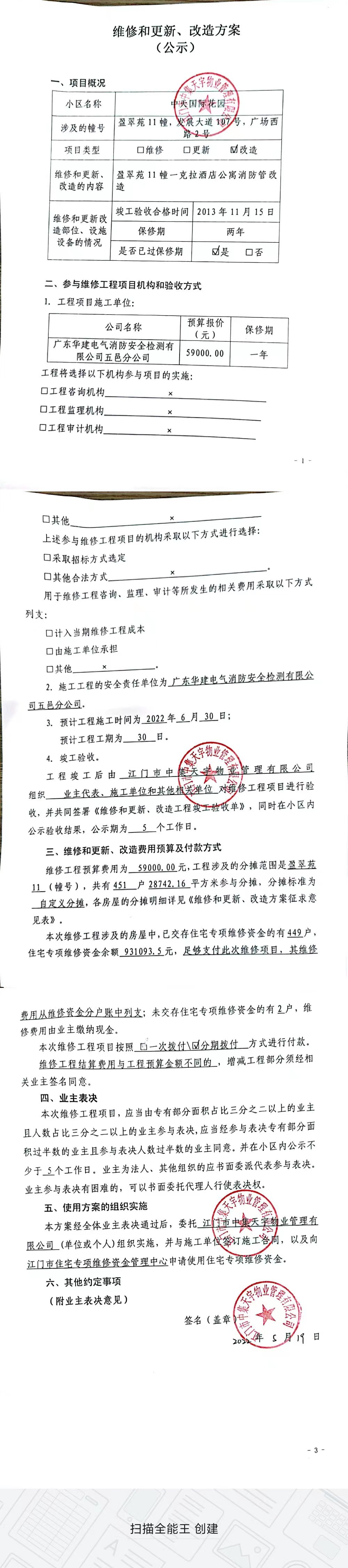 | <p style="text-align: left; font-family: 宋体; font-size: 16px; line-height: 1.75em; text-indent: 0em;">中天国际花园蓬江区发展大道107号、蓬江区广场西路2号、蓬江区中天国际花园盈翠苑11幢全体业主:</p><p style="text-align: left; font-family: 宋体; font-size: 16px; line-height: 1.75em; text-indent: 2em;">本小区关于中天国际盈翠苑11幢一克拉酒店公寓消防管改造工程的投票因部分业主不清楚微信投票流程而延期,延期后投票结束时间由2022年06月20日延至2022年07月11日,由此带来不便,敬请谅解。<br/><br/></p><p style="text-align: left; font-family: 宋体; font-size: 18px; line-height: 1.75em;"><span style="font-size: 16px;"><strong>附件:</strong></span></p><p style="text-align: left; font-family: 宋体; font-size: 16px; line-height: 1.75em;"><br/></p><p style="white-space: normal; font-family: 宋体; font-size: 16px;line-height: 1.75em;"><strong>一、投票范围</strong></p><p style="white-space: normal; font-family: 宋体; font-size: 16px; line-height: 1.75em; text-indent: 2em;">中天国际花园蓬江区发展大道107号、蓬江区广场西路2号、蓬江区中天国际花园盈翠苑11幢</p><p style="white-space: normal; font-family: 宋体; font-size: 16px; line-height: 1.75em; text-indent: 2em;">总人数(专有部分人数之和):288</p><p style="white-space: normal; font-family: 宋体; font-size: 16px; line-height: 1.75em; text-indent: 2em;">建筑物总面积(专有部分面积之和):28742.16㎡</p><p style="white-space: normal; font-family: 宋体;font-size: 16px; line-height: 1.75em;"><strong>二、投票起止时间</strong></p><p dir="ltr" style="white-space: normal; font-family: 宋体; font-size: 16px; line-height: 1.75em; text-indent: 2em;">投票表决时间:从2022年05月20日到2022年07月11日止</p><p dir="ltr" style="white-space: normal; font-family: 宋体; font-size: 16px; line-height: 1.75em; text-indent: 2em;">投票询异公示时间:从2022年07月12日开始</p><p dir="ltr" style="white-space: normal; font-family: 宋体; font-size: 16px; line-height: 1.75em; text-indent: 2em;">投票结果通知公告时间:从2022年07月19日开始<br/></p><p style="white-space: normal; font-family: 宋体; font-size: 16px;line-height: 1.75em;"><strong>三、投票详细描述</strong></p><p style="white-space: normal; font-family: 宋体; font-size: 16px; line-height: 1.75em; text-indent: 2em;"><p style="white-space: normal; text-indent: 2em; line-height: 1.75em;"><span style="font-family: 宋体, SimSun;"><span style="text-decoration-line: underline;">中天国际盈翠苑11幢一克拉酒店公寓消防设备竣工验收于2013年<span style="font-family: 宋体, SimSun; font-size: 16px;">。<span style="font-family: 宋体; line-height: 25px; background-color: rgb(255, 255, 255);">根据《房屋建筑工程质量保修办法》保修</span></span></span><span style="font-family: 宋体, SimSun; font-size: 16px;"><span style="font-family: 宋体; line-height: 25px; background-color: rgb(255, 255, 255);">期是2年。靠近07房消火栓立管从2019年至2021年期间已进行了两次维修,由于消防立管是经过07房卫生间沉池,长年累月的湿气导致立管老化生锈漏水,每次维修费用高达9800元。现发现9楼立管又出现类似情况,根据原来的维修方案治标不治本。为彻底解决此问题,物业公司邀请专业的消防公司到现场查看,原消防管位置改造已达不到理想效果,经消防公司专业建议在1楼到25楼消防楼梯处开凿放管进水井房,消火栓将暗藏在水井房墙壁处。经三方消防公司报价(详见公示),最终选定由广东华建电气消防安全检测有限公司五邑分公司作为本工程施工方,消防管改造工程费用共计59000元。</span></span></span></p><p style="white-space: normal; text-indent: 2em; line-height: 1.75em;"><span style="font-family: 宋体, SimSun;">现需申请使用维修资金对一克拉酒店公寓消防管进行改造,工程维修预算金额为59000元,项目最终费用以施工合同签订金额为准。维修费用的分摊标准为按户分摊,每户平均分摊金额为130.82元,没有交存维修资金的需交现金,详见公示附件。</span></p><p style="white-space: normal; text-indent: 2em; line-height: 1.75em;"><span style="line-height: 25px; font-family: 宋体, SimSun; font-size: 16px; background-color: rgb(255, 255, 255);">本次投票以微信电子投票为主,书面表决投票、短信投票作补充投票的方式,同一户出现微信电子投票和书面表决投票、短信投票同时存在情况的,以该住户的微信电子投票为准计入表决统计数。如业主手机不能正常通过微信投票,请联系物业公司进行线下纸质或者短信投票,电话18933187813。</span></p><p><br/></p></p><p style="white-space: normal; font-family: 宋体;font-size: 16px; line-height: 1.75em;"><strong>四、计票规则</strong></p><p style="white-space: normal; font-family: 宋体; font-size: 16px; line-height: 1.75em; text-indent: 2em;">表决事项:使用建筑物及其附属设施的维修资金<br /><p style='text-align: left; font-family: 宋体; font-size: 16px; line-height: 1.75em; text-indent: 2em;'>计票规则:弃权票不并入其它项&nbsp;&nbsp;&nbsp;&nbsp;未表决票不并入其它项</p></p><p style="white-space: normal; font-family: 宋体;font-size: 16px; line-height: 1.75em;"><strong>五、通过规则</strong></p><p style="white-space: normal; font-family: 宋体; font-size: 16px; line-height: 1.75em; text-indent: 2em;"><span style="font-family: 宋体; text-indent: 32px;">表决事项:使用建筑物及其附属设施的维修资金<br /><p style='text-align: left; font-family: 宋体; font-size: 16px; line-height: 1.75em; text-indent: 2em;'>通过规则:参与表决专有部分面积过半数的业主且参与表决人数过半数的业主同意</p></span></p><p style="te