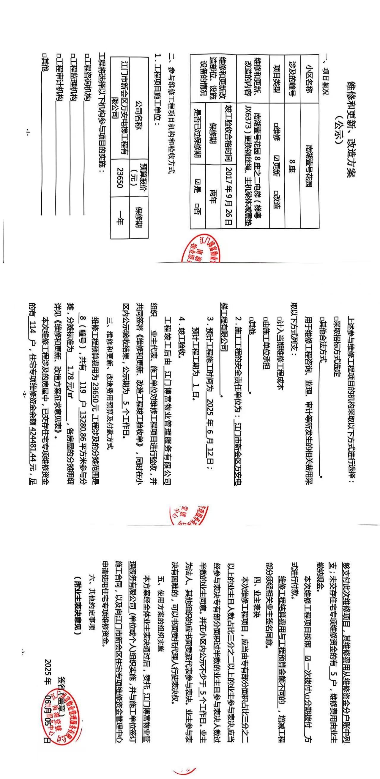 <td VALIGN="top" VALUES="" STYLE="border-width:0" BINDTYPE="0" ROWSPAN="17" COLSPAN="7" DATASOURCE="投票结果" ><font style=" font-family:方正小标宋简体;font-size:14pt;"><p style="line-height: 1.75em;"><span style="font-family: 宋体, SimSun;">各位尊敬的业主:</span><br/></p><p style="text-indent: 2em; line-height: 1.75em;"><span style="font-family: 宋体, SimSun;">根据法律法规的规定,本小区业主利用“江门市物业事项表决管理系统”已对本小区公共事务决策事项(<span style="font-family: 宋体; text-indent: 32px;">南湖壹号花园8座之二电梯(梯粤JX6373)更换钢丝绳、主机梁体减震垫使用维修资金的投票</span>)进行了表决,在经过7日的询异公示期后,未收到业主有效的异议。现将投票结果公告,并就产生的法律效力说明如下:</span></p><p style="line-height: 1.75em; text-indent: 0em;"><strong style="text-indent: 2em;"><span style="font-family: 宋体, SimSun;">一、投票范围</span></strong></p><p style="text-indent: 2em; line-height: 1.75em;"><span style="font-family: 宋体, SimSun;">南湖壹号花园南湖壹号花园8座</span></p><p style="text-indent: 2em; line-height: 1.75em;"><span style="font-family: 宋体, SimSun;">总人数(专有部分人数之和):119</span></p><p style="text-indent: 2em; line-height: 1.75em;"><span style="font-family: 宋体, SimSun;"><span style="font-family: 宋体, SimSun; text-indent: 32px;"><span style="font-family: 宋体; text-indent: 32px;"><span style="font-family: 宋体; text-indent: 32px;">总户数:119</span></span></span></span></p><p style="text-indent: 2em; line-height: 1.75em;"><span style="font-family: 宋体, SimSun;">建筑物总面积(专有部分面积之和):13280.86㎡</span></p><p style="line-height: 1.75em;"><strong><span style="font-family: 宋体, SimSun;">二、投票结果公告时间</span></strong></p><p style="text-indent: 2em; line-height: 1.75em;"><span style="font-family: 宋体, SimSun;"><span style="font-family: 宋体, SimSun; text-indent: 32px;">从2025年06月17日开始</span></span></p><p style="line-height: 1.75em;"><strong><span style="font-family: 宋体, SimSun;">三、计票规则</span></strong></p><p style="text-indent: 2em; line-height: 1.75em;"><span style="font-family: 宋体, SimSun;">表决事项:使用建筑物及其附属设施的维修资金<br /><p style='font-family: 宋体, SimSun;line-height: 1.75em; text-indent: 2em;'>计票规则:弃权票不并入其它项&nbsp;&nbsp;&nbsp;&nbsp;未表决票不并入其它项</p></span></p><p style="line-height: 1.75em;"><strong><span style="font-family: 宋体, SimSun;">四、通过规则</span></strong></p><p style="line-height: 1.75em;"><strong><span style="font-family: 宋体, SimSun;">&nbsp; 根据《中华人民共和国民法典》第二百七十八条规定:业主共同决定事项,应当由专有部分面积占比三分之二以上的业主且人数占比三分之二以上的业主参与表决。</span></strong></p><p style="text-indent: 2em; line-height: 1.75em;"><span style="font-family: 宋体, SimSun;"><span style="font-family: 宋体, SimSun; text-indent: 32px;">表决事项:使用建筑物及其附属设施的维修资金<br /><p style='font-family: 宋体, SimSun;line-height: 1.75em; text-indent: 2em;'>通过规则:双2/3以上参与表决,参与表决双过半同意</p></span></span></p><p style="line-height: 1.75em;"><strong><span style="font-family: 宋体, SimSun;">五、投票结果</span></strong></p><p style="line-height: 1.75em; text-indent: 2em;"><span style="font-family: 宋体, SimSun; text-indent: 2em;"><div id='resultTable'><table style='table-layout: fixed; font-size:12px; margin-top:10px' width='100%' border='0' cellspacing='0' cellpadding='0'><tr><td height='28' colspan='10' align='center' style='border: 1px solid #666'><strong style='font-size: 14px;'> 使用建筑物及其附属设施的维修资金</strong></td> </tr><tr id='trfirst'><td height='28' colspan='4' style='border-left: 1px solid #666; border-bottom: 1px solid #666'><strong>&nbsp;申报单位:</strong> 江门博富物业管理服务有限公司</td><td colspan='3' style='border-left: 1px solid #666; border-bottom: 1px solid #666'><strong>&nbsp;联系方式:</strong> 3666779 </td><td colspan='3' style='border-left: 1px solid #666; border-bottom: 1px solid #666; border-right: 1px solid #666'><strong>&nbsp;申报日期:</strong> 2025年6月6日 </td></tr><tr> <td height='28' colspan='5' style='border-left: 1px solid #666; border-bottom: 1px solid #666'><strong>&nbsp;列支总人数(专有部分人数之和):</strong>119人 </td><td colspan='5' style='border-left: 1px solid #666; border-bottom: 1px solid #666; border-right: 1px solid #666'><strong>&nbsp;列支建筑物总面积(专有部分面积之和):</strong>13280.86㎡ </td> </tr><tr><td height='28' colspan='10' bgcolor='#F3F3F3' style='border-left: 1px solid #666;border-bottom: 1px solid #666;border-right: 1px solid #666'><strong>&nbsp;参与表决人数及面积统计</strong></td></tr><tr><td height='28' colspan='5' style='border-left: 1px solid #666; border-bottom: 1px solid #666'><strong>&nbsp;参与表决人数:</strong>84人</td><td colspan='5' style='border-left: 1px solid #666; border-bottom: 1px solid #666; border-right: 1px solid #666'><strong>&nbsp;参与表决人数占总人数比例:</strong>70.59%</td></tr><tr><td height='28' colspan='5' style='border-left: 1px solid #666; border-bottom: 1px solid #666'><strong>&nbsp;参与表决面积:</strong>9349.97㎡</td><td colspan='5' style='border-left: 1px solid #666; border-bottom: 1px solid #666; border-right: 1px solid #666'><strong>&nbsp;参与表决面积占总面积比例:</strong>70.40%</td></tr><tr><td height='28' colspan='10' bgcolor='#F3F3F3' style='border-left: 1px solid #666; border-bottom: 1px solid #666;border-right: 1px solid #666'> <strong>&nbsp;参与表决同意人数及面积统计</strong></td> </tr><tr><td height='28' colsp