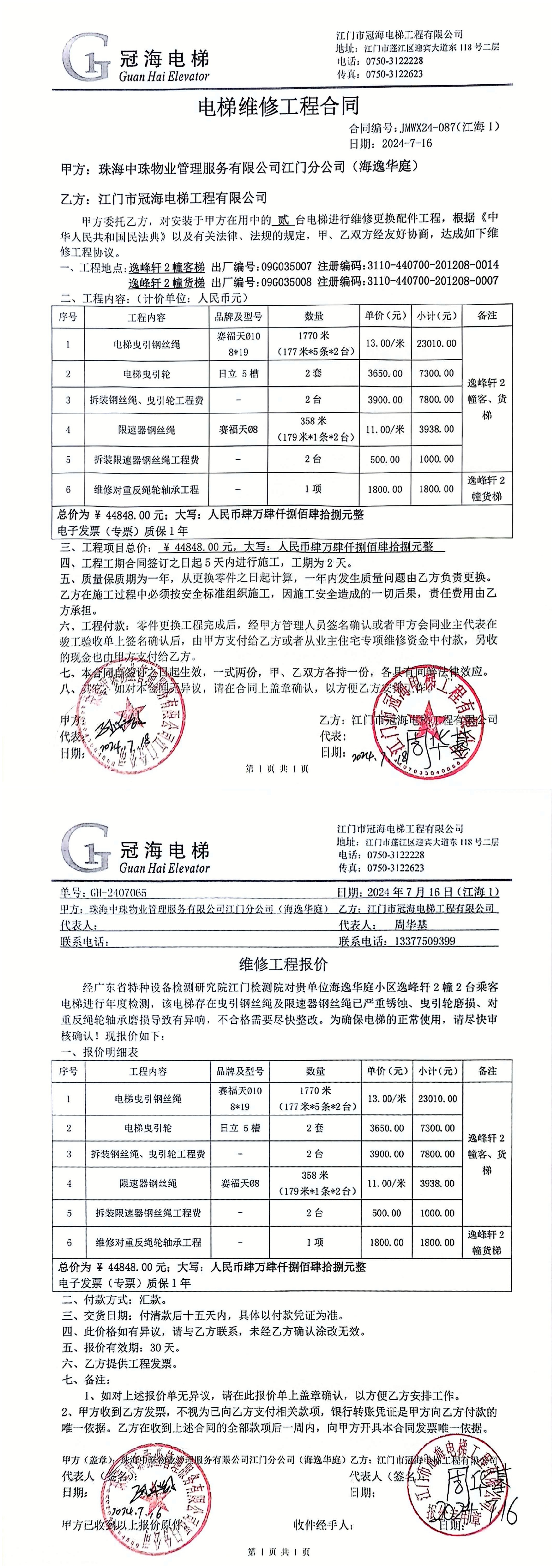 <td VALIGN="top" VALUES="" STYLE="border-width:0" BINDTYPE="0" ROWSPAN="19" COLSPAN="7" DATASOURCE="投票结果" ><font style="font-size:14pt;"><p style="white-space: normal; font-family: 宋体; line-height: 1.75em;">海逸华庭江海区海逸华庭逸峰轩2幢全体业主:</p><p style="white-space: normal; font-family: 宋体; line-height: 1.75em; text-indent: 2em;">本小区关于江门海逸华庭逸峰轩2栋货梯客梯更换曳引钢丝绳、曳引轮、限速器钢丝绳,货梯更换对重反绳轮轴承使用维修资金的投票的投票已表决结束,询异时间从2024年09月19日开始,投票询异公示期间,业主可通过微信查询自己的表决情况或可凭身份证件申请查询自己的表决情况;如公示的业主表决情况与查询的本人表决意见不一致的,可以以书面形式向投票组织机构申诉,投票组织机构予以纠正并重新公示表决结果。异议提出人对投票组织机构的处理仍有异议的,可以向街道办事处(镇人民政府)反映处理,涉及住宅专项维修资金的,可向属地住宅专项维修资金管理中心反映处理。</p><p style="white-space: normal;"><br/></p><p style="white-space: normal; font-family: 宋体; line-height: 1.75em;"><strong>附件:</strong></p><p style="white-space: normal; font-family: 宋体; line-height: 1.75em;"><strong>一、投票范围</strong></p><p style="white-space: normal; font-family: 宋体; line-height: 1.75em; text-indent: 2em;">海逸华庭江海区海逸华庭逸峰轩2幢</p><p style="white-space: normal; font-family: 宋体; line-height: 1.75em; text-indent: 2em;">总人数(专有部分人数之和):87</p><p style="white-space: normal; font-family: 宋体; line-height: 1.75em; text-indent: 2em;"><span style="font-family: 宋体, SimSun;"><span style="font-family: 宋体; text-indent: 32px;"><span style="font-family: 宋体; text-indent: 32px;">总户数:89</span></span></span></p><p style="white-space: normal; font-family: 宋体; line-height: 1.75em; text-indent: 2em;">建筑物总面积(专有部分面积之和):9401.55㎡</p><p style="white-space: normal; font-family: 宋体; line-height: 1.75em;"><strong>二、询异公示起止时间</strong></p><p dir="ltr" style="white-space: normal; font-family: 宋体; line-height: 1.75em; text-indent: 2em;"><span style="text-indent: 36px;">2024年09月19日至2024年09月25日</span></p><p style="white-space: normal; font-family: 宋体; line-height: 1.75em;"><strong>三、投票详细描述</strong></p><p style="white-space: normal; font-family: 宋体; line-height: 1.75em; text-indent: 2em;"><p style="font-family: "Helvetica Neue", Helvetica, Arial, sans-serif; font-size: 14px; text-wrap: wrap; background-color: rgb(255, 255, 255);">本小区江门海逸华庭2024年7月11日,经广东省特种设备检测研究院江门检测院对逸峰轩2幢2台乘客电梯进行年度检测,曳引钢丝绳及限速器钢丝绳已严重锈蚀、曳引轮磨损导致磨擦力不足、对重反绳轮轴承磨损导致有异响,检测结果为不合格。此问题会出现电梯运行不平层、振动、异响、 打滑故障,如果不及时更换会造成电梯钢丝绳断股或断丝,需对该栋电梯货梯客梯更换曳引钢丝绳、曳引轮、限速器钢丝绳,货梯更换对重反绳轮轴承方能恢复电梯安全运行。</p><p style="font-family: "Helvetica Neue", Helvetica, Arial, sans-serif; font-size: 14px; text-wrap: wrap; background-color: rgb(255, 255, 255);"> 现需申请使用维修资金对海逸华庭逸峰轩2栋的货梯客梯维修,工程维修预算金额为44848.00元,项目最终费用以施工合同签订金额为准,因已过保修期,维修费用由相关业主按建筑面积分摊,每平方约:4.77元,详见公示附件。如业主手机不能通过正常的微信投票,请联系物业服务中心进行线下或短信投票,物业服务中心电话:0750-3776333。</p><p><br/></p></p><p style="white-space: normal; font-family: 宋体; line-height: 1.75em;"><strong>四、计票规则</strong></p><p style="white-space: normal; font-family: 宋体; line-height: 1.75em; text-indent: 2em;">表决事项:使用建筑物及其附属设施的维修资金<br /><p style='text-align: left; font-family: 宋体; font-size: 16px; line-height: 1.75em; text-indent: 2em;'>计票规则:弃权票不并入其它项 未表决票不并入其它项</p></p><p style="white-space: normal; font-family: 宋体; line-height: 1.75em;"><strong>五、通过规则</strong></p><p style="white-space: normal; font-family: 宋体; line-height: 1.75em;"><strong><strong style="white-space: normal;"><span style="font-family: 宋体, SimSun;"> 根据《中华人民共和国民法典》第二百七十八条规定:业主共同决定事项,应当由专有部分面积占比三分之二以上的业主且人数占比三分之二以上的业主参与表决。</span></strong></strong></p><p style="white-space: normal; font-family: 宋体; line-height: 1.75em; text-indent: 2em;">表决事项:使用建筑物及其附属设施的维修资金<br /><p style='text-align: left; font-family: 宋体; font-size: 16px; line-height: 1.75em; text-indent: 2em;'>通过规则:双2/3以上参与表决,参与表决双过半同意</p></p><p style="white-space: normal; font-family: 宋体; line-height: 1.75em;"><strong>六、投票结果</strong></p><p style="white-space: normal; font-family: 宋体; line-height: 1.75em; text-indent: 2em;"><div id='resultTable'><table style='table-layout: fixed; font-size:12px; margin-top:10px' width='100%' border='0' cellspacing='0' cellpadding='0'><tr><td height='28' colspan='10' align='center' style='border: 1px solid #666'><strong style='font-size: 14px;'> 使用建筑物及其附属设施的维修资金</strong></td> </tr><tr id='trfirst'><td height='28' colspan='4' style='border-left: 1px solid #666; border-bottom: 1px solid #666'><strong> 申报单位:</strong> 珠海中珠物业管理服务有限公司江门分公司